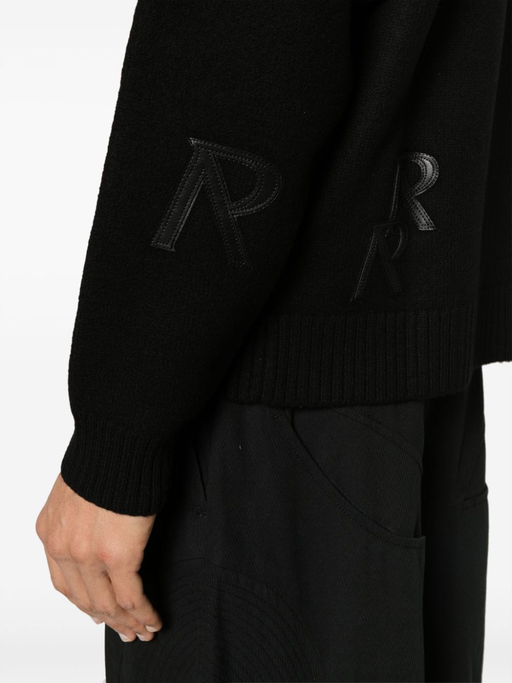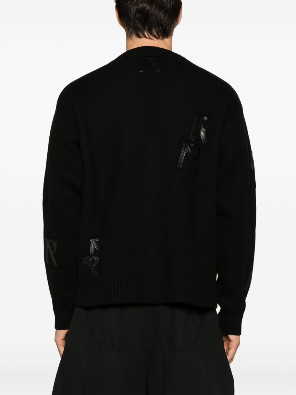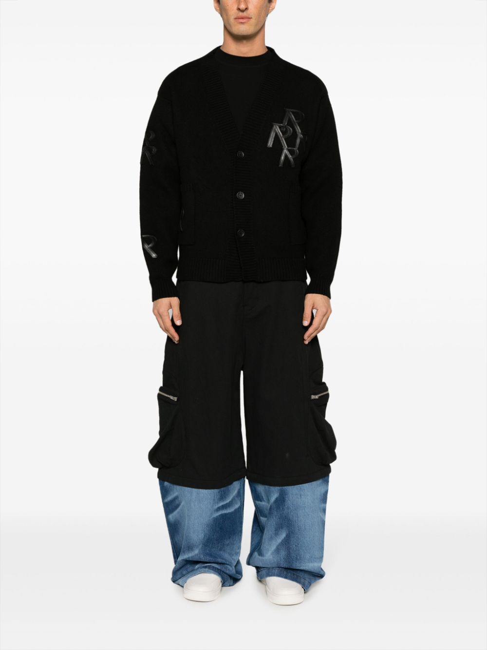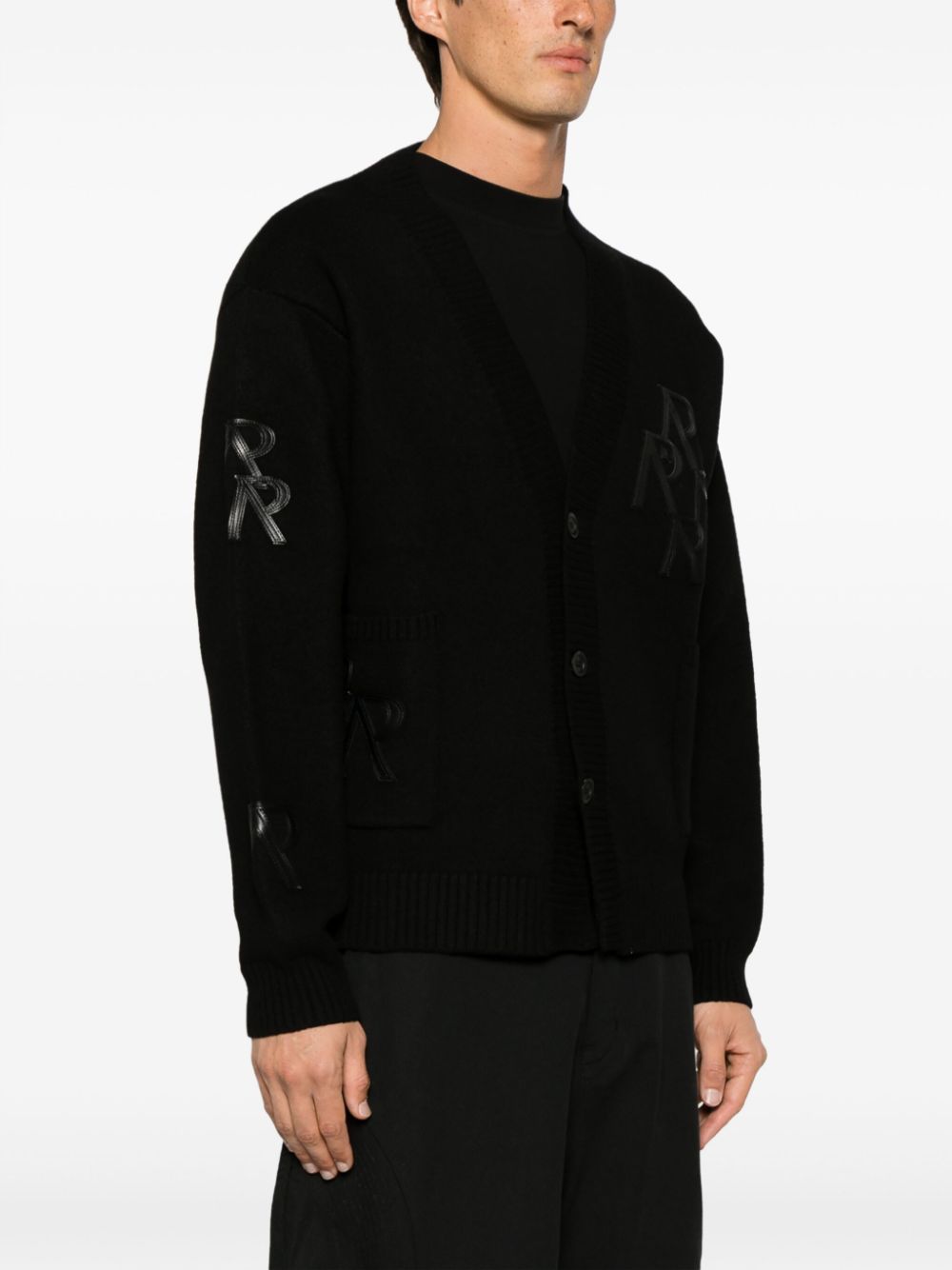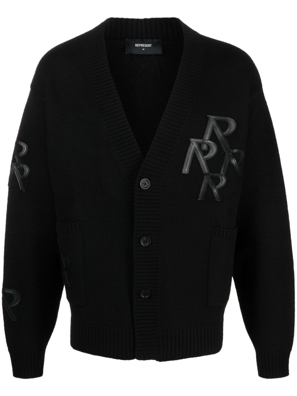 Black Represent cardigan, V-neck, button closure, leather logo applied all over.
