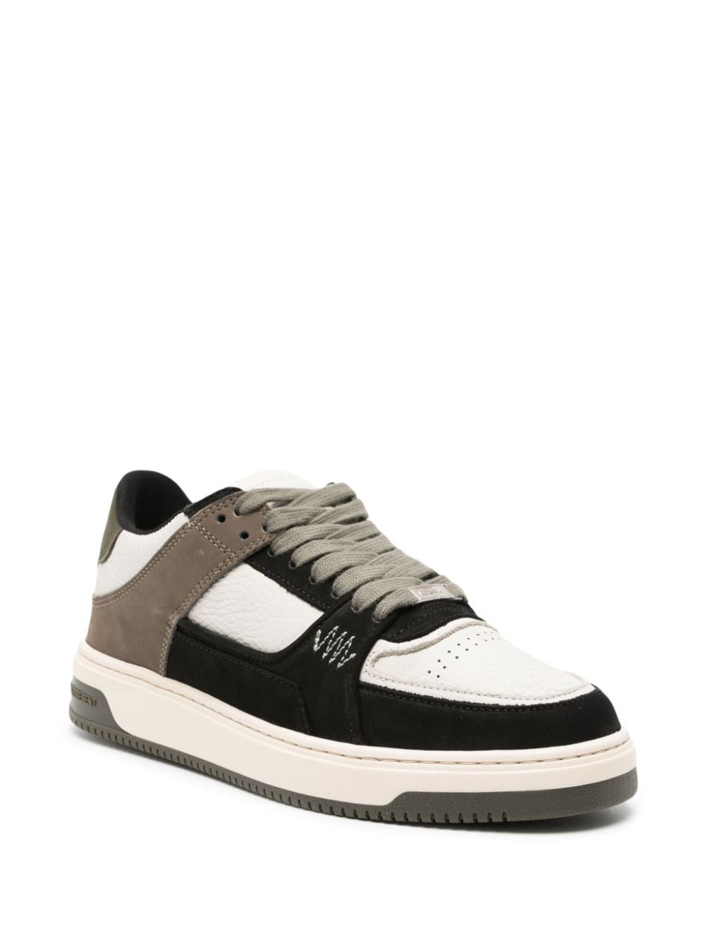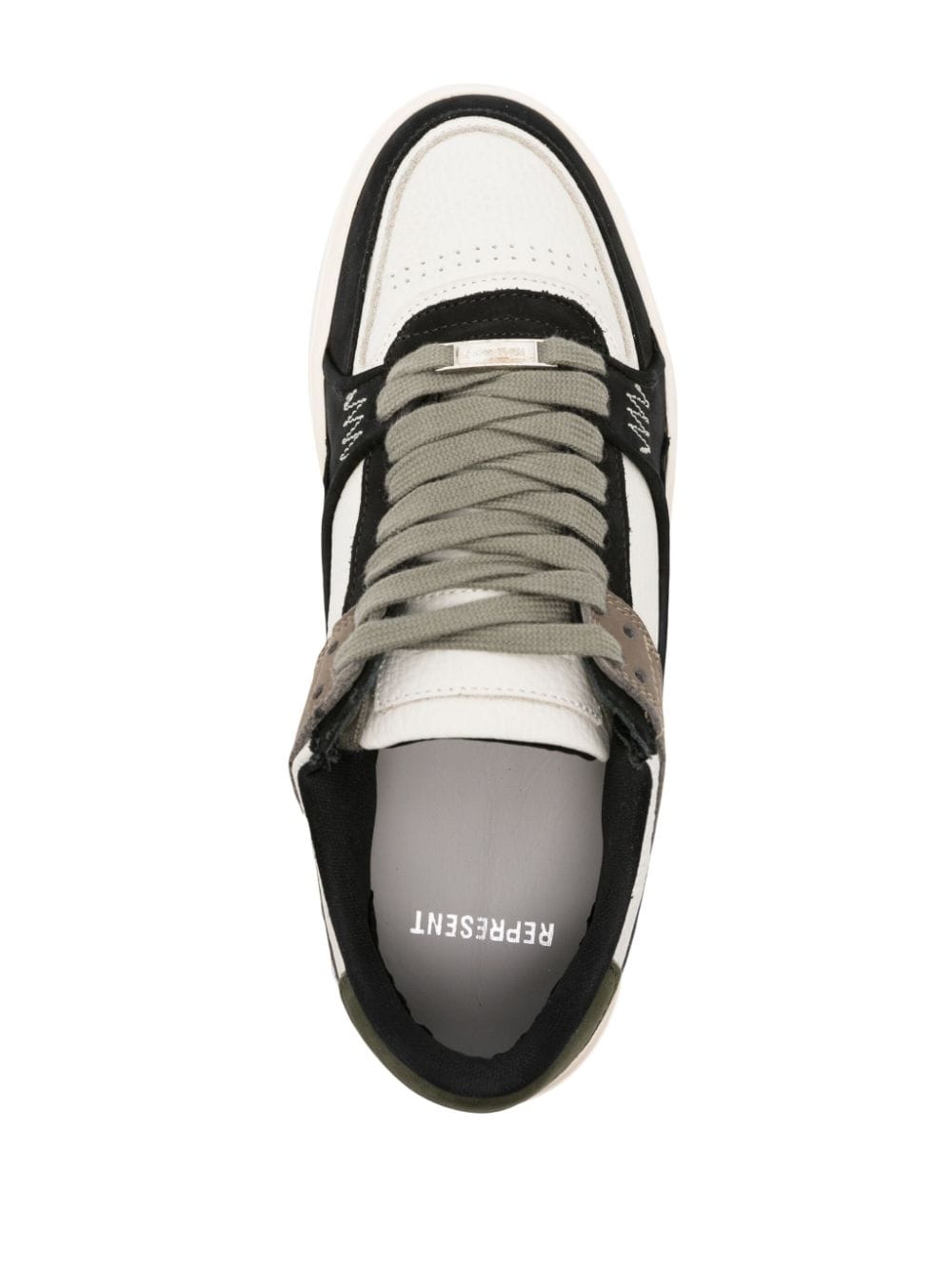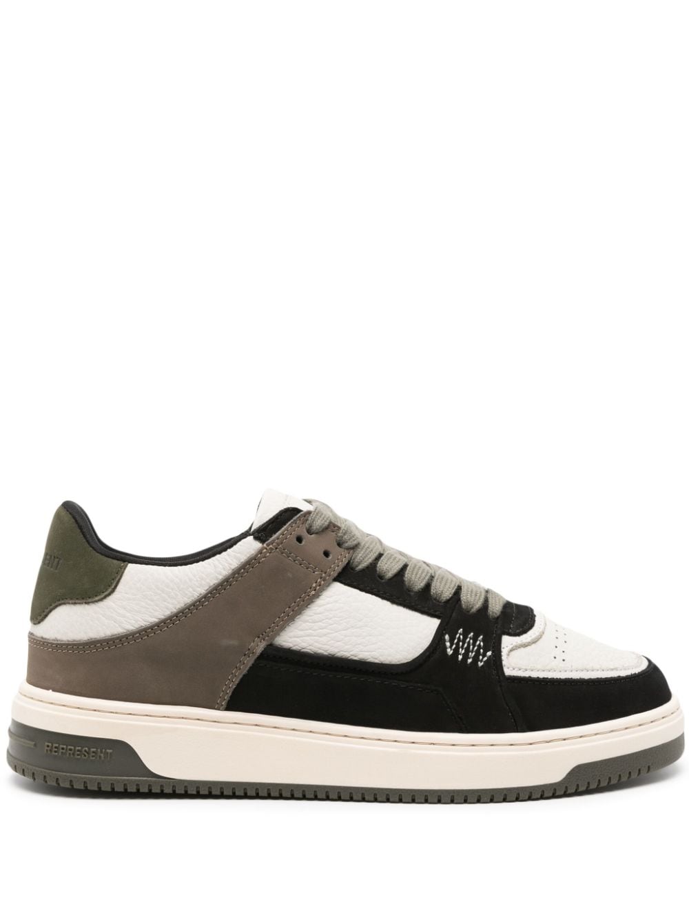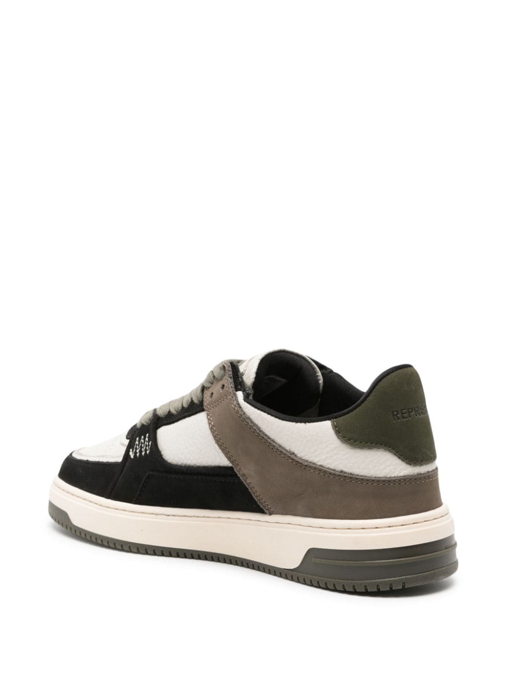 Represent sneaker, Apex model, in black and olive green calfskin, inserts design, front closure with laces, perforated toe, logo on the heel, flat rubber sole.