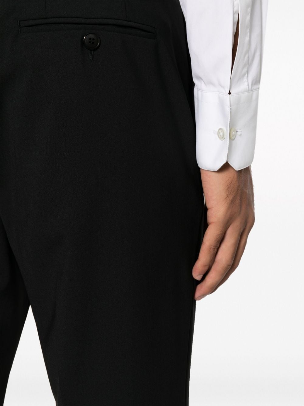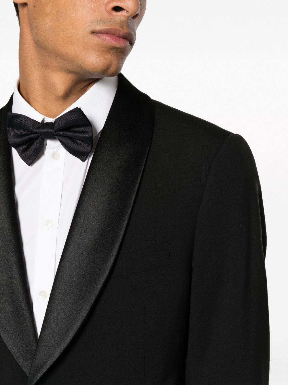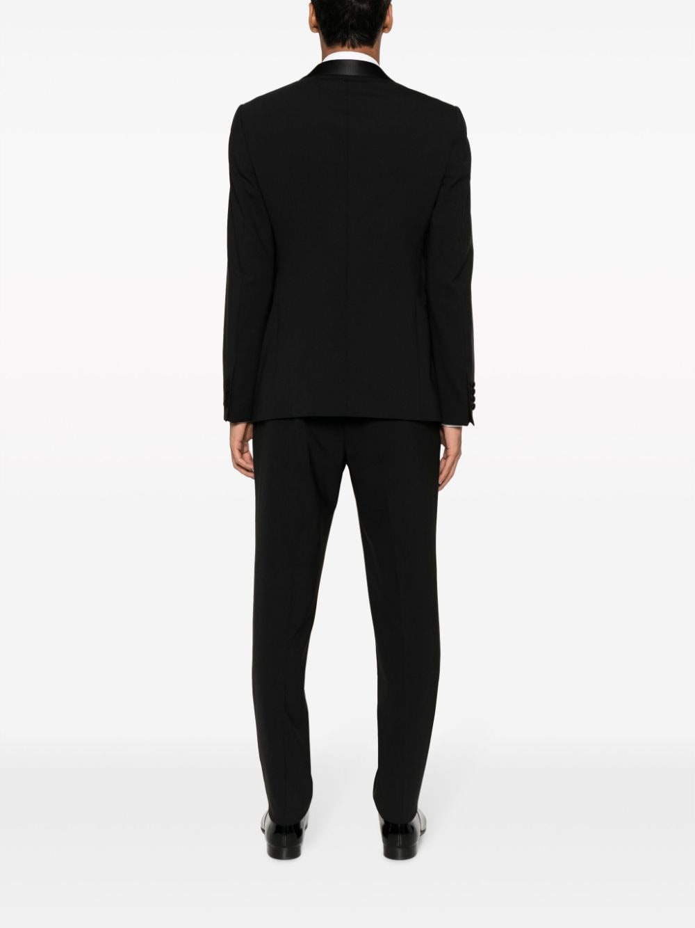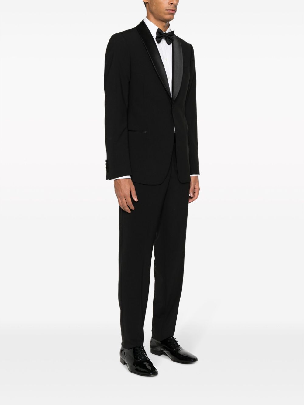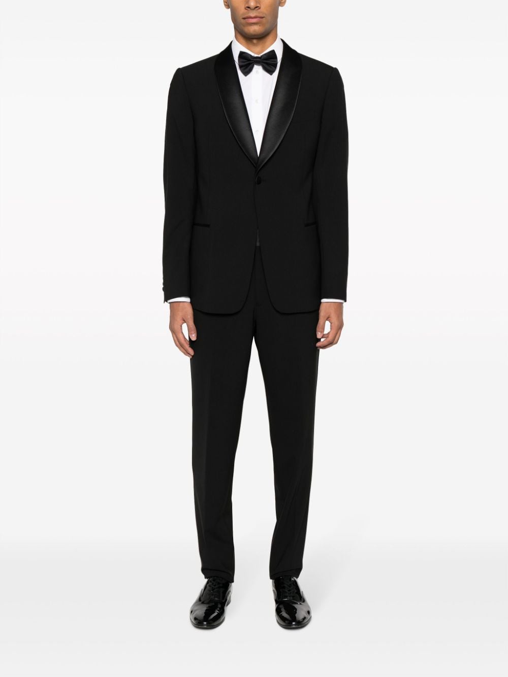 Emporio Armani black tuxedo, single-breasted jacket with silk shawl lapels, button closure, pockets and welt pocket, slim-cut trousers with satin bustier, hidden closure, side pockets and two back welt pockets.