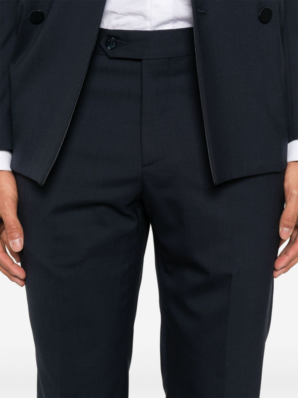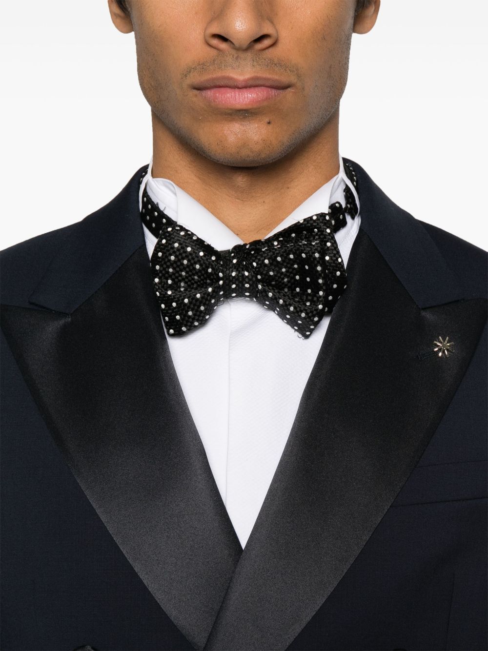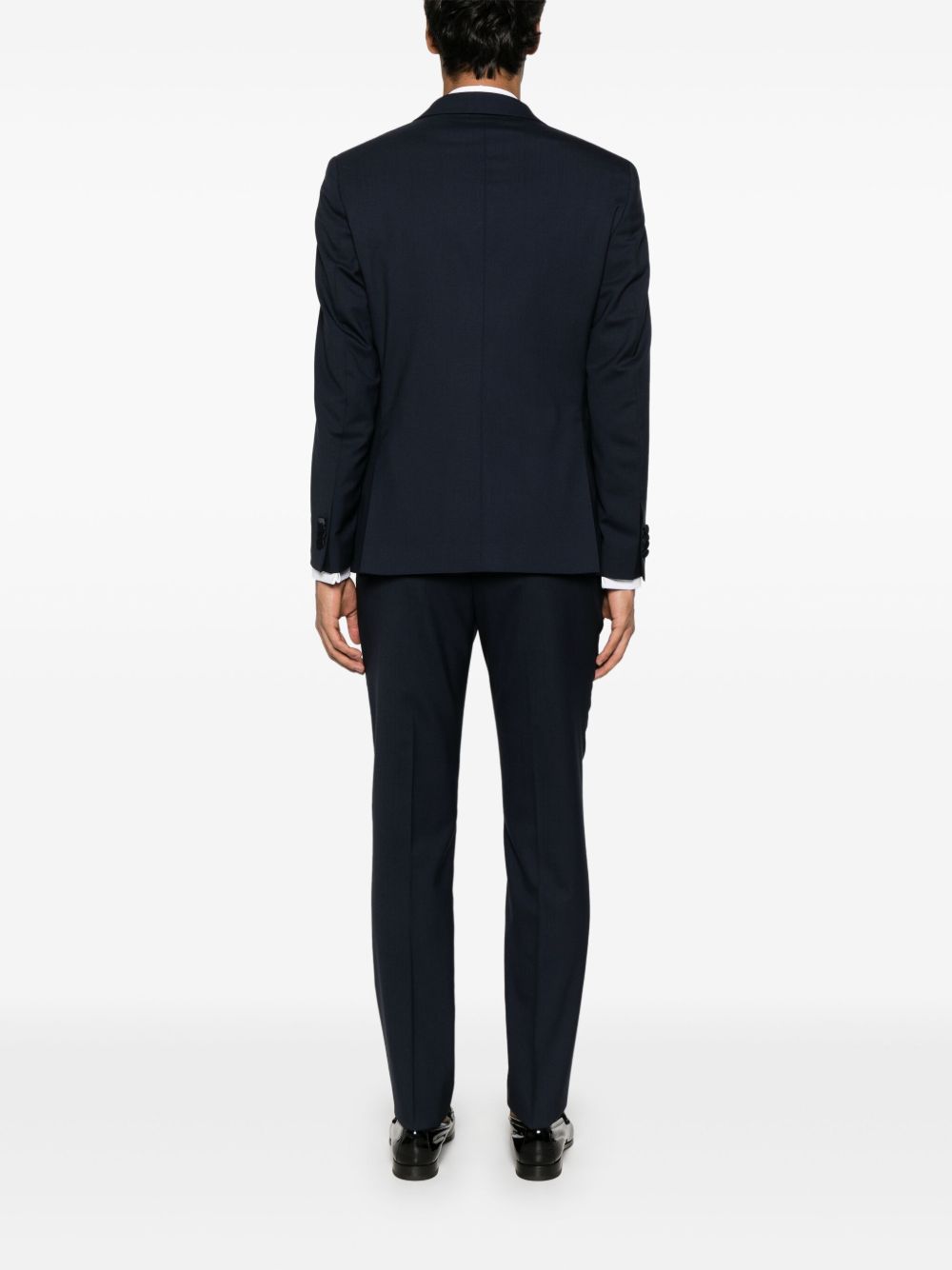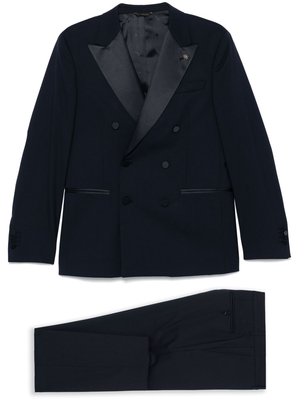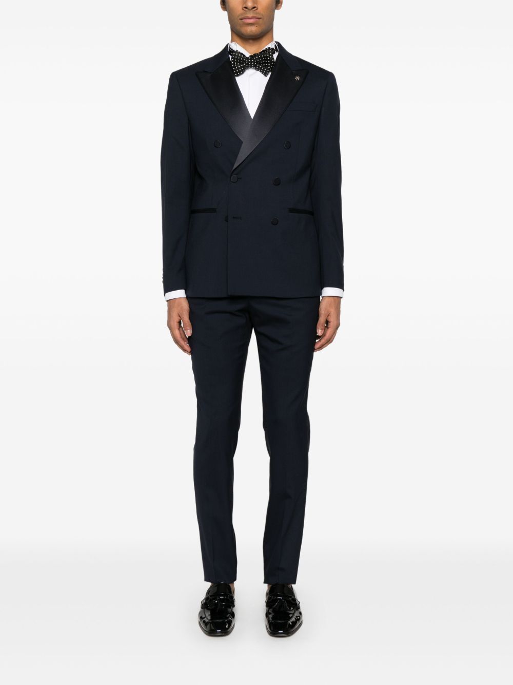 Manuel Ritz navy blue tuxedo, double-breasted jacket with satin lapels and welt pockets, trousers with hidden fastening, two side pockets, back pockets, slim fit.