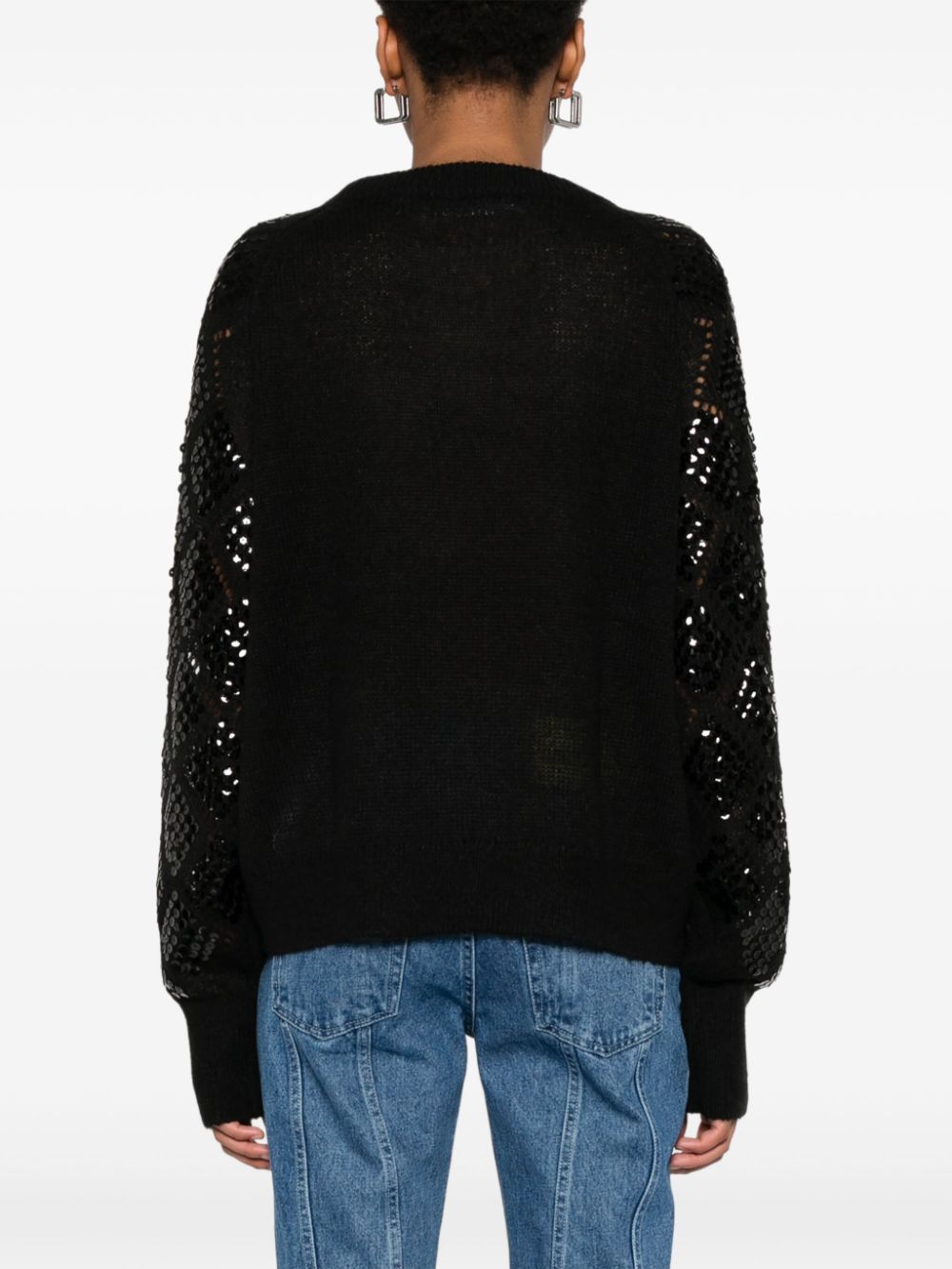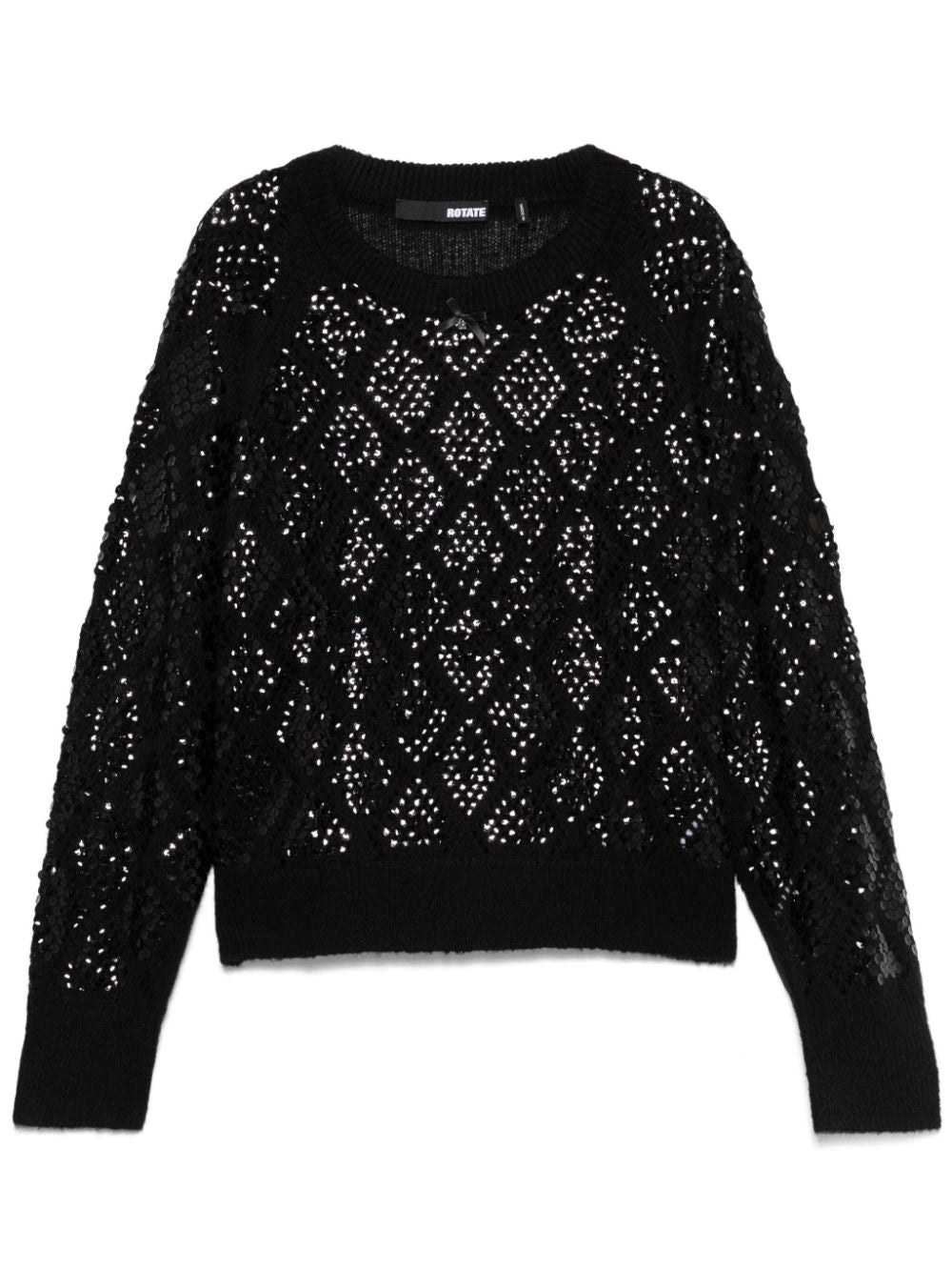 Black sequin sweater by Rotate in black, crew neck, long raglan sleeves, ribbed hem and cuffs.Composition: 100% polyethylene terephthalate (PET), 72% polyacrylic, 18% wool, 10% polyamide