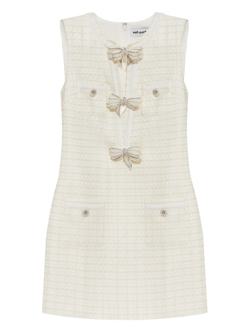 Short bouclé dress by Ermanno Scervino in white, back zip fastening, four front patch pockets, crew neck, sleeveless Composition: Acrylic 63%, Polyester 17%, Wool 14%, Polyamide 5%, Metallic fibres 1%
