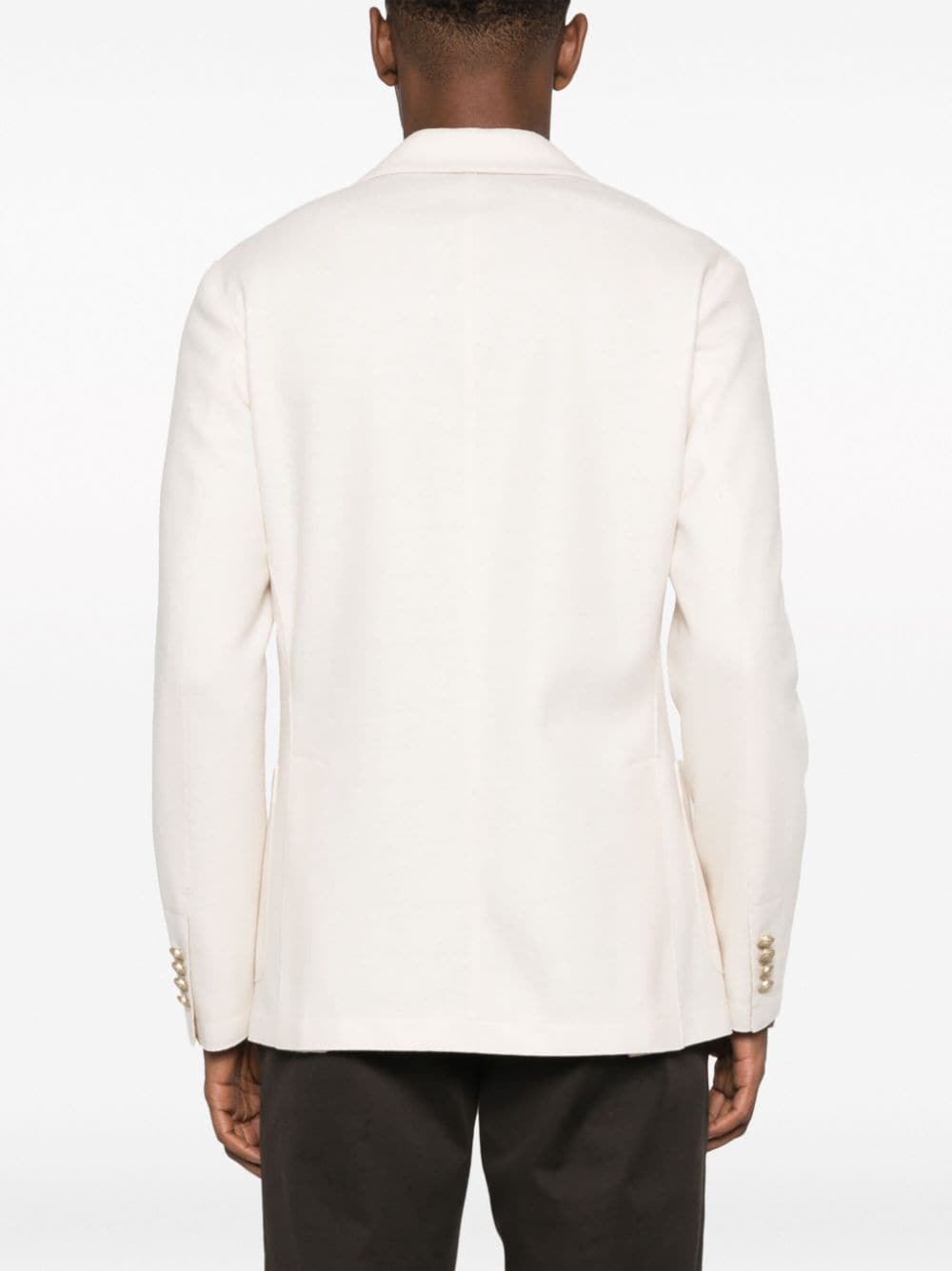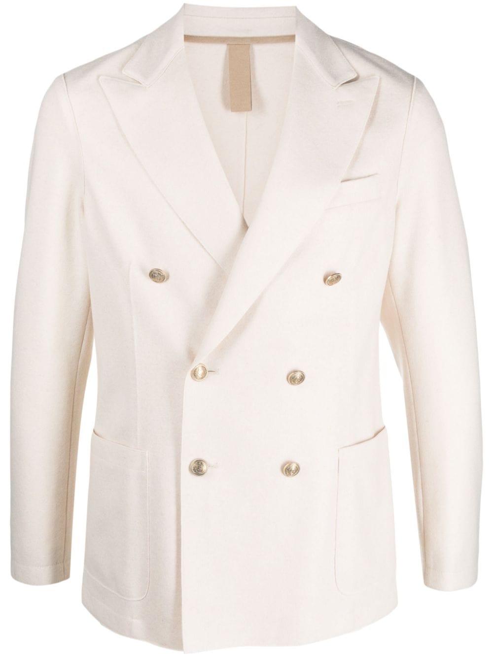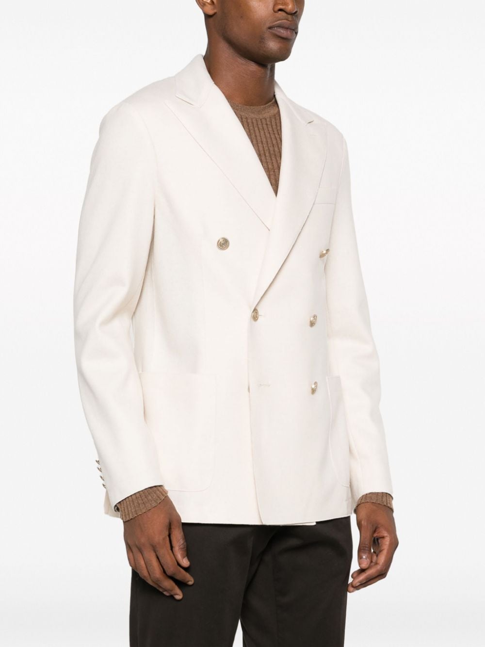 Cream Eleventy blazer, double-breasted closure with gold buttons, peak lapels, breast pocket, patch pockets.