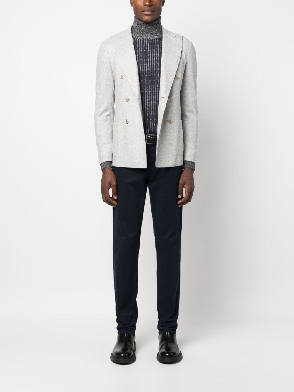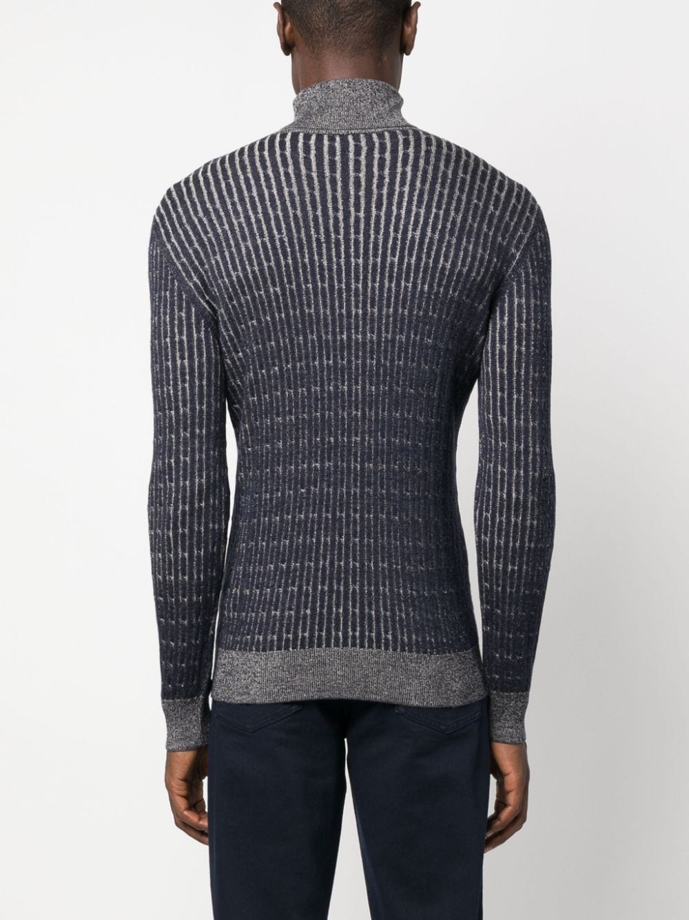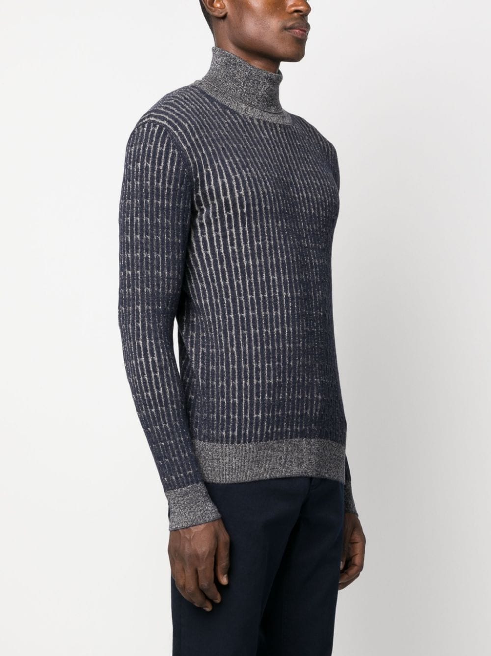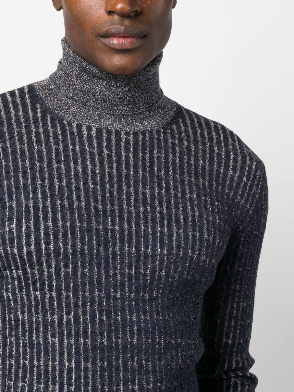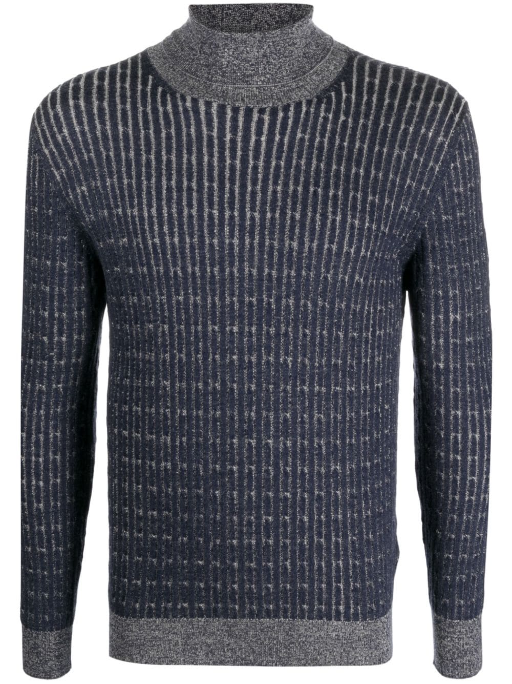 Eleventy sweater with cable knit, blue and gray, high neck, ribbed cuffs and hem.
