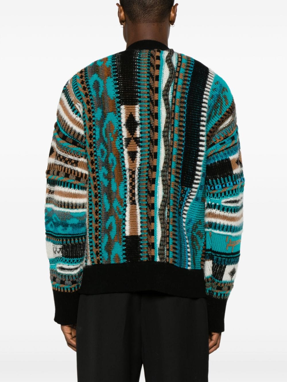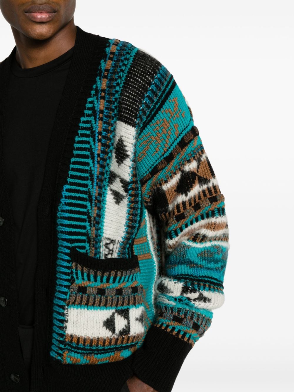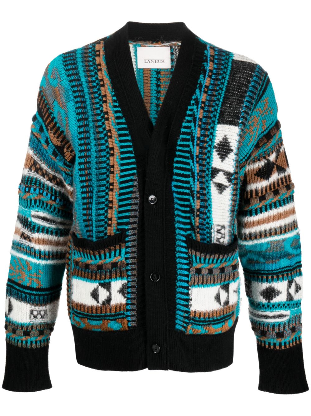 Laneus green cardigan, multicolor pattern with inlay design, V-neck with button closure, two patch pockets, elasticated bottom.