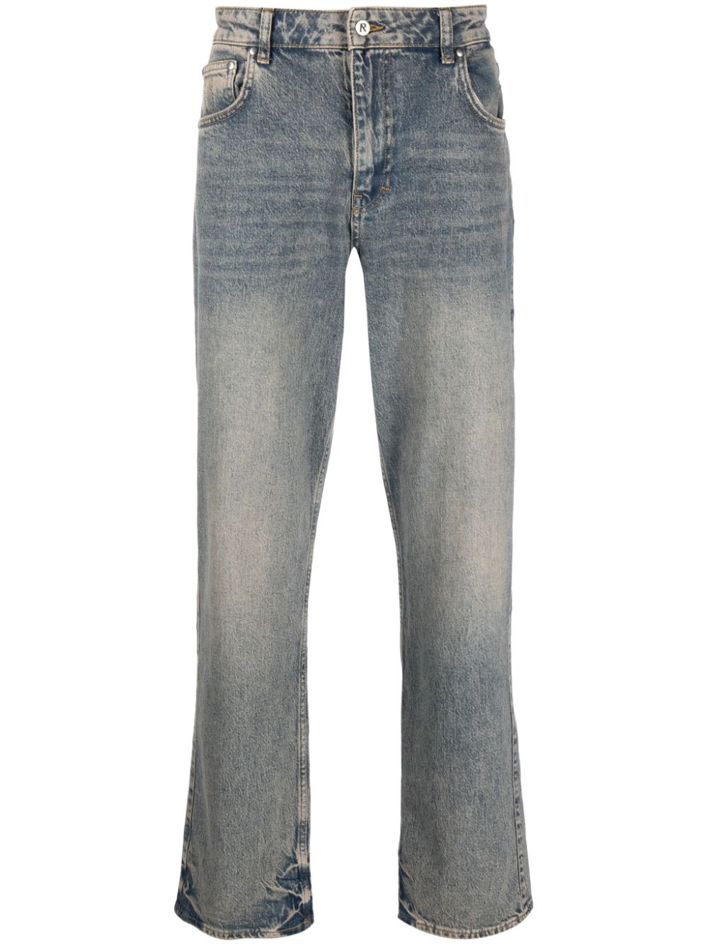 Represent cream blue jeans, faded effect, five-pocket model with button and hidden zip, straight cut.