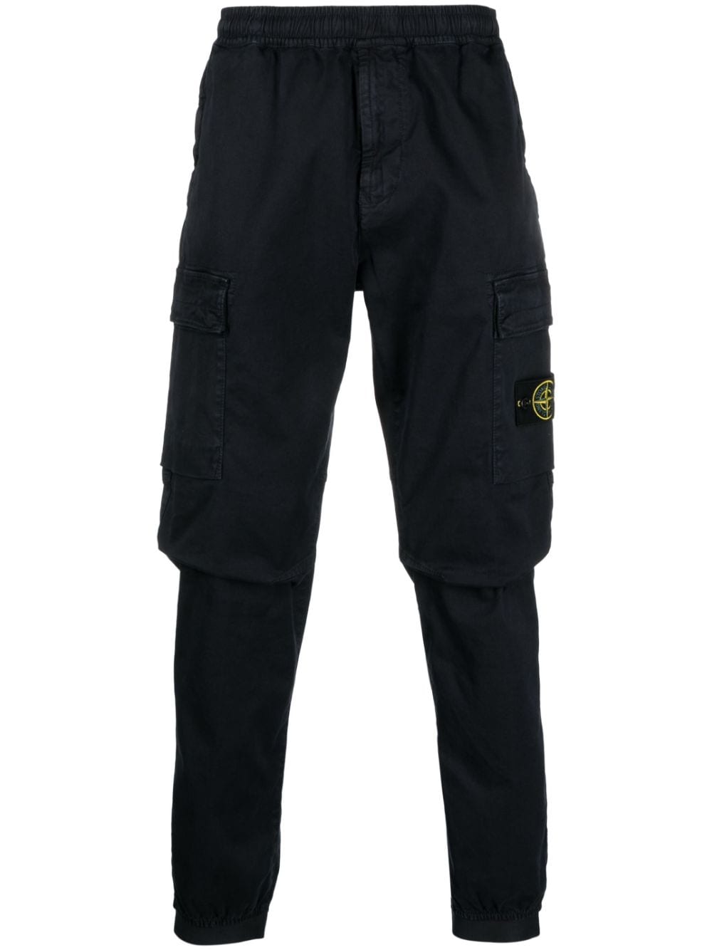 Blue Stone Island trousers, five-pocket cargo model, with Compass application on the leg.