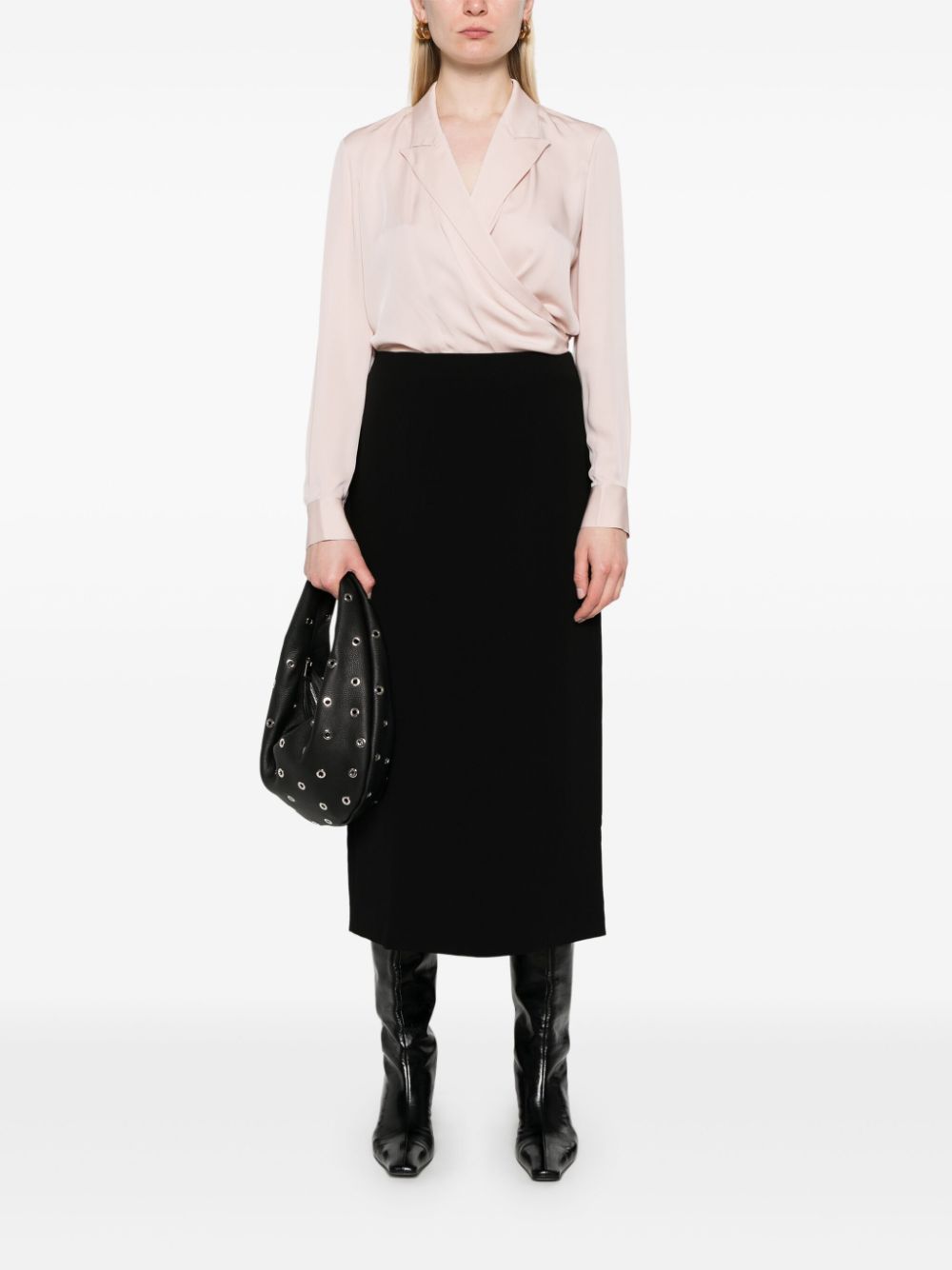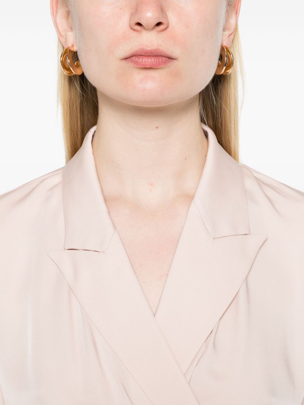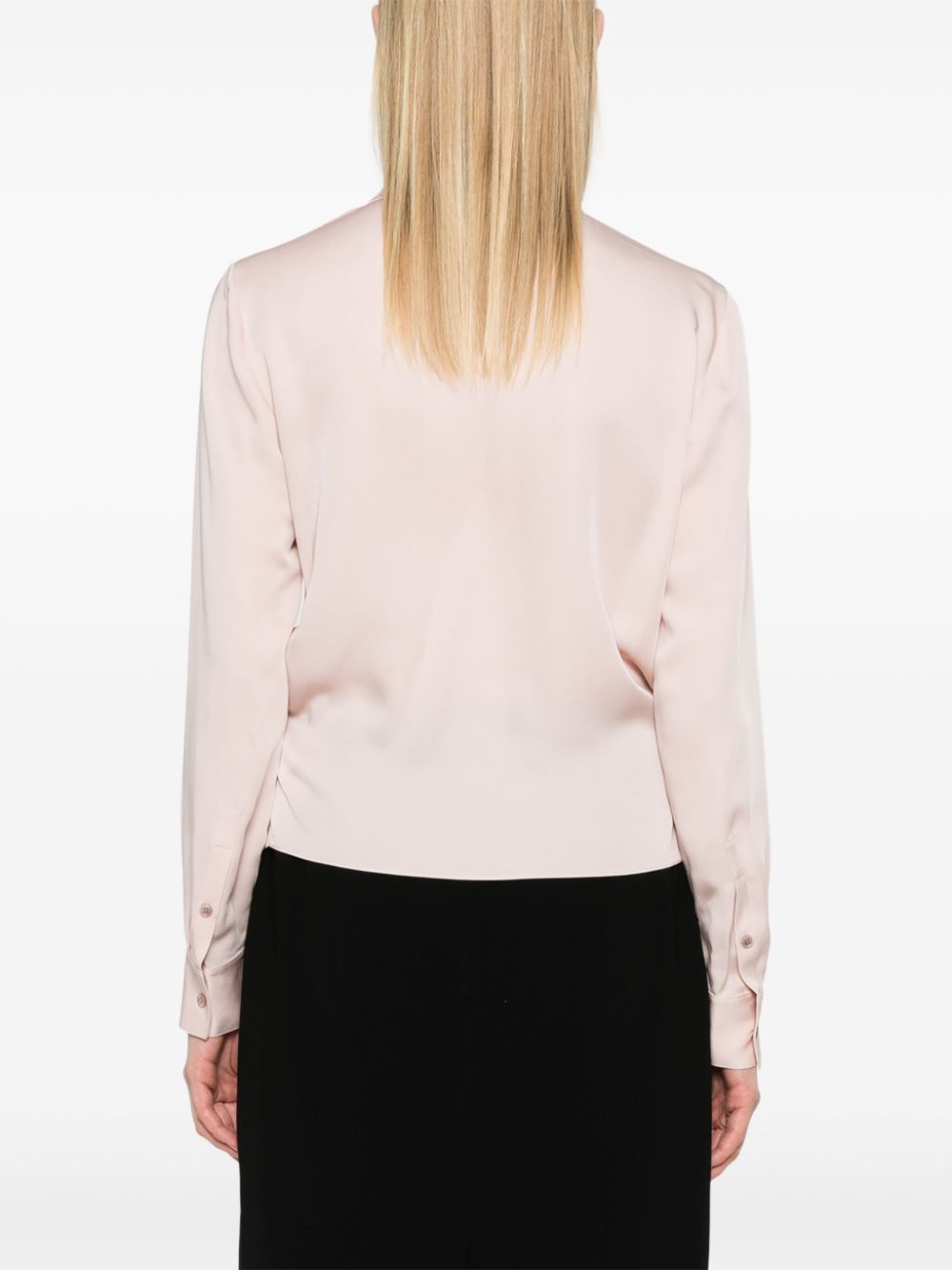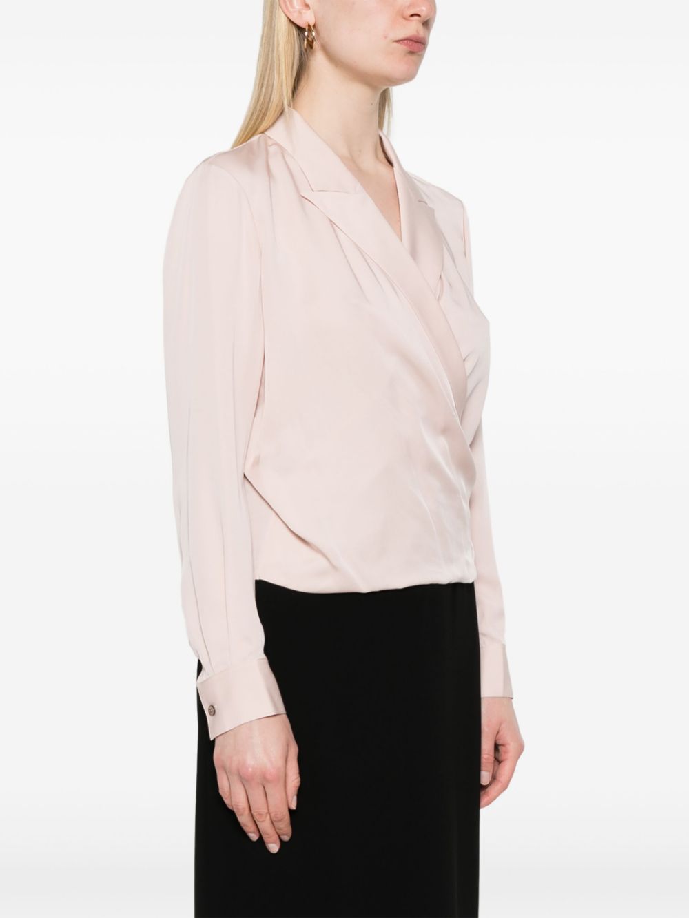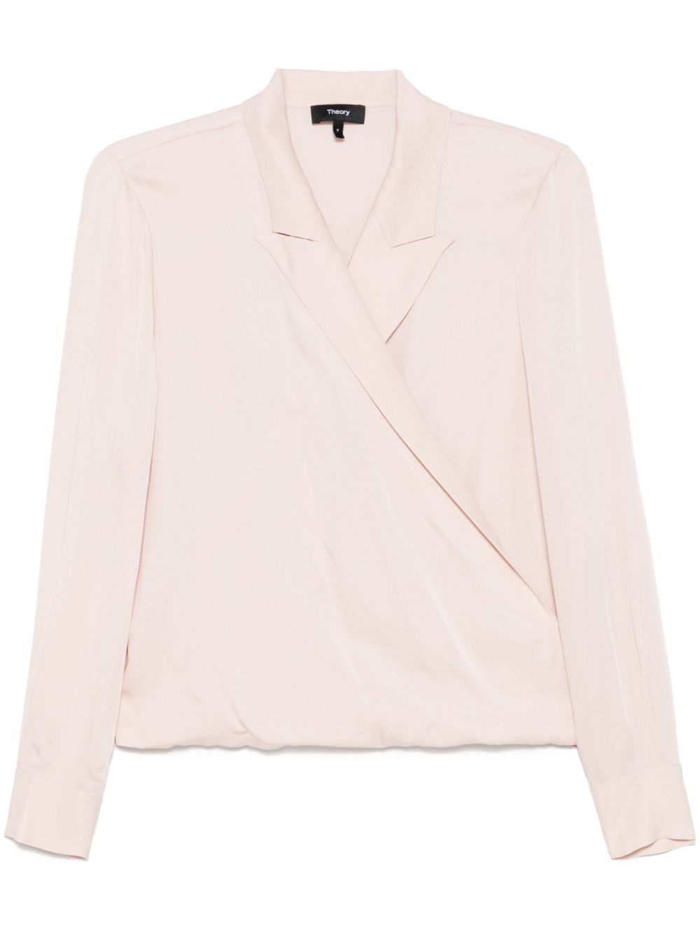 Theory blush pink wrap blouse, buttoned cuffs, deep V-neck, long sleeves, cropped design.Composition: 100% silk