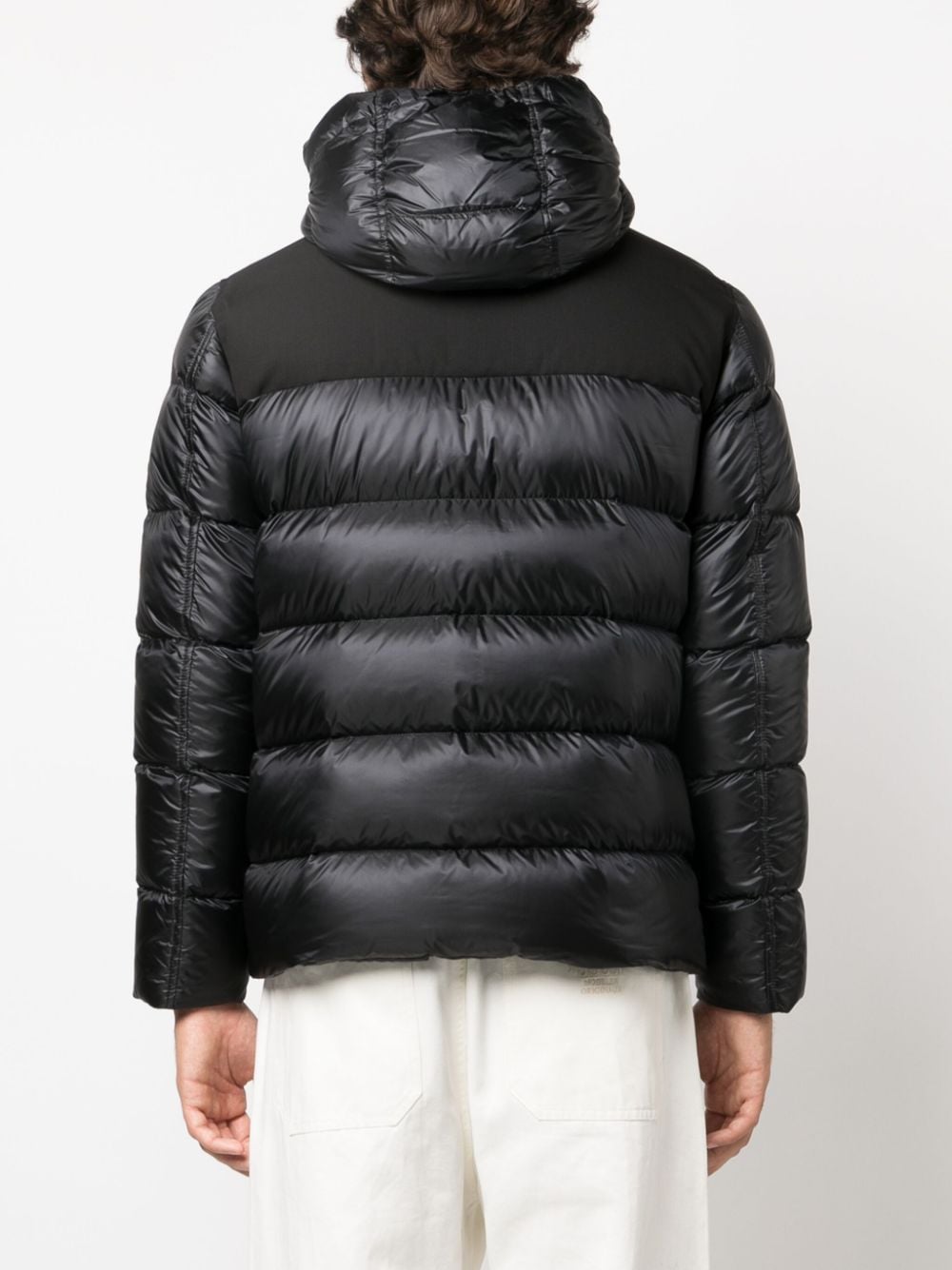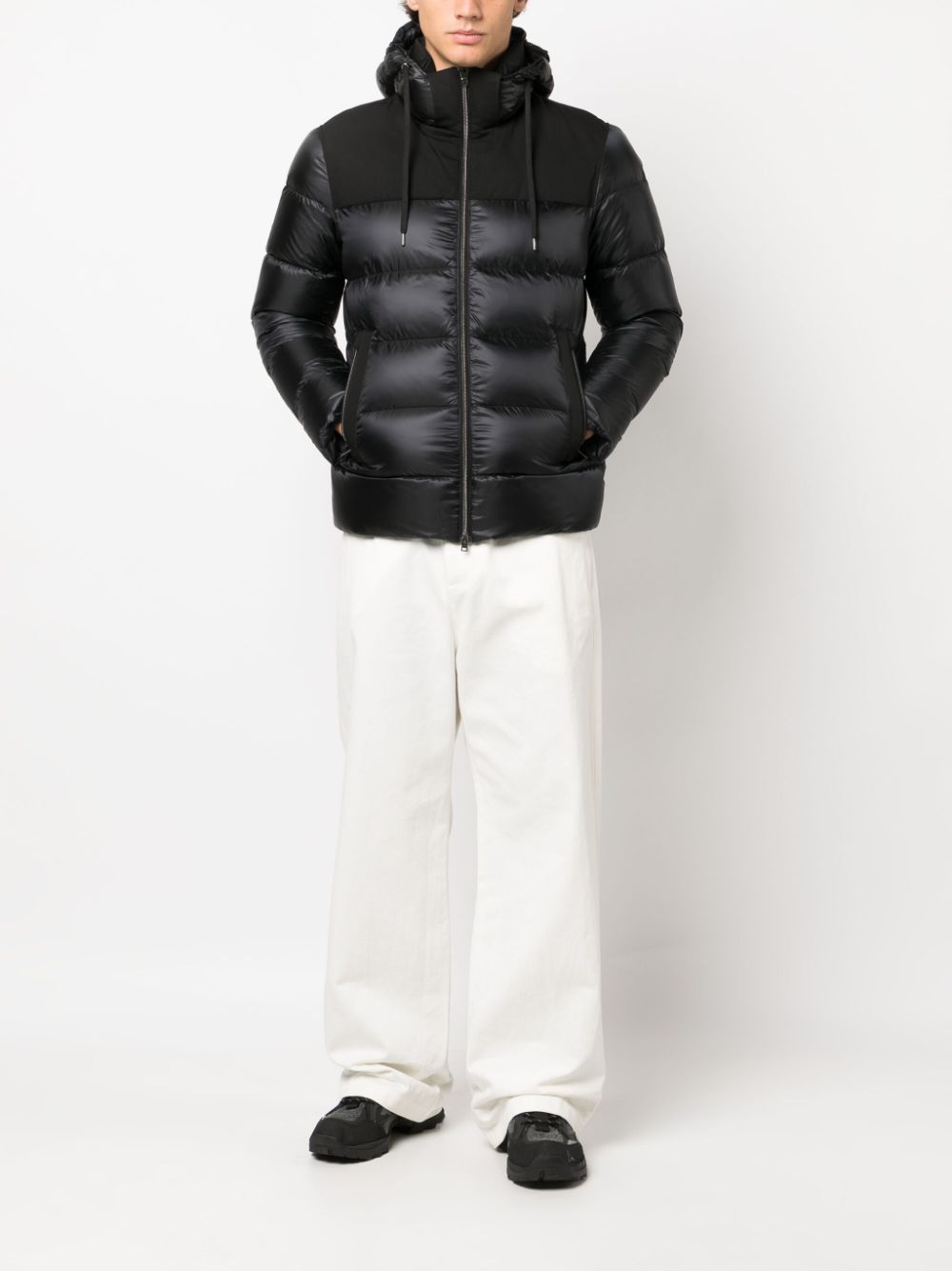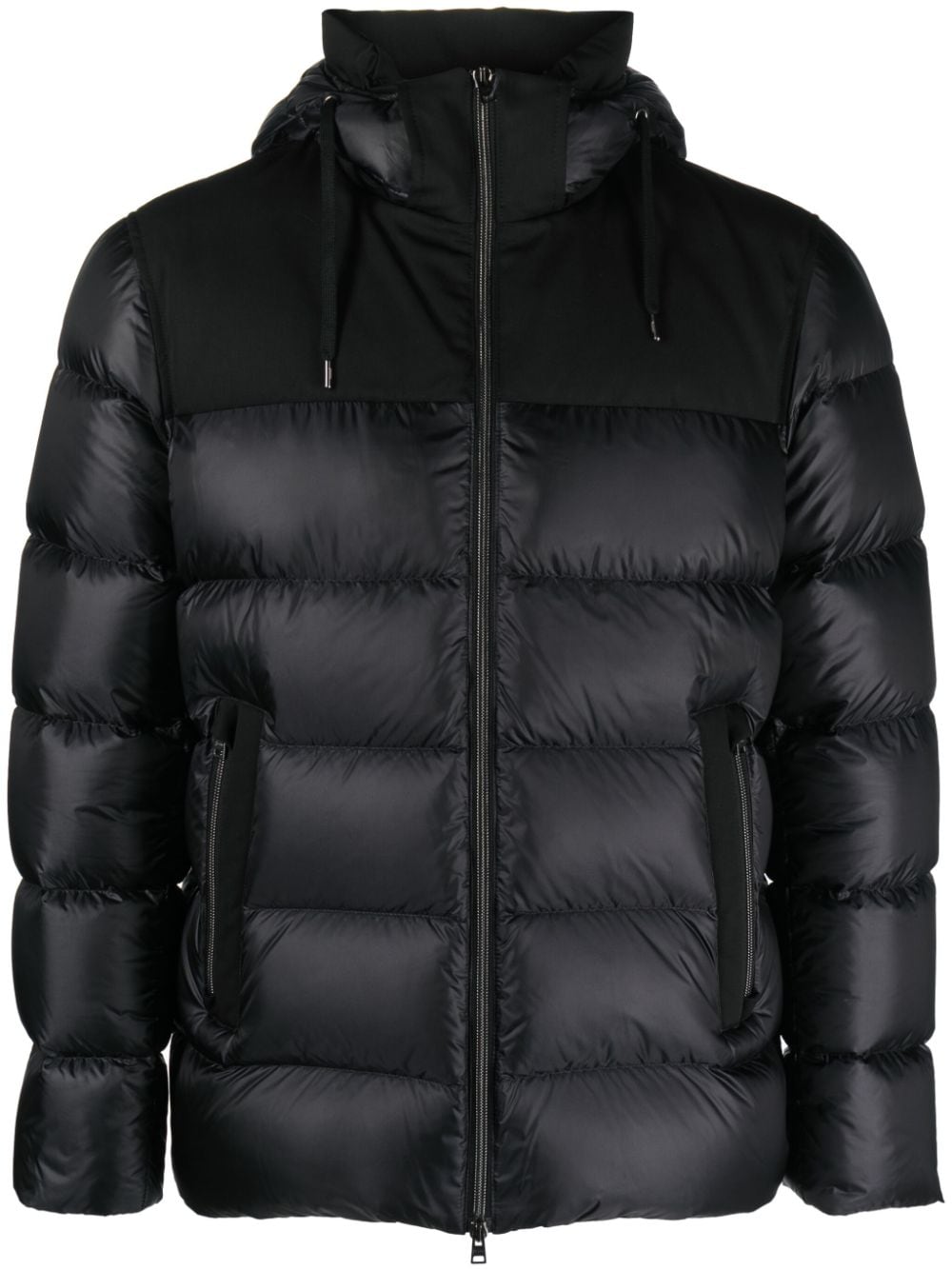 Piumino nero di Herno, Nero, design imbottito, cappuccio con coulisse, collo alto, chiusura frontale con zip, polsini elasticizzati, due tasche laterali a filetto e orlo dritto.