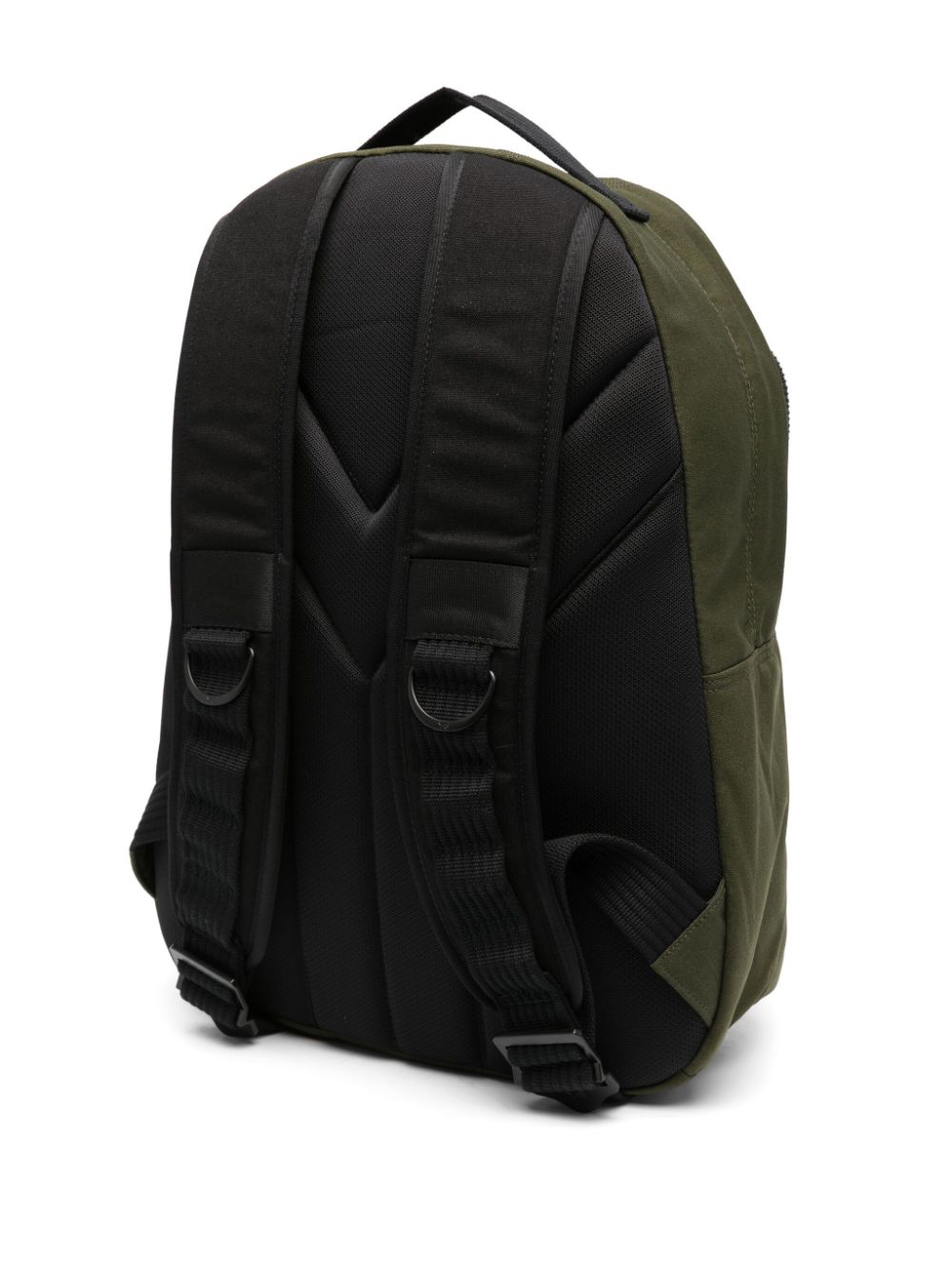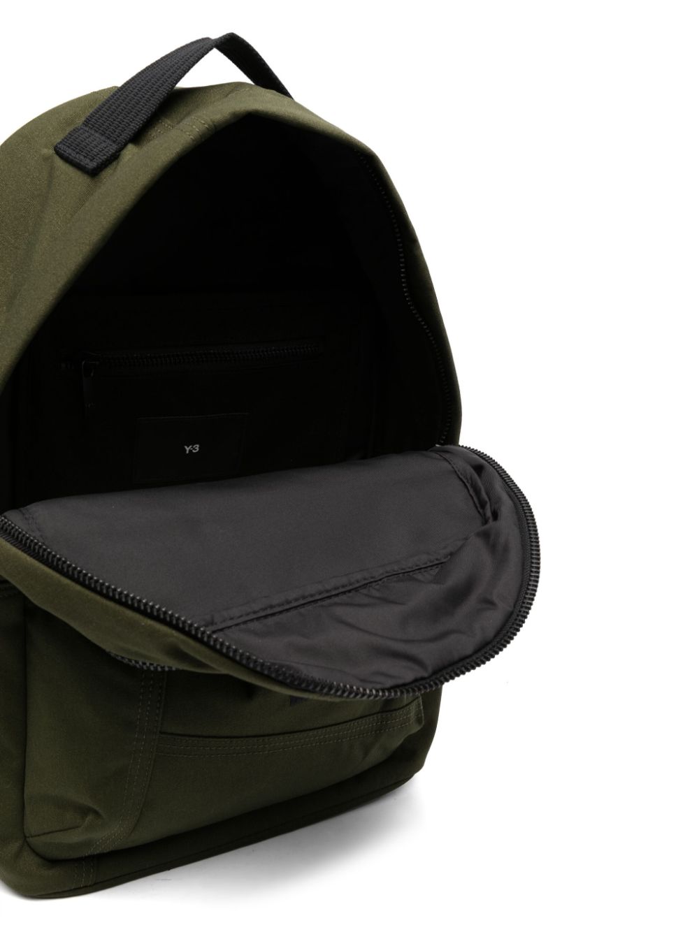 Zaino verde oliva Y-3, stampa con logo sul davanti, cuciture tono su tono, chiusura con zip a giro, manico rotondo, due tracolle regolabili imbottite, scomparto unico e tasca frontale con zip.