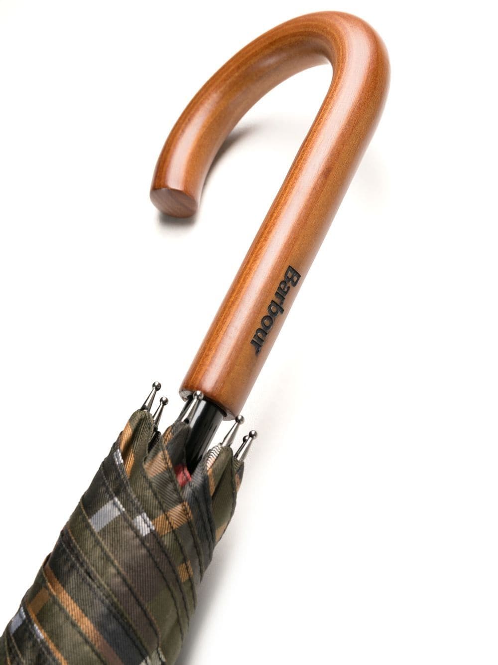 Iconico ombrello Barbour con fantasia tartan, manico in legno con logo inciso.