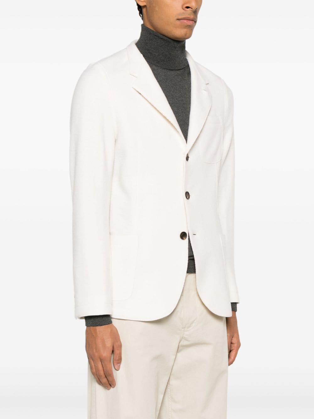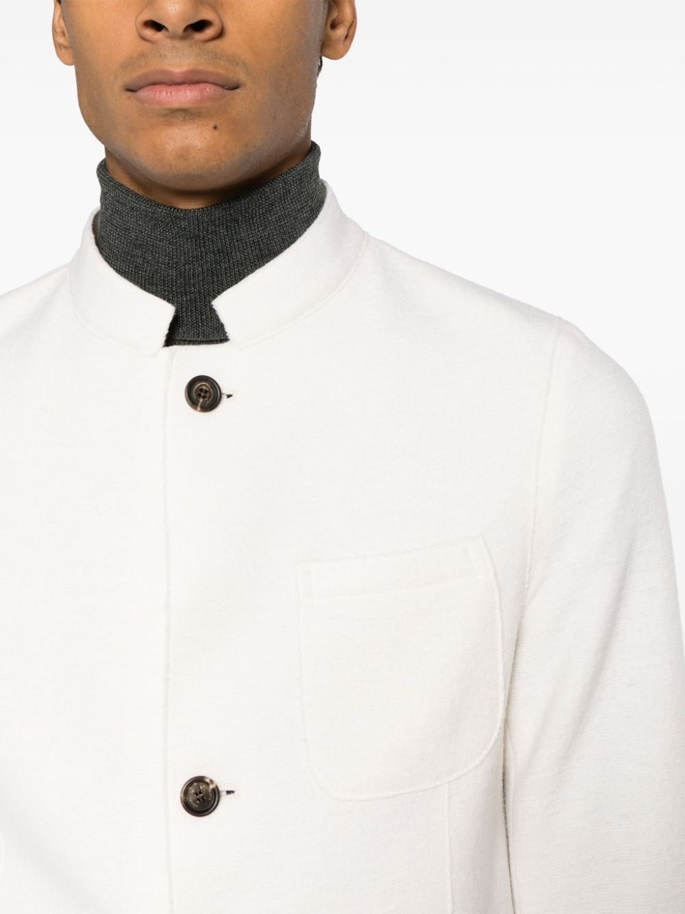 Blazer panna Eleventy, con colletto alla coreana, abbottonatura frontale, tasche a toppa e taschino sul petto.
