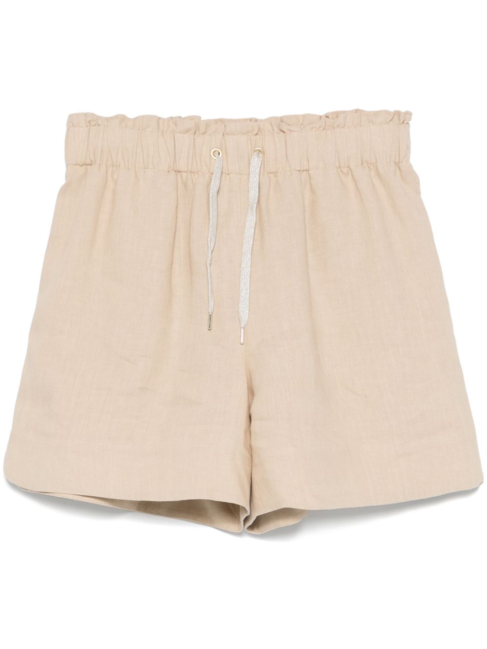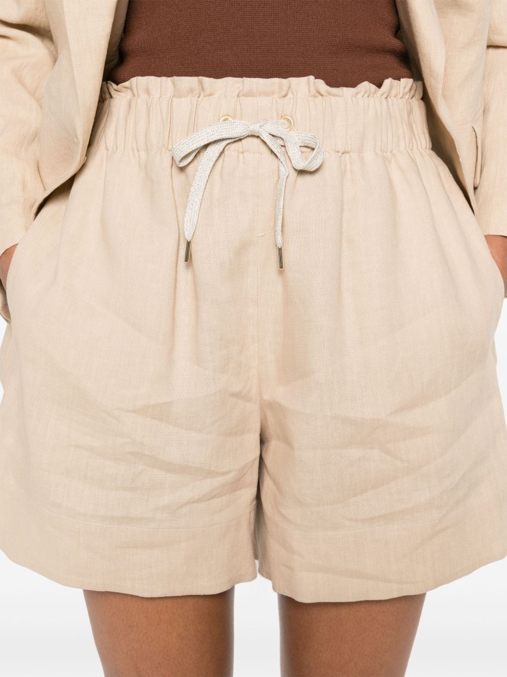 Shorts in lino di Eleventy color sabbia, vita con coulisse elasticizzata, due tasche laterali, spacchetti laterali, lunghezza sopra il ginocchioComposizione: Lino 100%