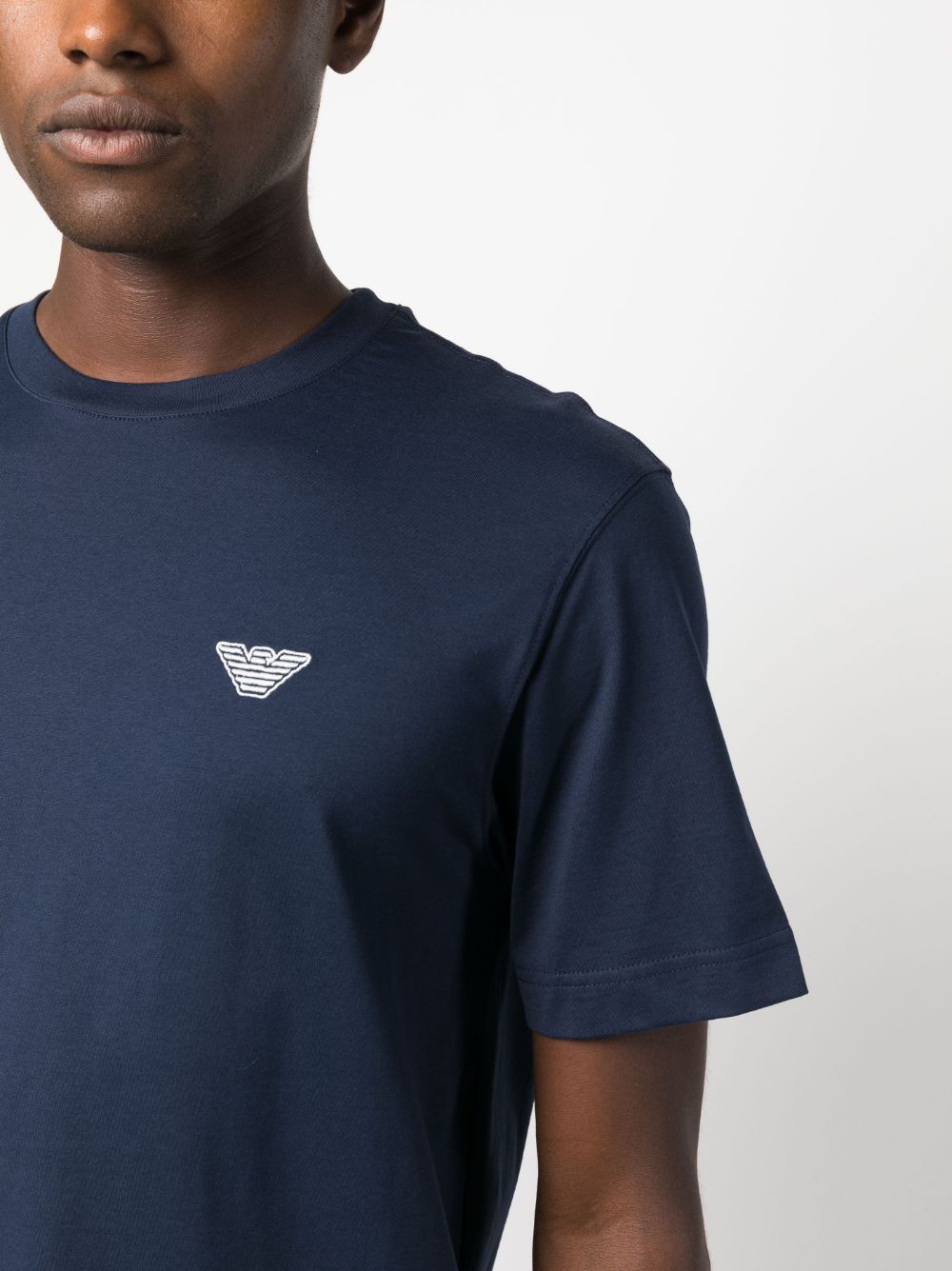 T-shirt Emporio Armani blu, modello girocollo, manica corta, logopatch Eagle sul petto e stampa sul retro.