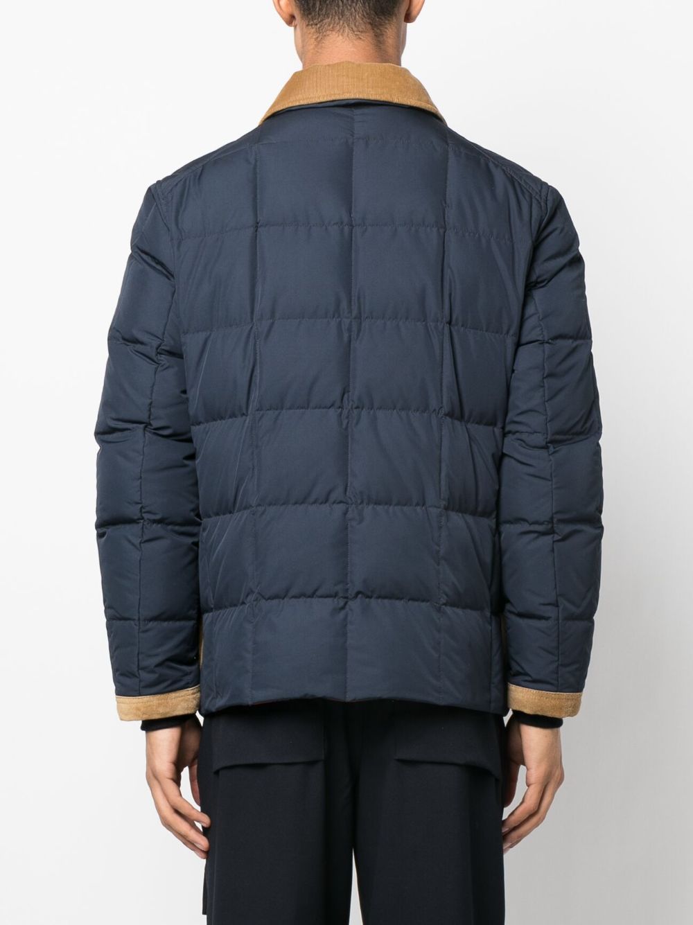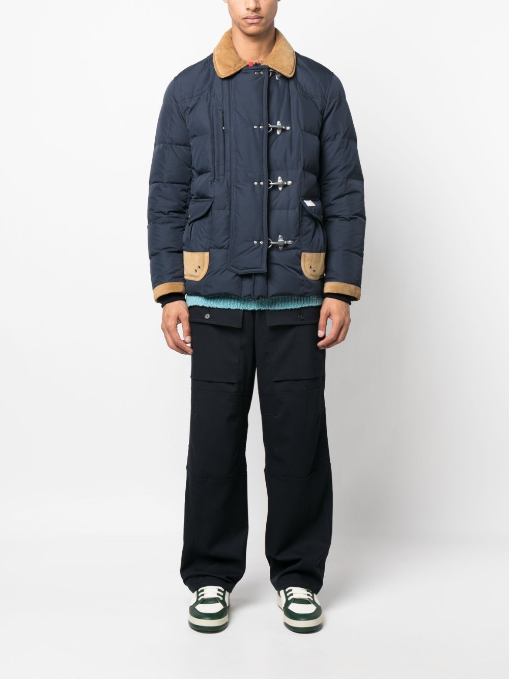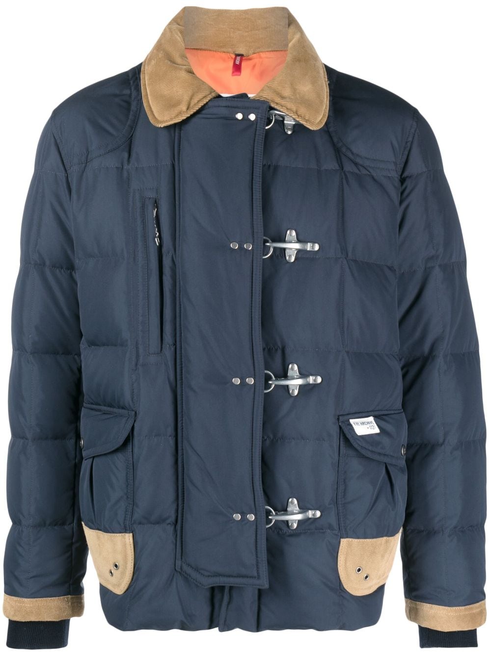 Piumino blu navy Fay in piuma d'oca, design imbottito, rifiniture in pelle scamosciata, colletto alla francese, chiusura con ganci, tasca con zip sul petto e due tasche frontali con pattina.