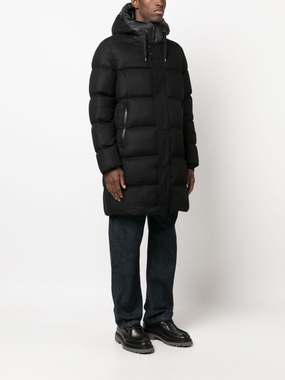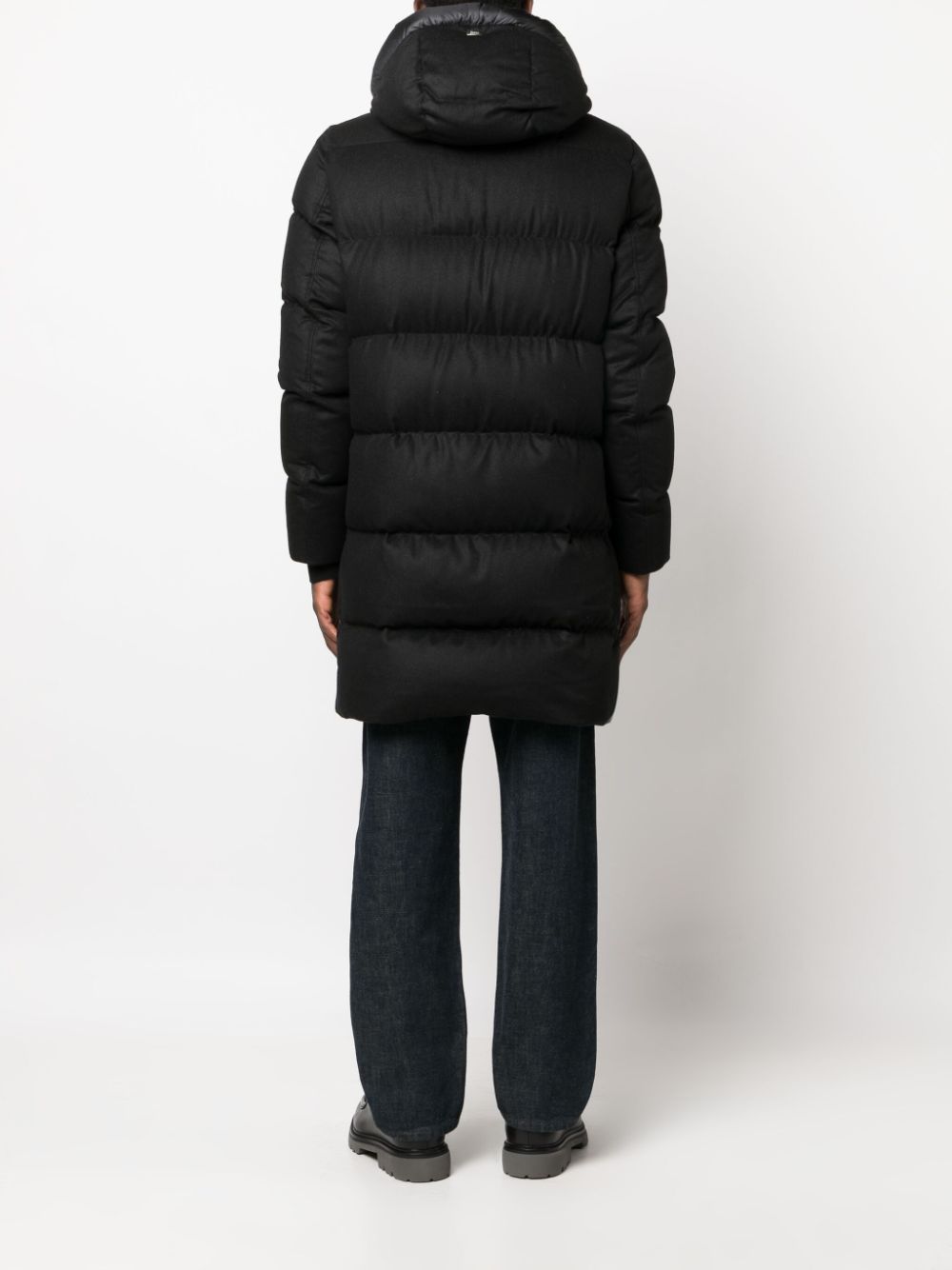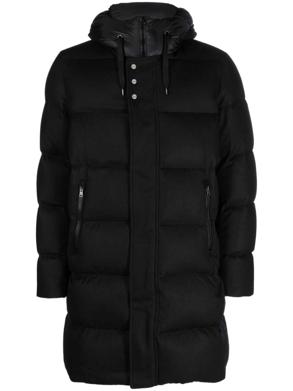 Piumino nero Herno, design imbottito, con cappuccio, chiusura frontale nascosta, tasche laterali.
