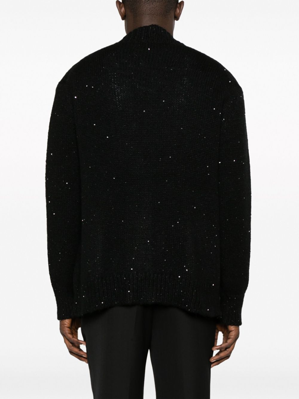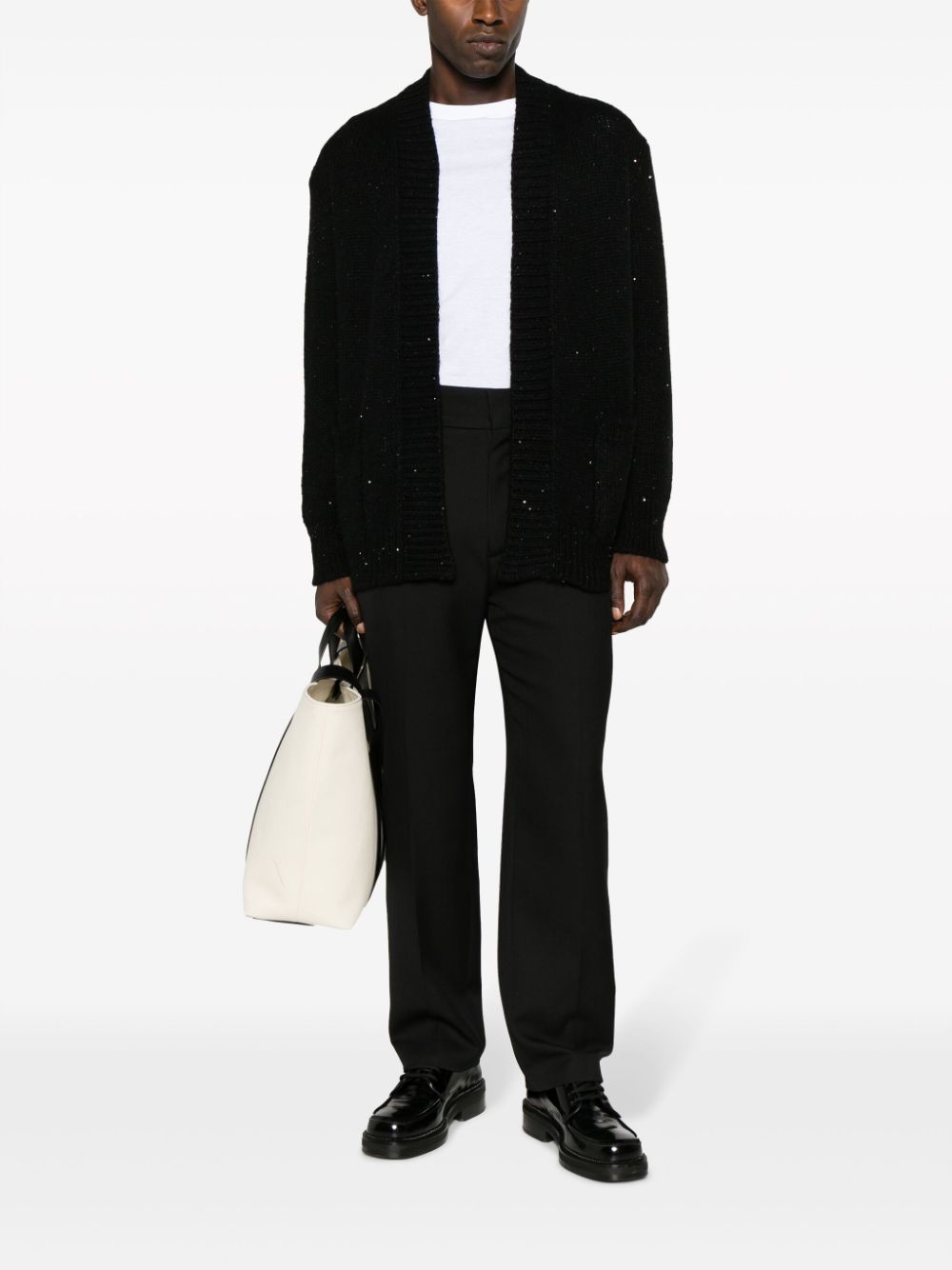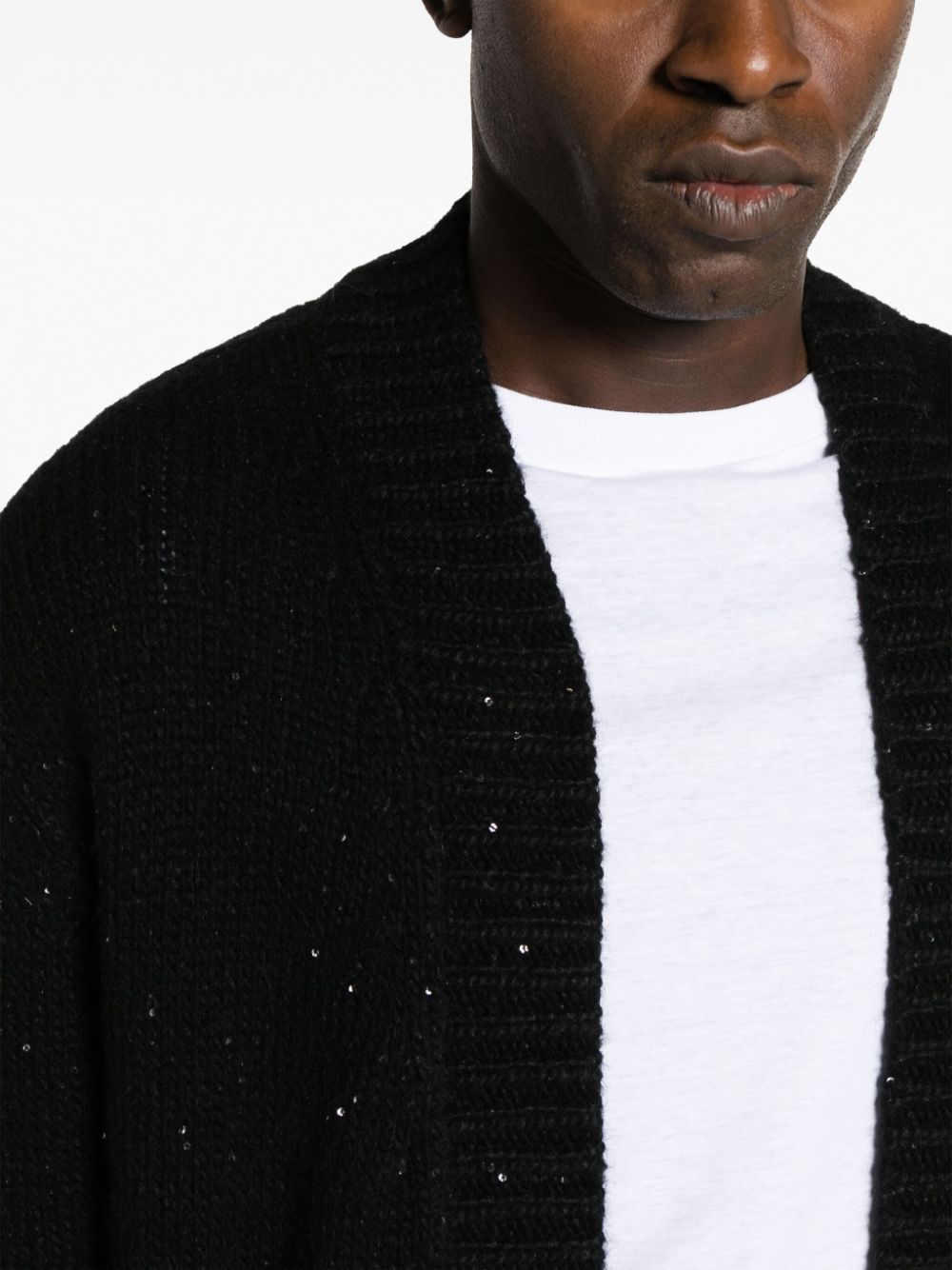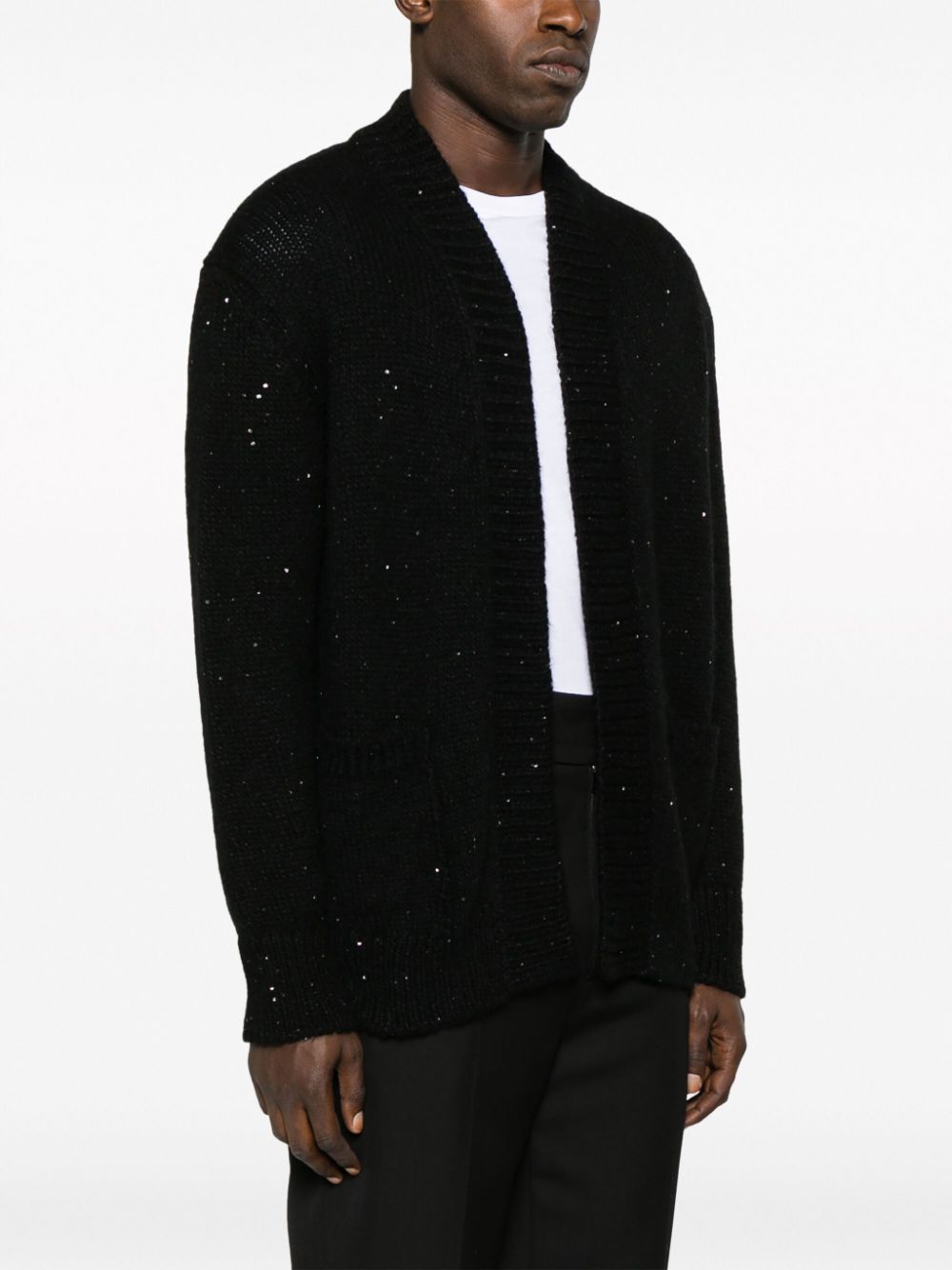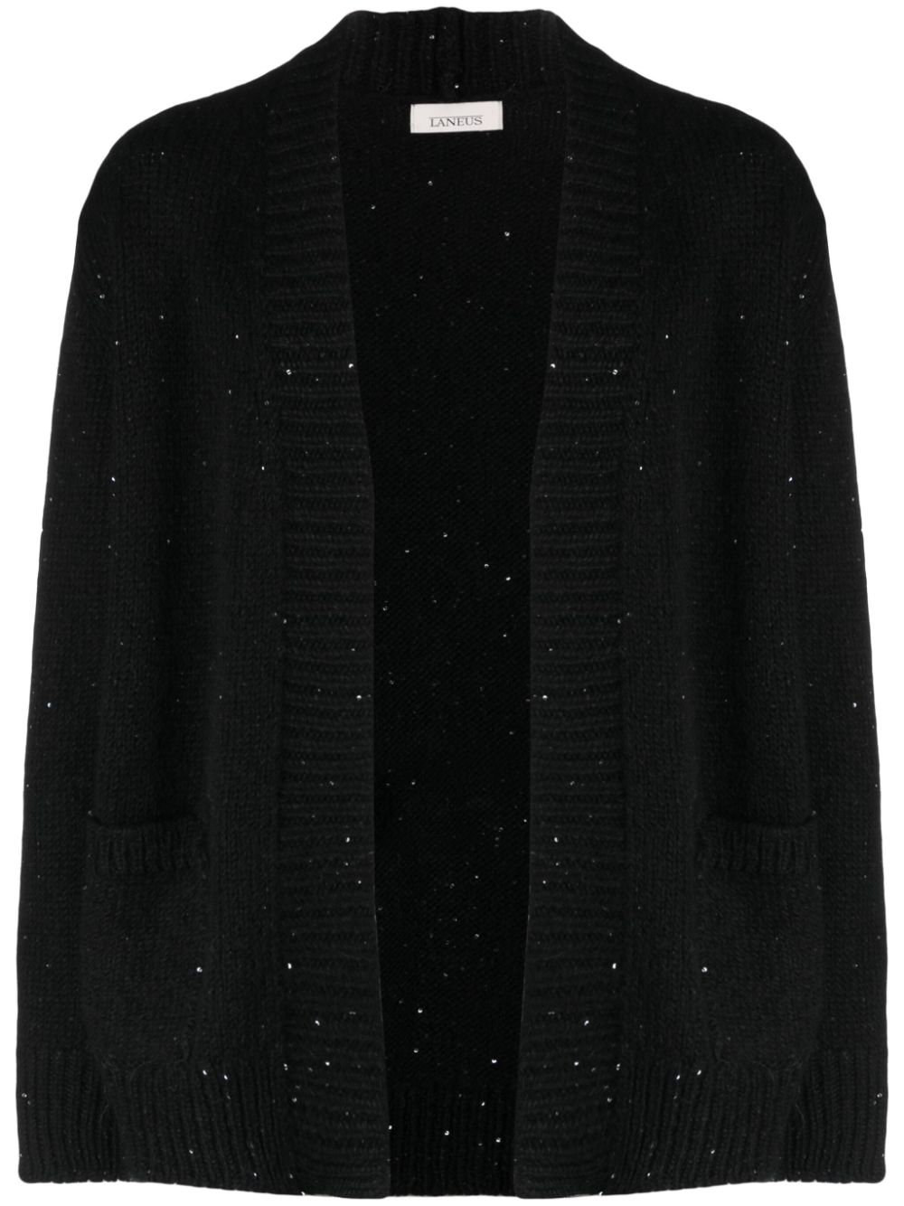 Cardigan nero Laneus, lavorazione a coste, apertura frontale senza chiusure, due tasche frontali, decorazione con paillettes argento.