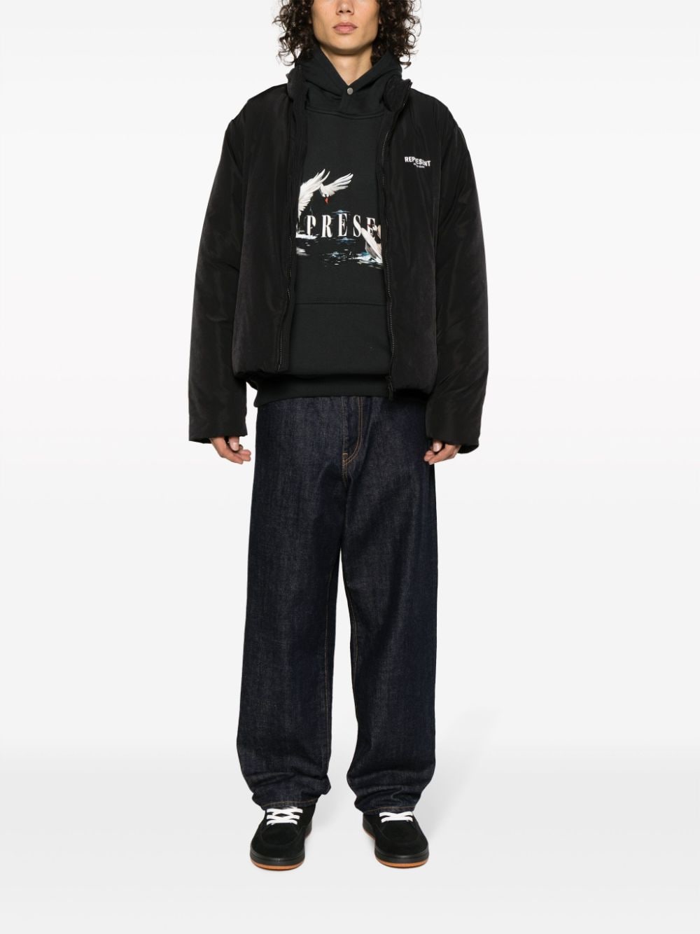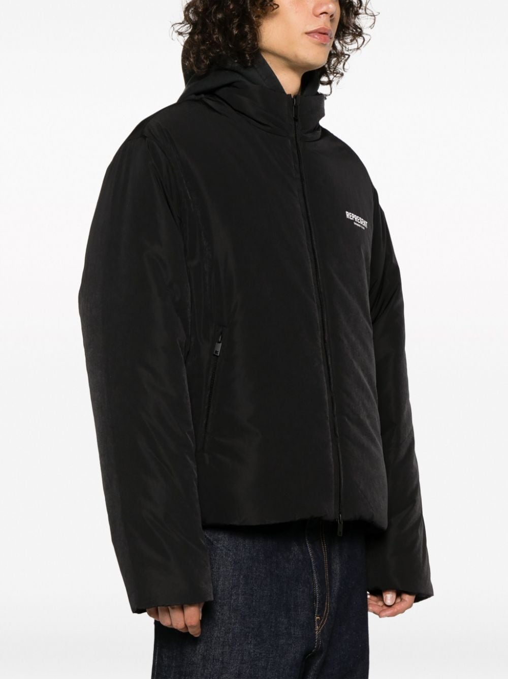 Piumino Owners Club nero di Represent, stampa con logo sul petto e sul retro, imbottito con piuma riciclata, collo alto, chiusura frontale con zip a doppio cursore, due tasche laterali con zip.