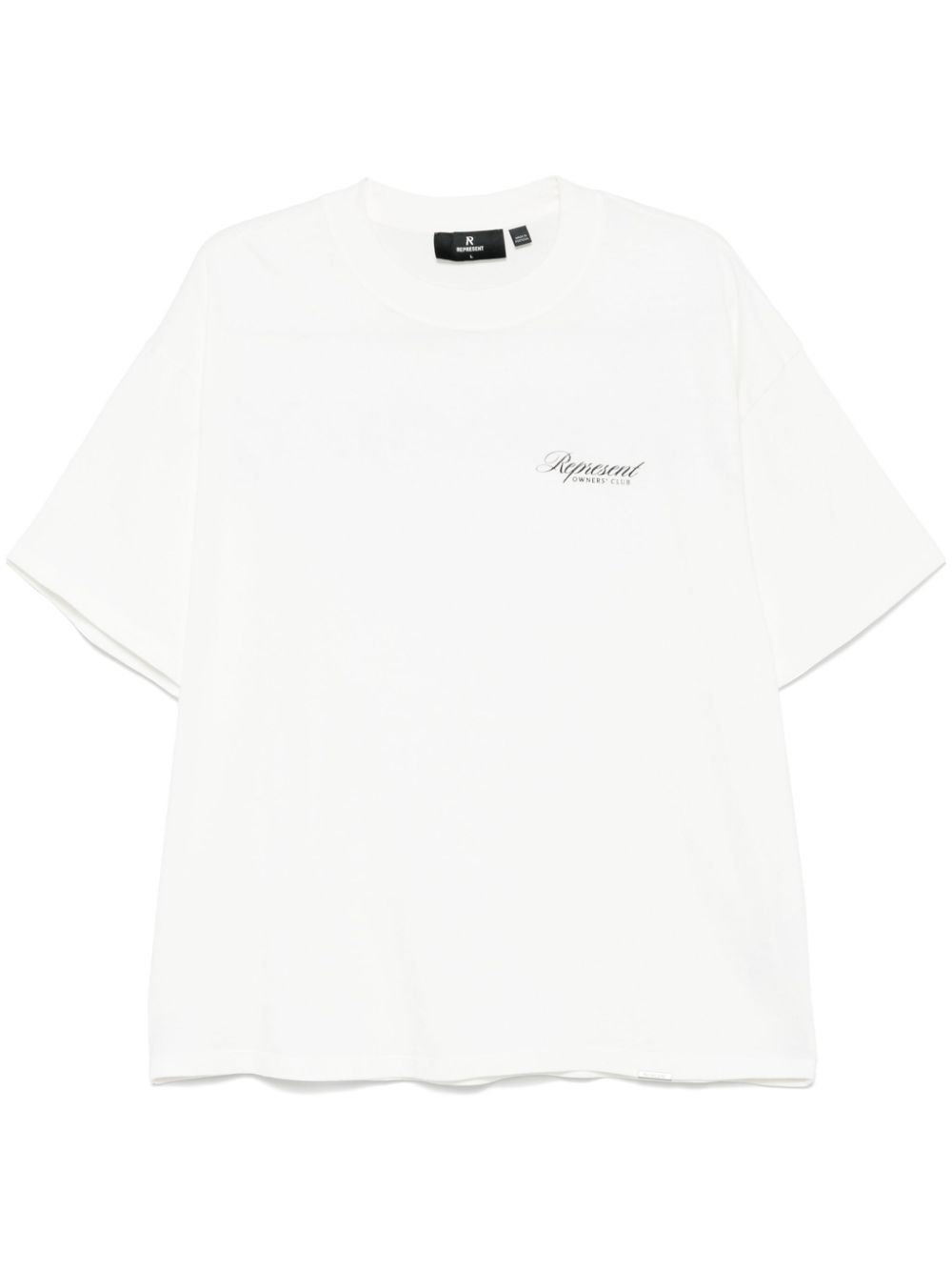 T-shirt Represent bianca, girocollo, manica corta, logo sul petto e stampa sul retro.