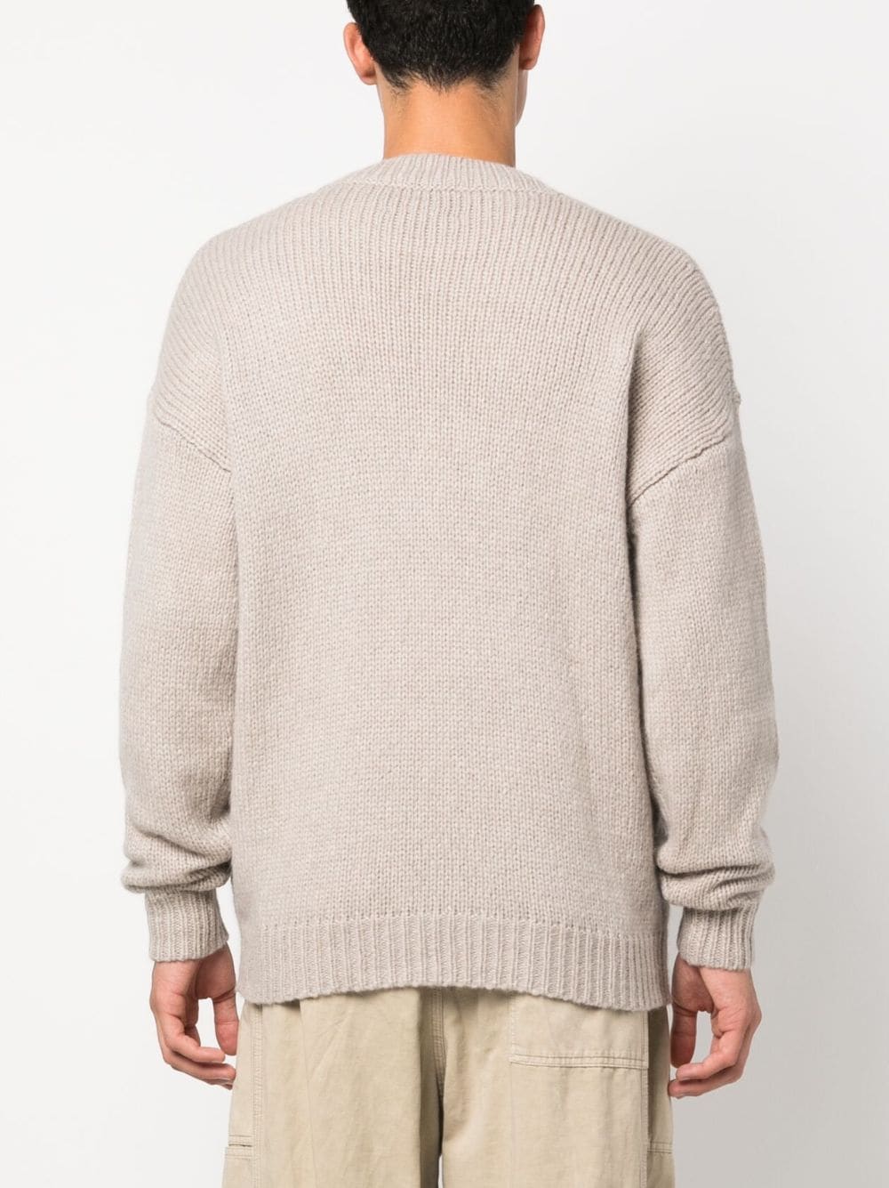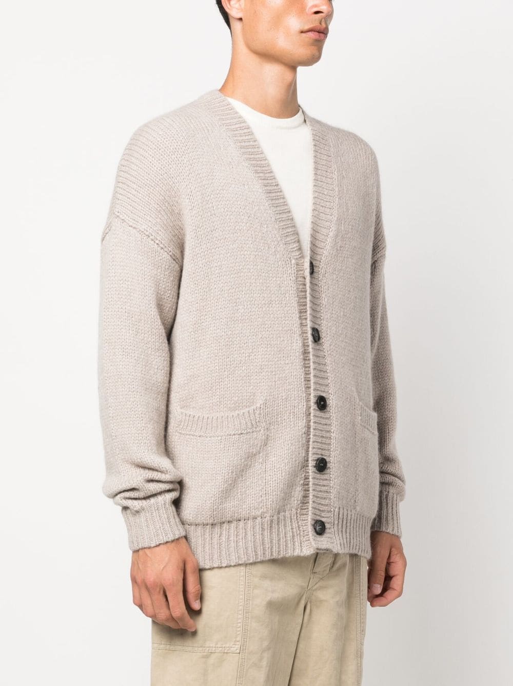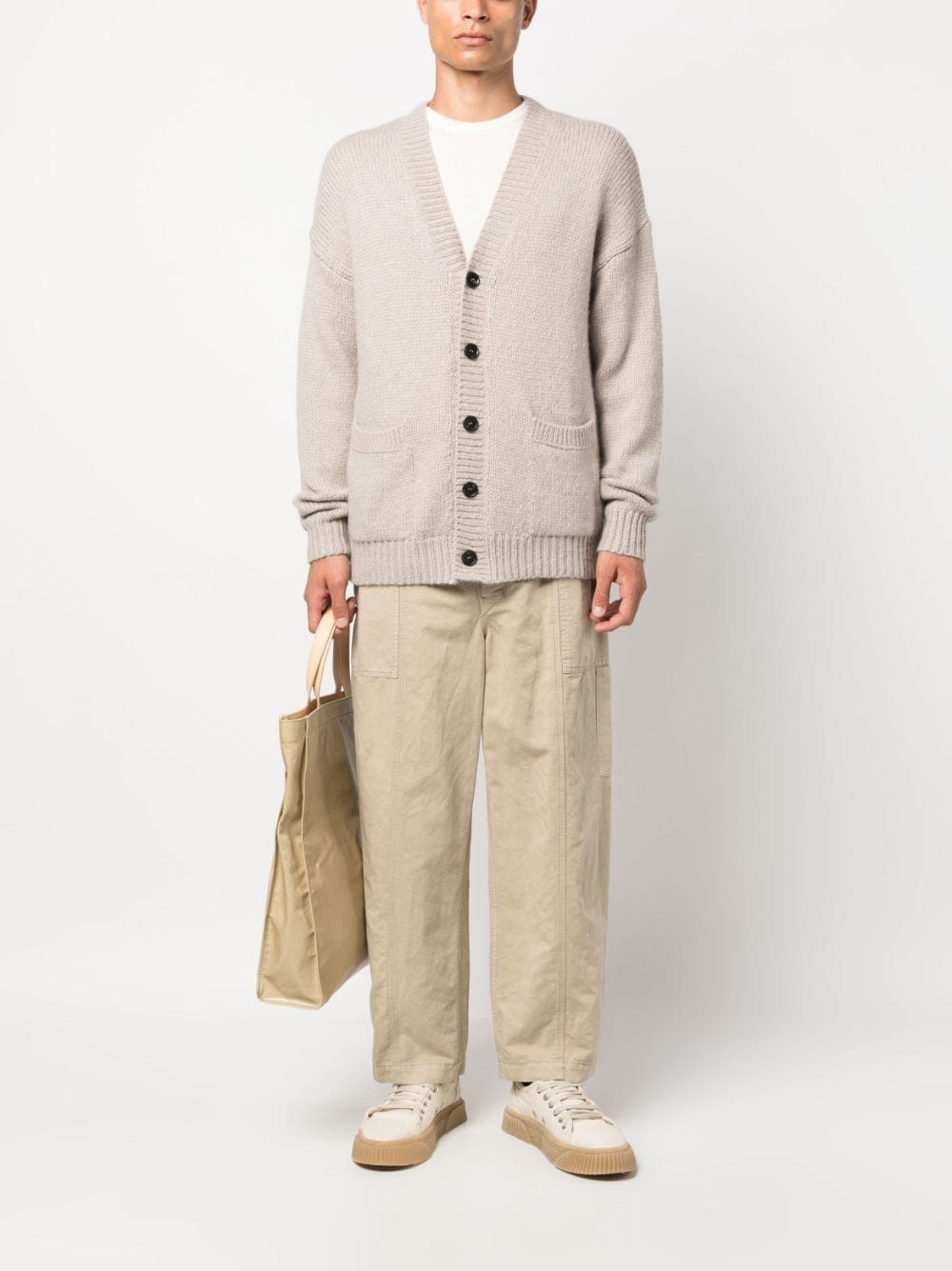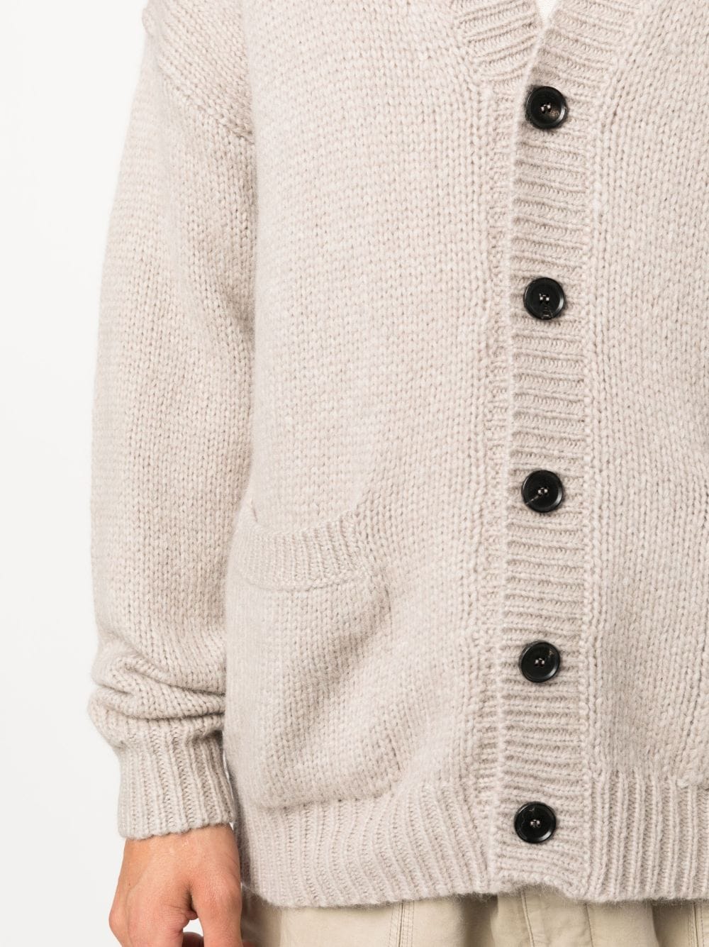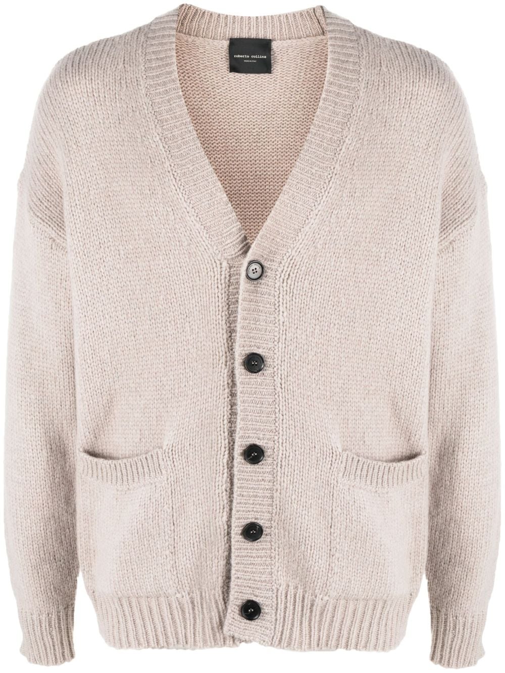 Cardigan Roberto Collina color mastice, con scollo a V, chiusura con bottoni, tasche a toppa.