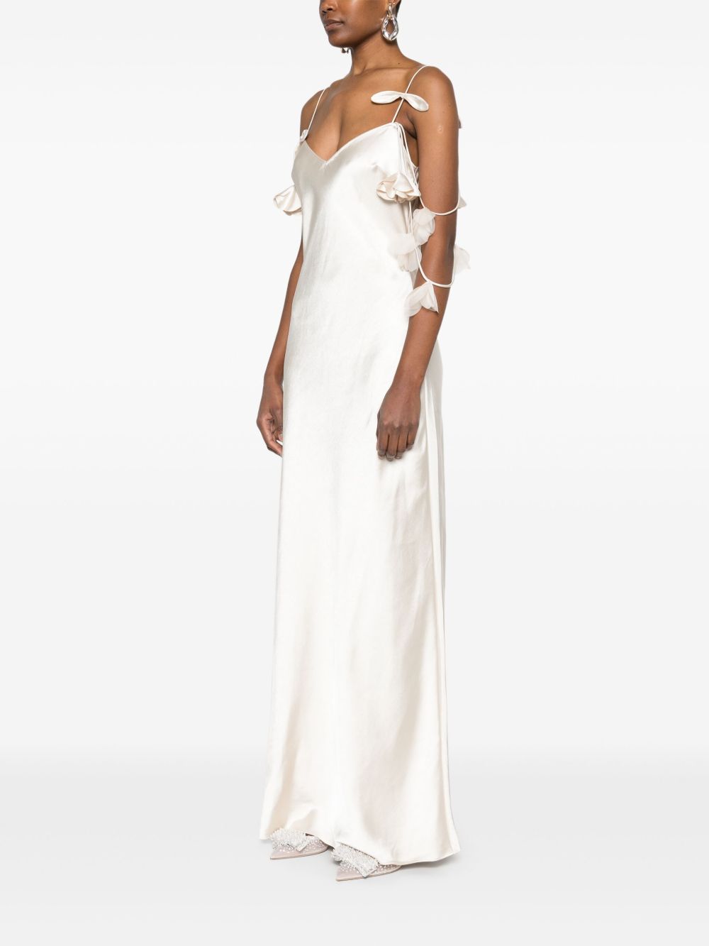 Abito lungo in raso con applicazione a fiori di Self-Portait di colore beige chiaro, scollo a V, spalline sottili, design senza fodera.Composizione: Poliestere 100%