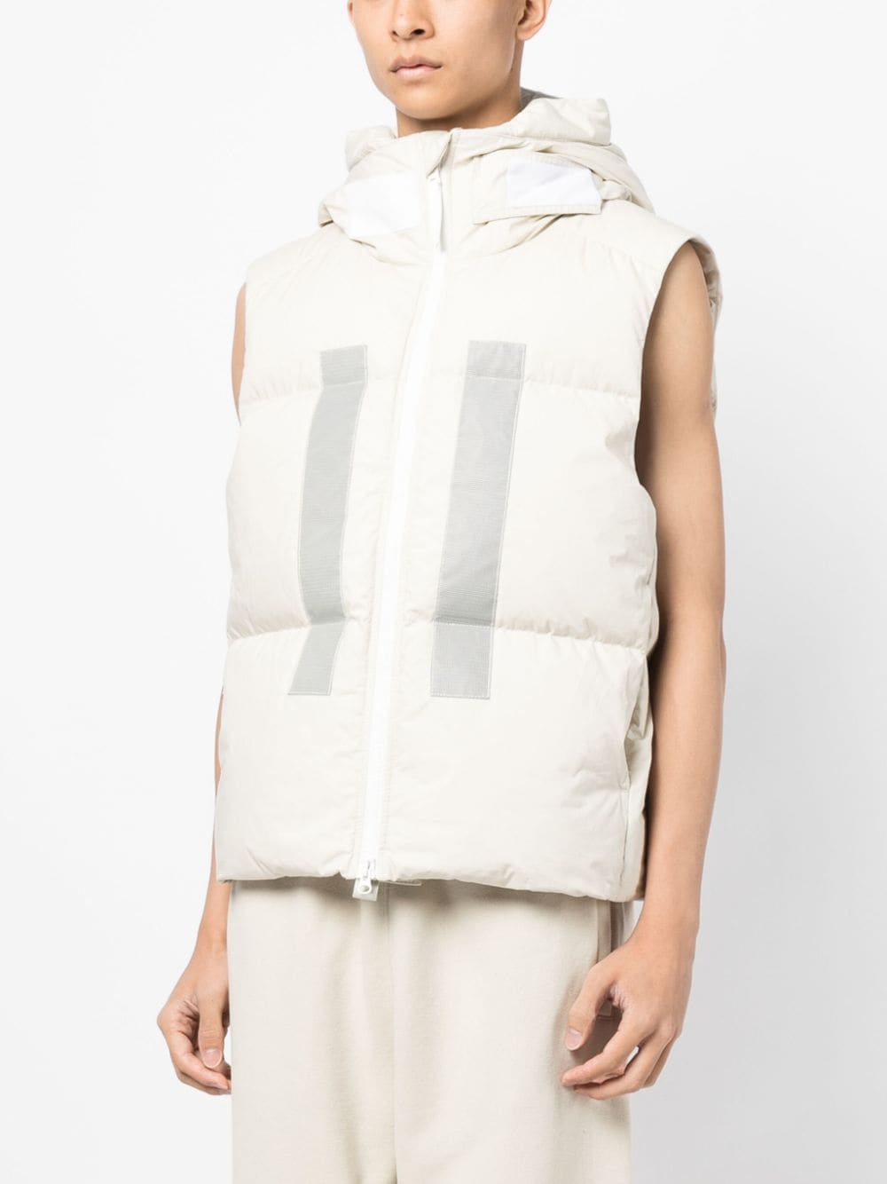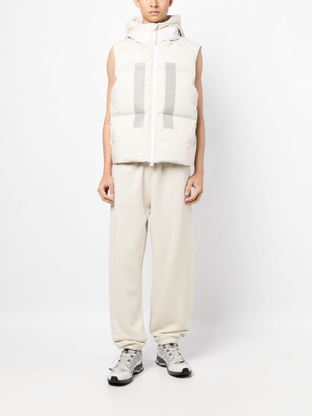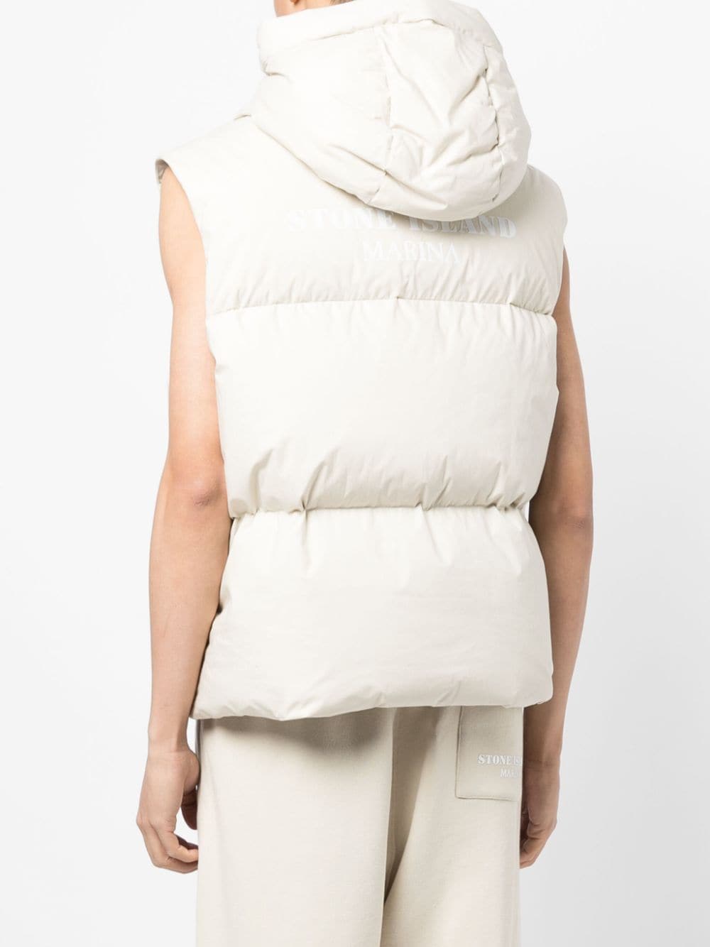 Gilet con cappuccio beige di Stone Island, imbottito in piuma d'oca, stampa con logo sul retro, collo alto, chiusura frontale con zip, senza maniche e orlo dritto.