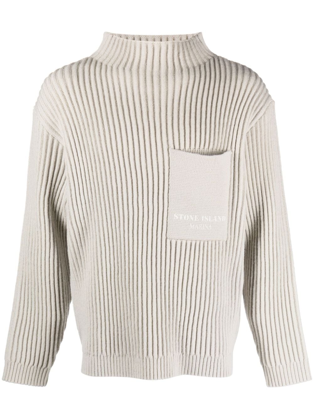 Maglione Stone Island color malta, lavorazione a coste, taschino sul petto con logo, collo a lupetto.