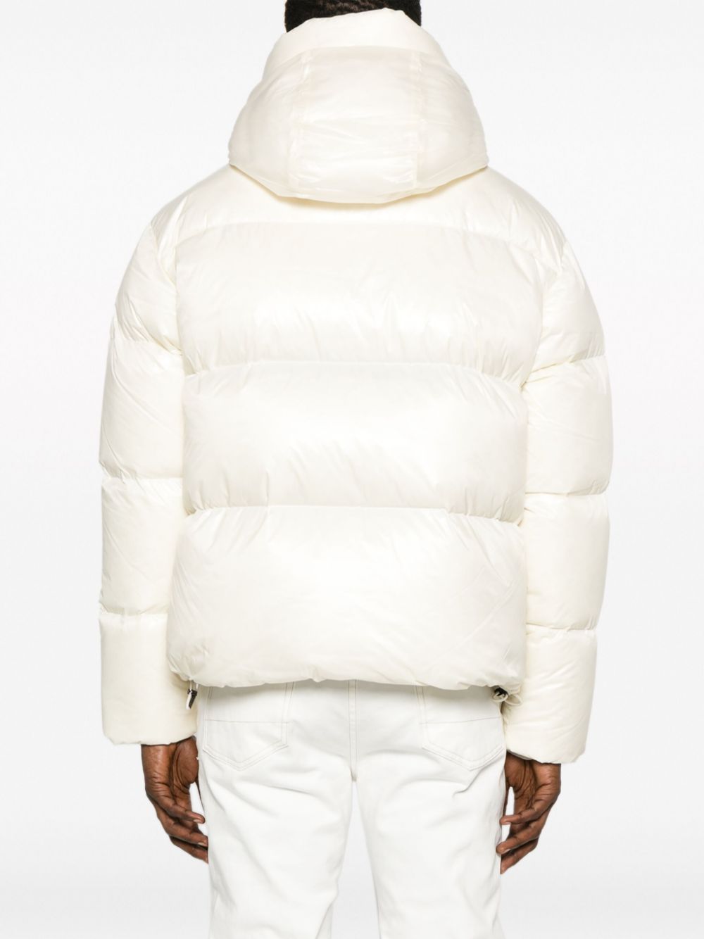 Piumino bianco Emporio Armani design imbottito, impermeabile, logo ricamato sul petto, cappuccio con coulisse, collo alto, chiusura frontale con zip a doppio cursore, due tasche laterali con zip, orlo con coulisse.