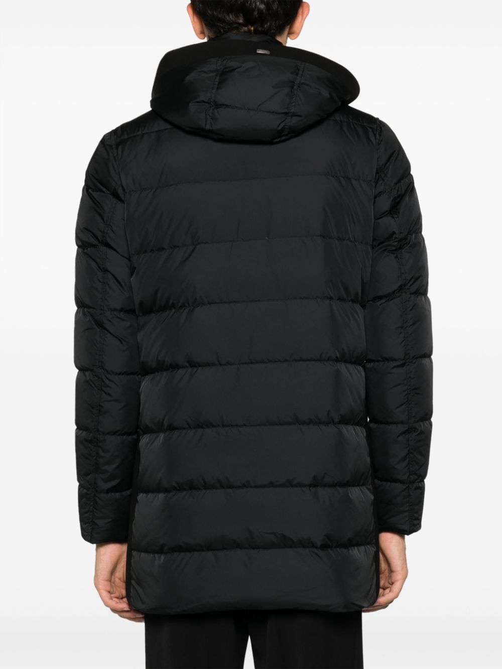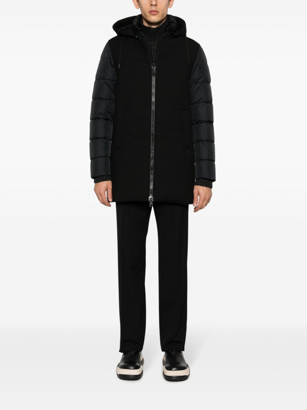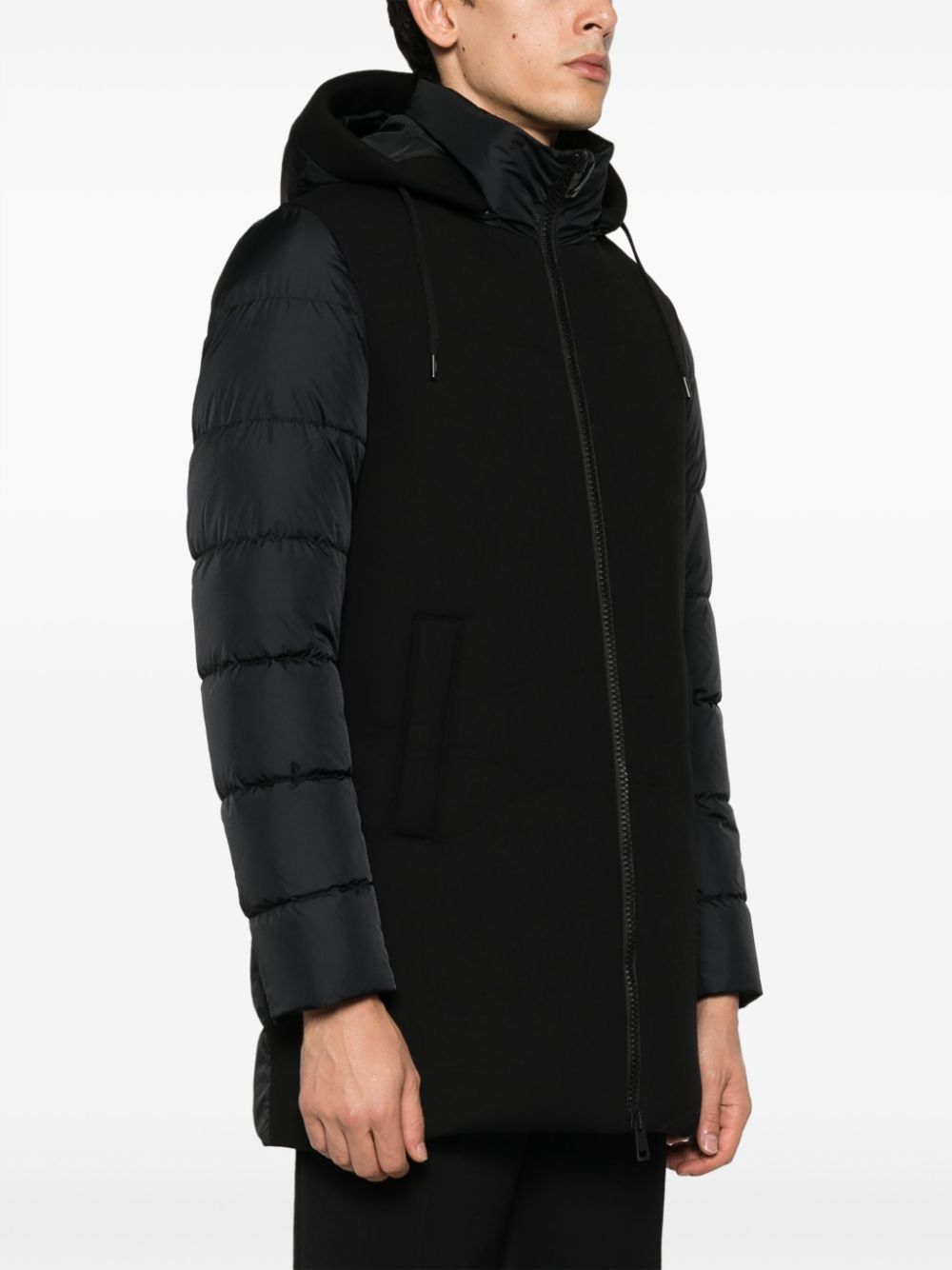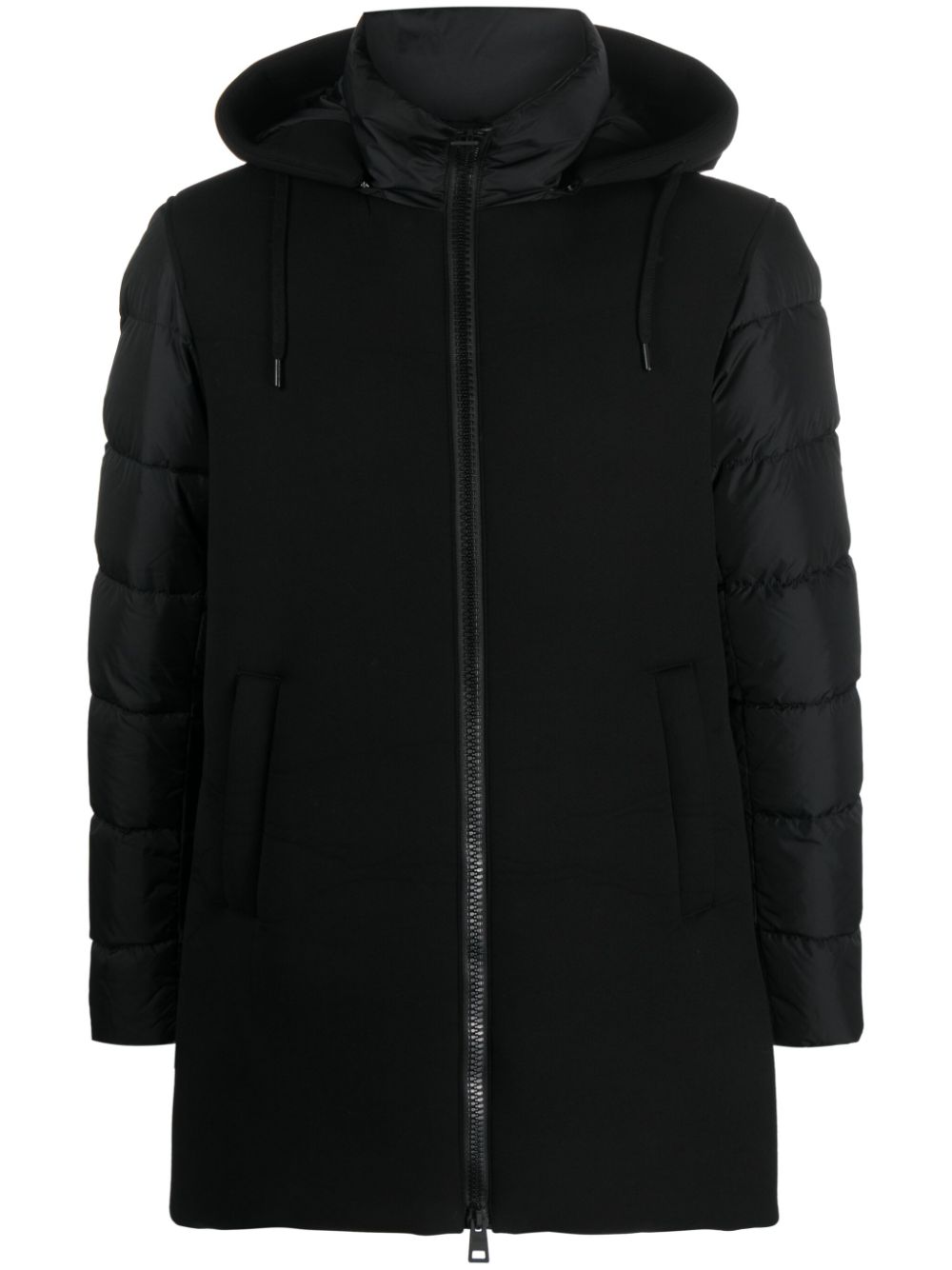 Parka nero di Herno con cappuccio staccabile con coulisse, collo alto, chiusura frontale con zip a doppio cursore, due tasche laterali a filetto orlo.