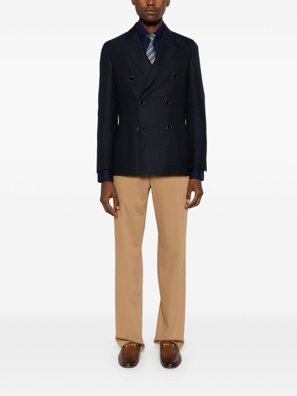 Blazer Special blu di Lardini, chiusura doppiopetto con revers classici, tasche a toppa e taschino a filetto sul petto, doppio spacco posteriore, misto lana.