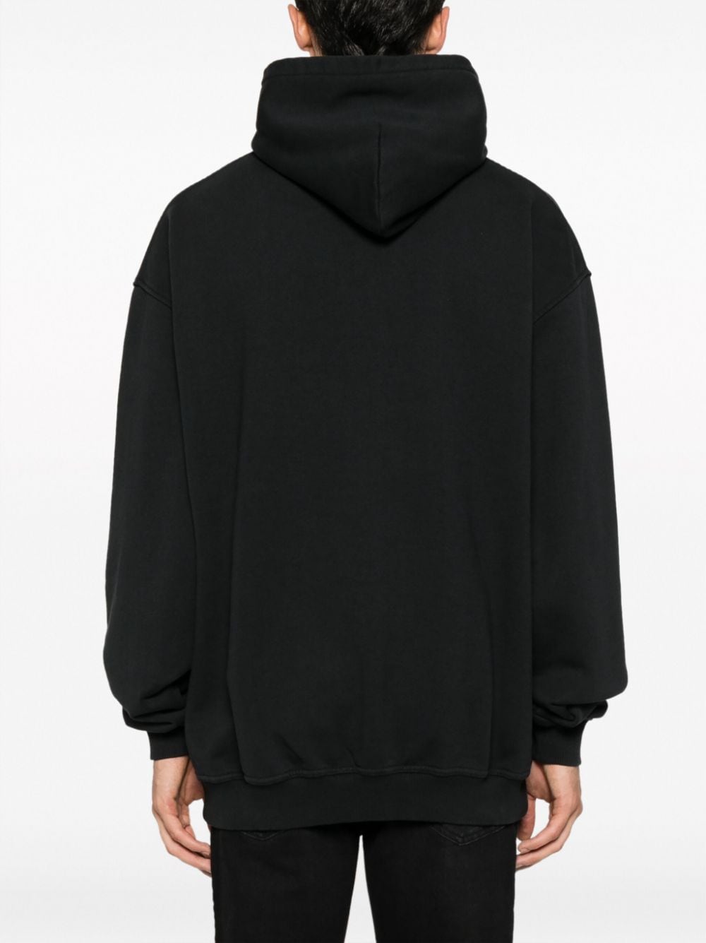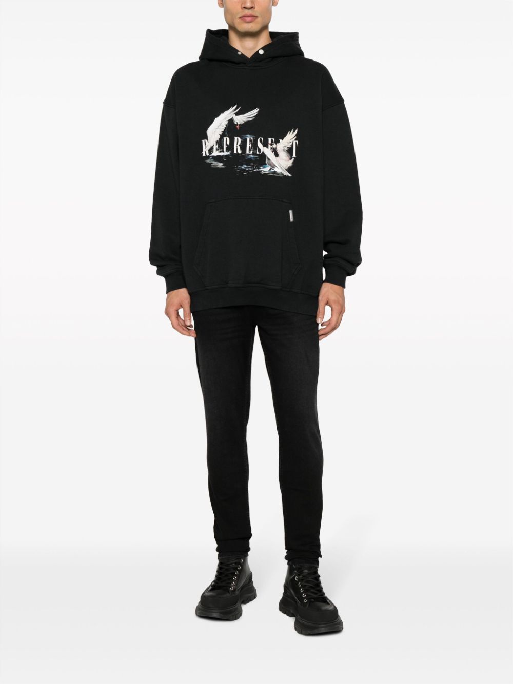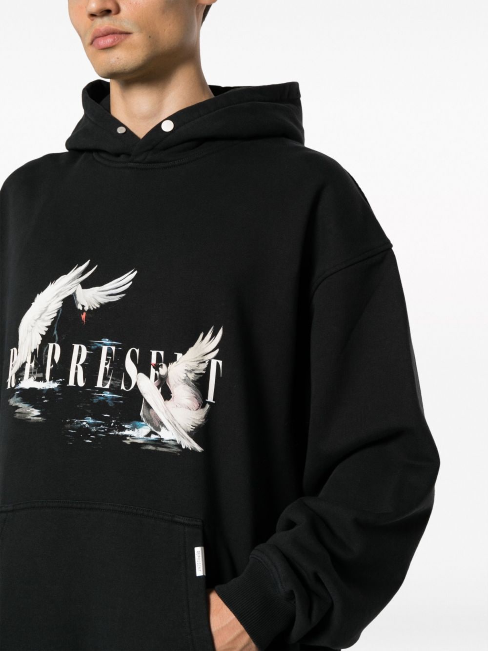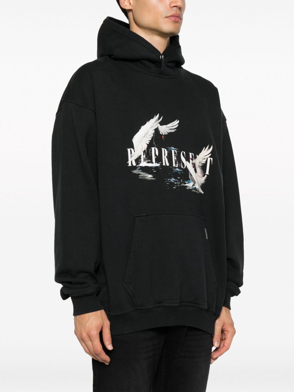 Felpa Represent nera, modello hoodie con cappuccio e tascone a marsupio, logo swan stampato sul petto.