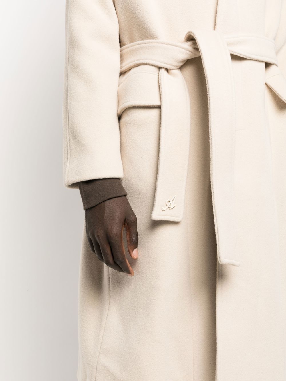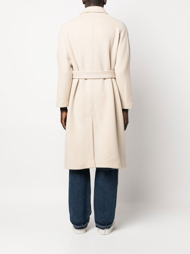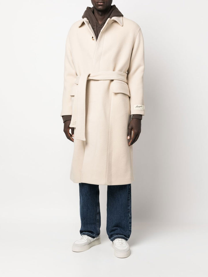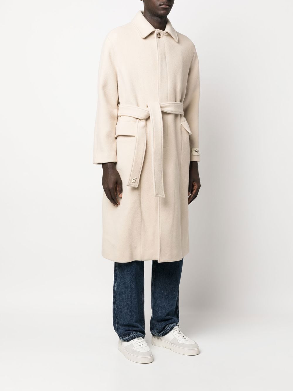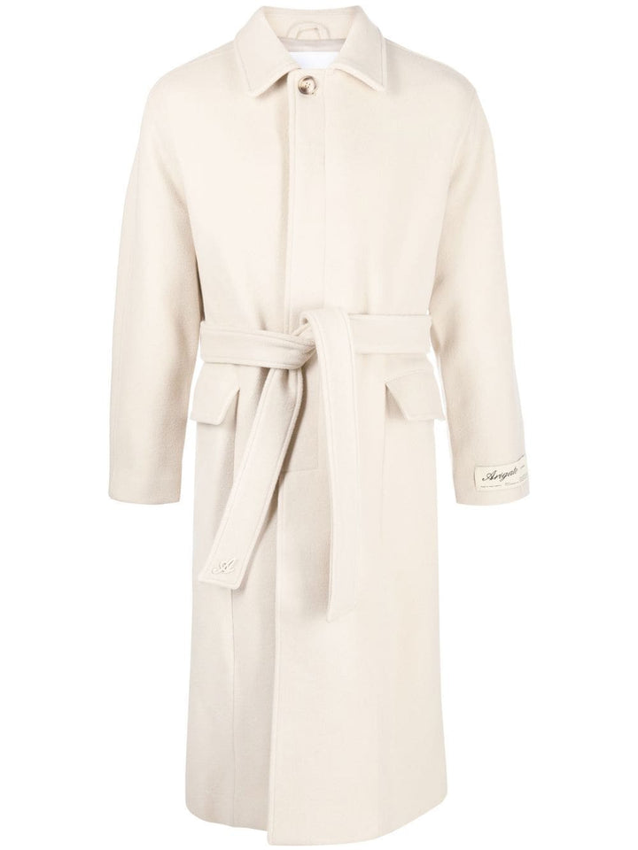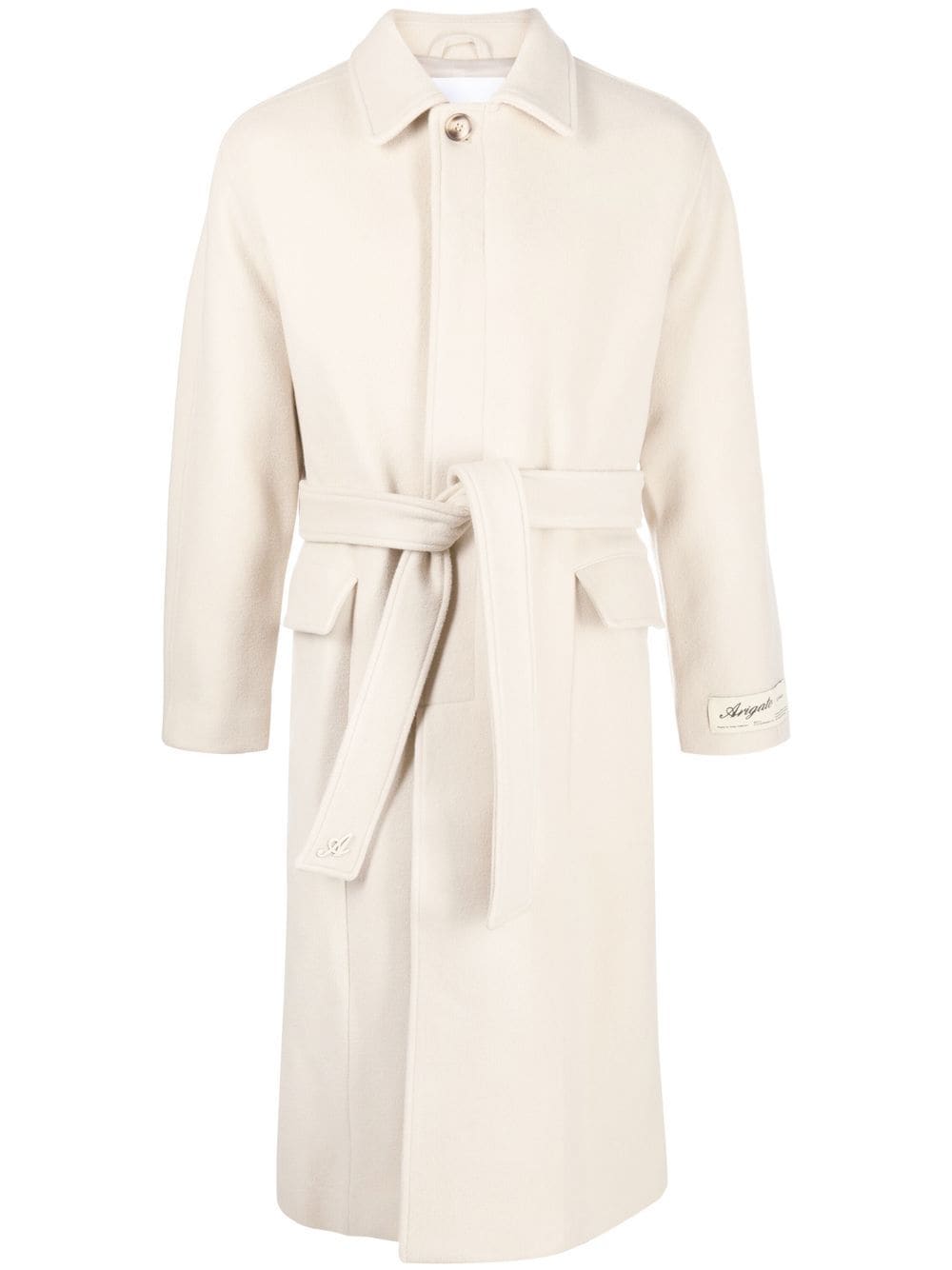 Cappotto beige di Axel Arigato, modello con cintura, colletto classico, maniche lunghe, applicazione sulla manica con logo, chiusura frontale con bottoni, due tasche con pattina, orlo dritto e design lungo.