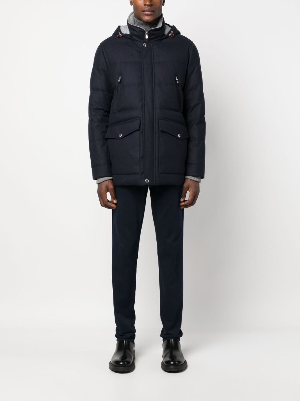 Piumino blu navy Brunello Cucinelli dal design imbottito, con cappuccio, chiusura frontale con zip, due tasche laterali con patta.