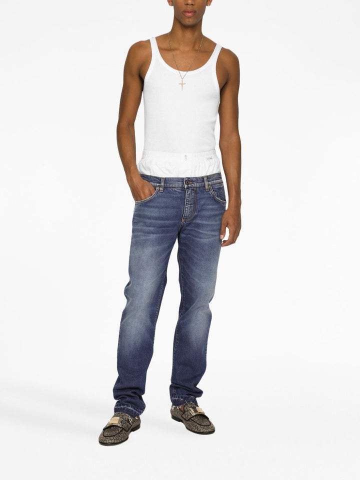 Jeans Dolce & Gabbana blu denim con effetto schiarito, placca con logo color argento, taglio straight, chiusura frontale con bottoni e zip e design classico a cinque tasche.