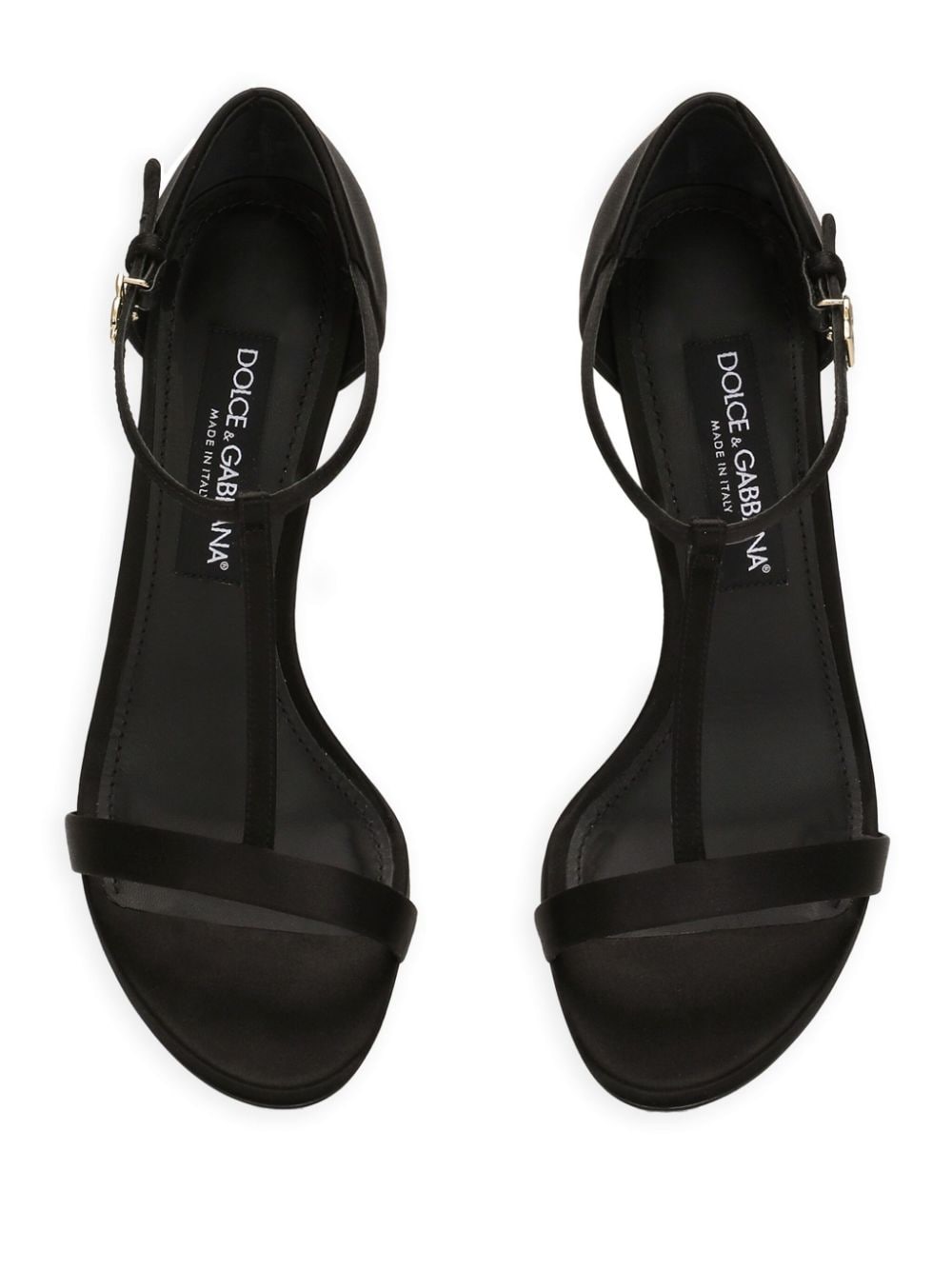Sandali con cinturino a T 105mm di Dolce & Gabbana colore nero, finitura satinatacinturino a T, chiusura alla caviglia con fibbiatacco alto a stiletto 105mm, placca con logopunta smussata aperta, soletta in pelle con logosuola in pelle.Composizione: Viscosa 68%, seta 32%
