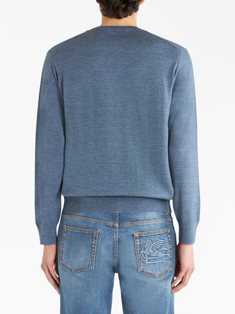 Maglione azzurro polvere di Etro, modello girocollo, manica lunga lana,in maglia sottile, logo Pegaso ricamato sul petto.