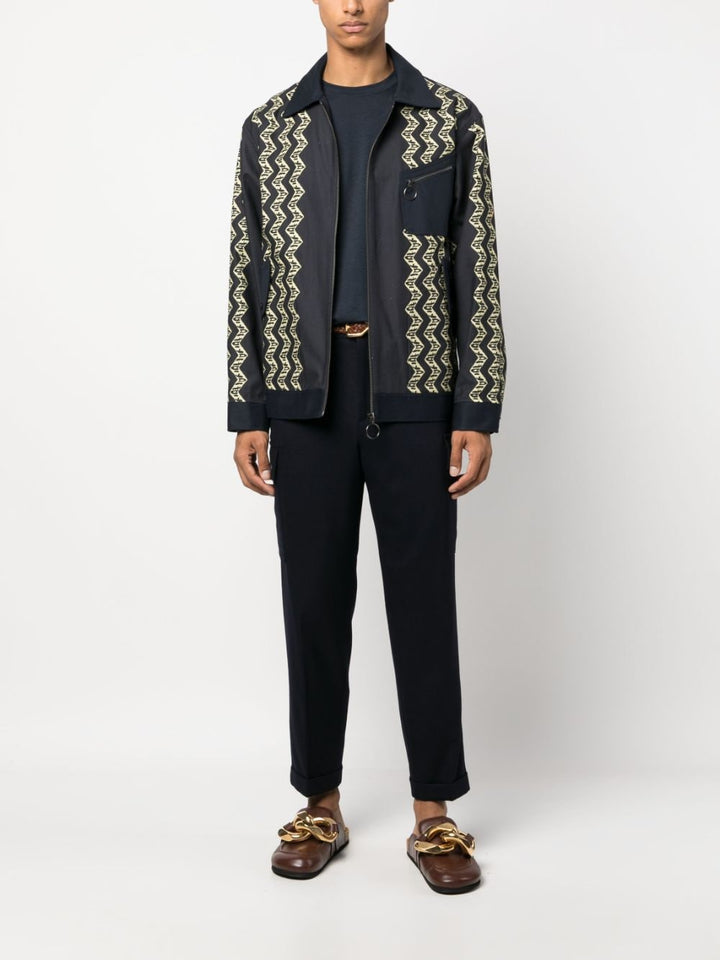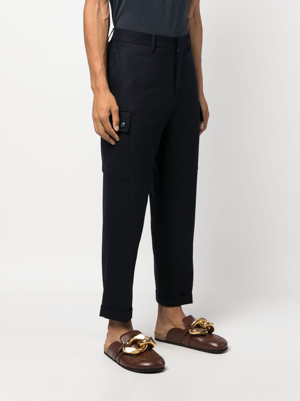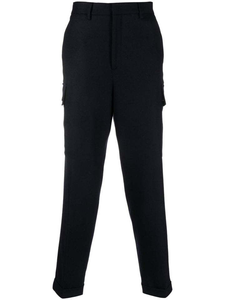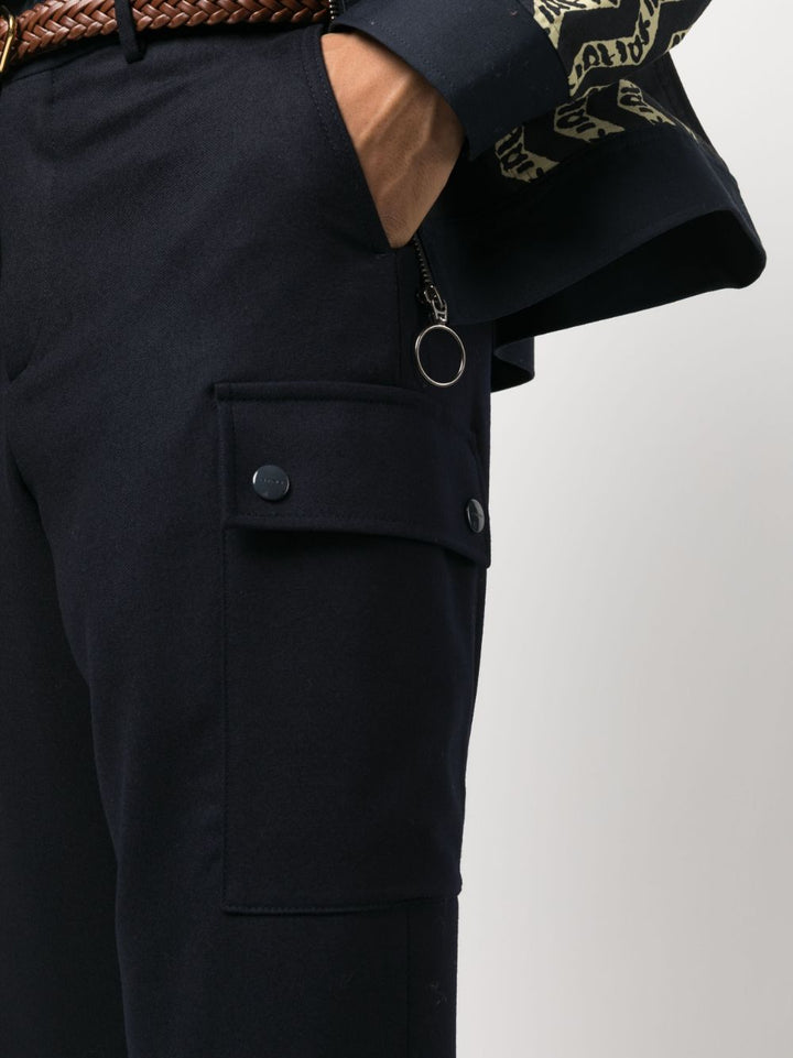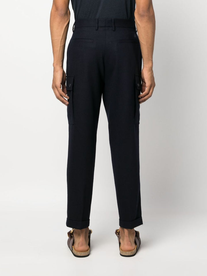 Pantalone Etro in lana blu, modello cargo con tasconi, due tasche laterali e due a filetto sul retro, logo ricamato.