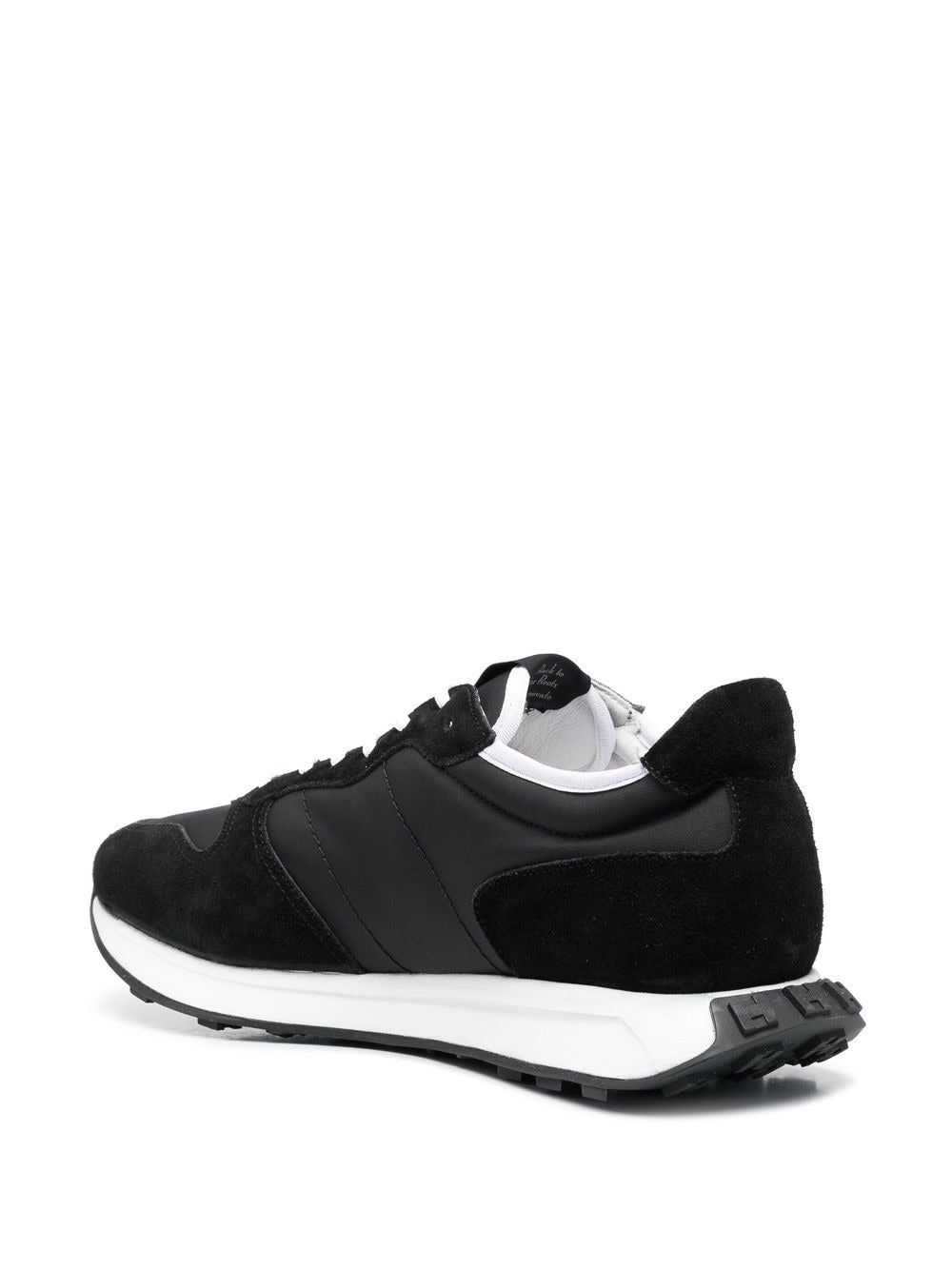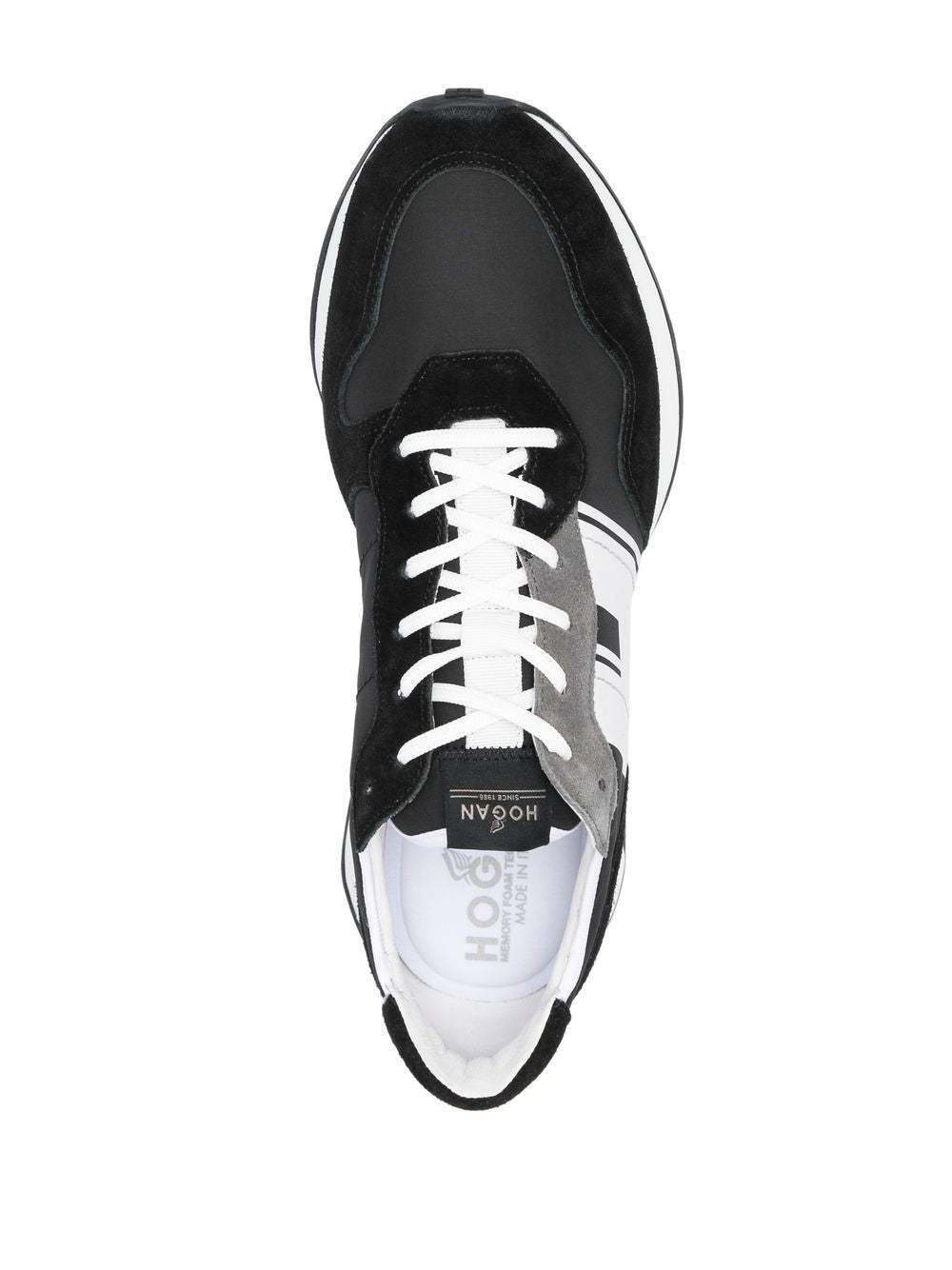 Sneaker nera di Hogan, modello H601in pelle di vitello e tessuto, stampa laterale con logo in contrasto, punta smussata, chiusura frontale con lacci, soletta con logo e suola piatta in gomma.