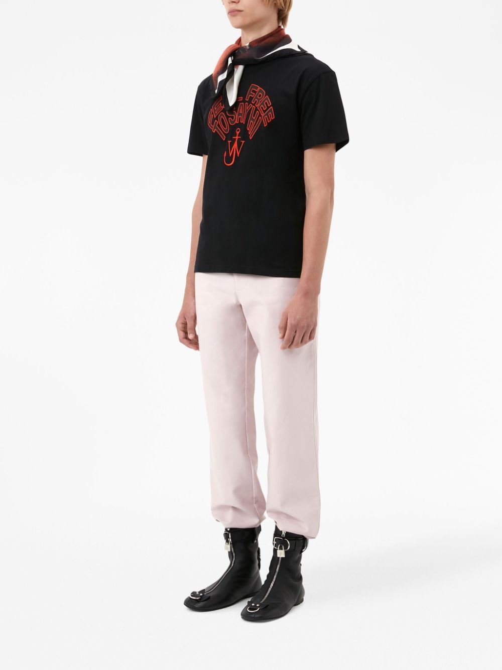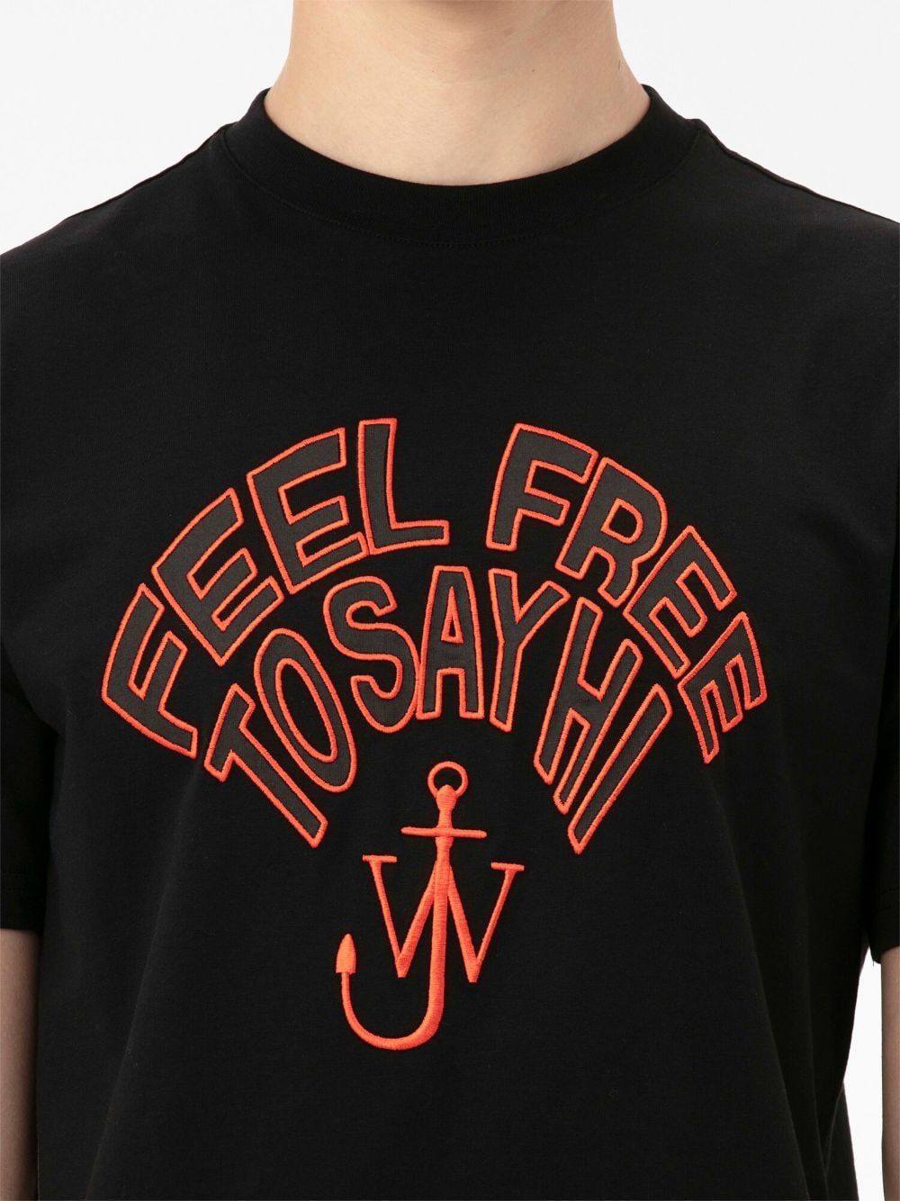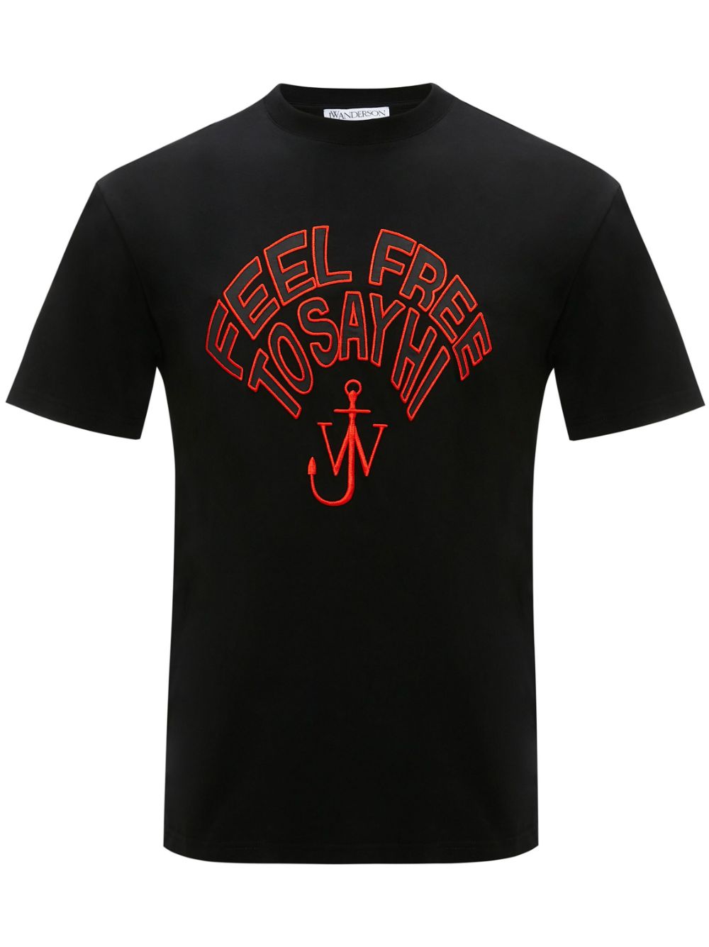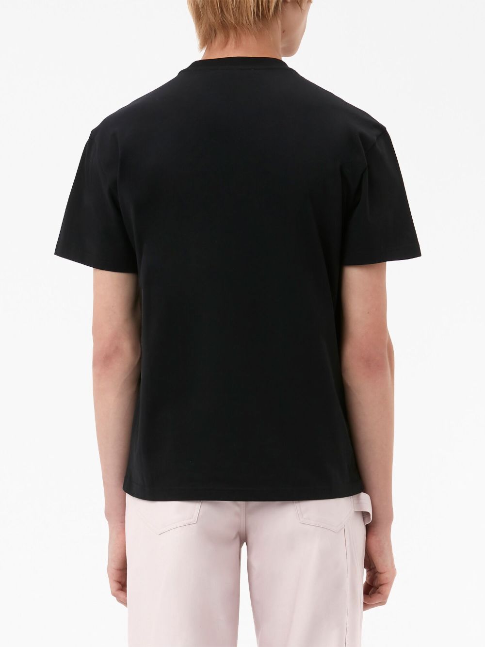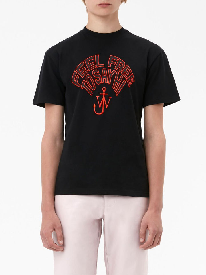 T-shirt JW Anderson nera, modello girocollo, manica corta, con stampa frontale e logo ricamato in rosso.