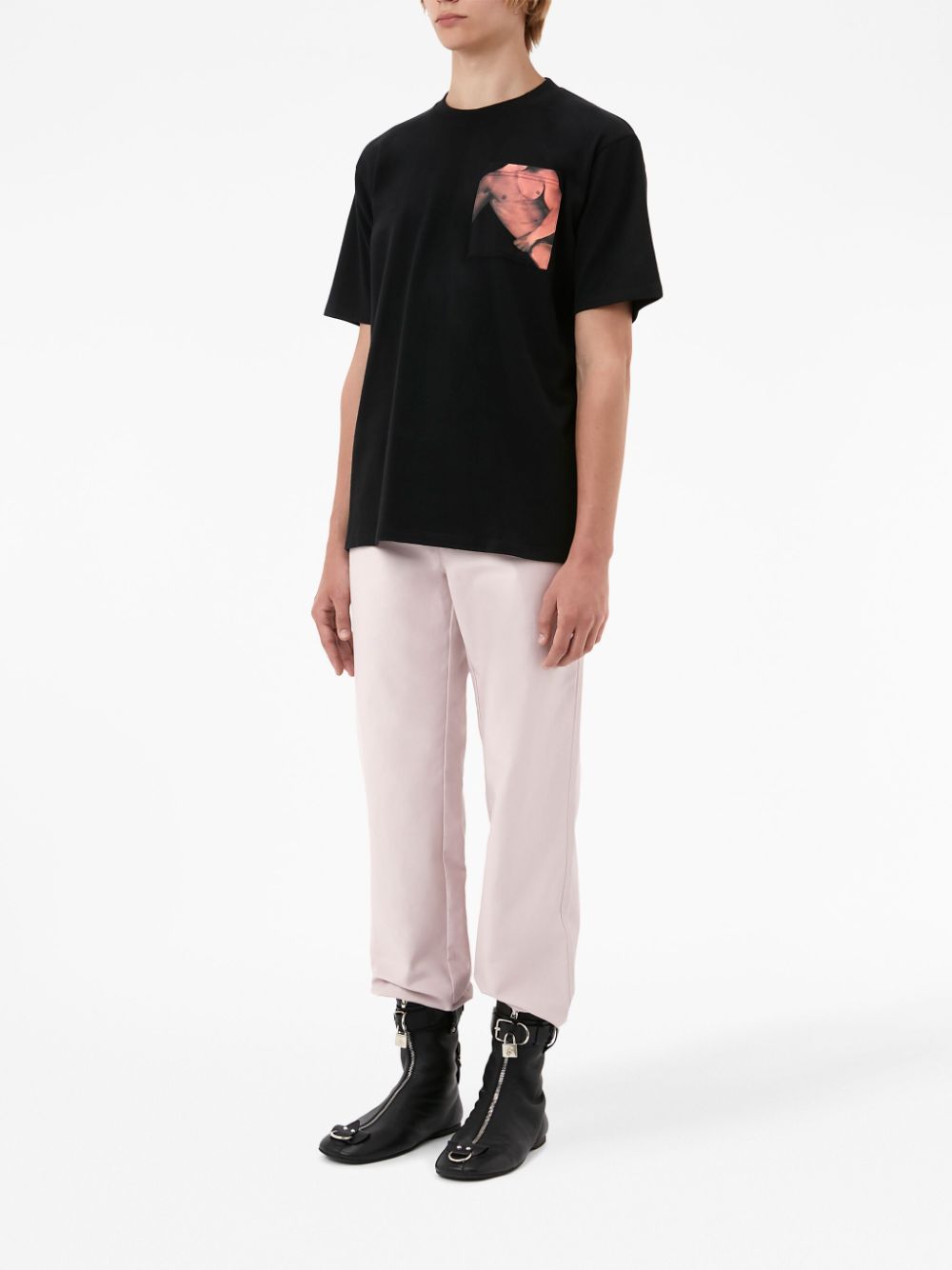 T-shirt JW Anderson nera, modello girocollo, manica corta, con taschino sul petto con stampa.