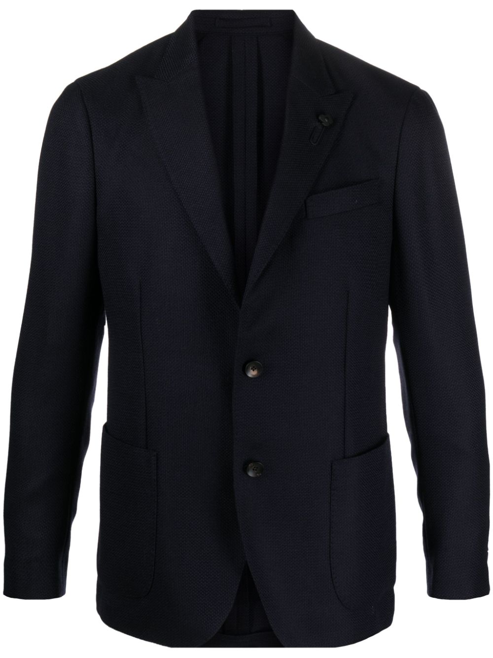Blazer blu Lardini, revers a punta, chiusura frontale con bottoni, tasca a filetto sul petto e due tasche applicate frontali.
