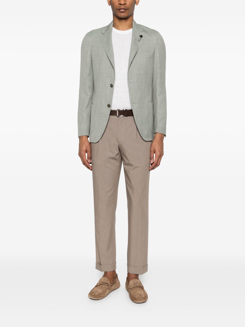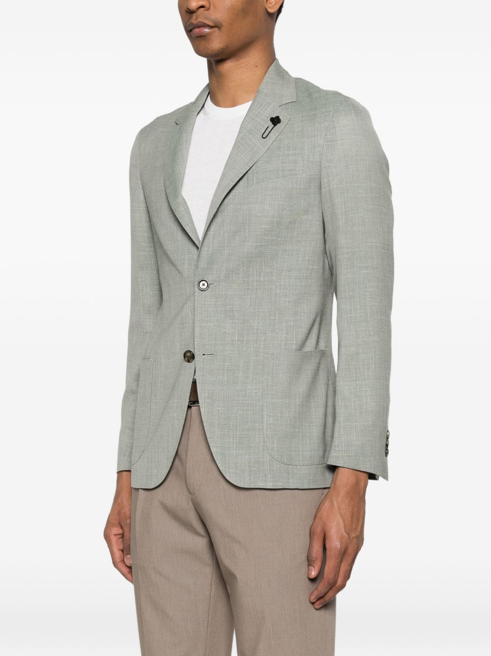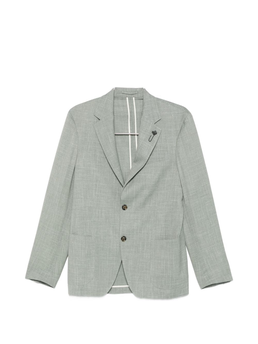 Blazer verde salvia Lardini in lana, seta e lino con rever classici, chiusura con bottoni, tasche frontali applicate e dettaglio spilla.