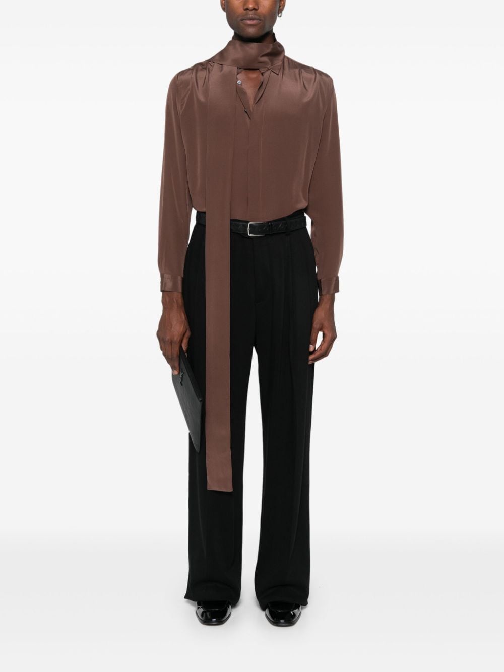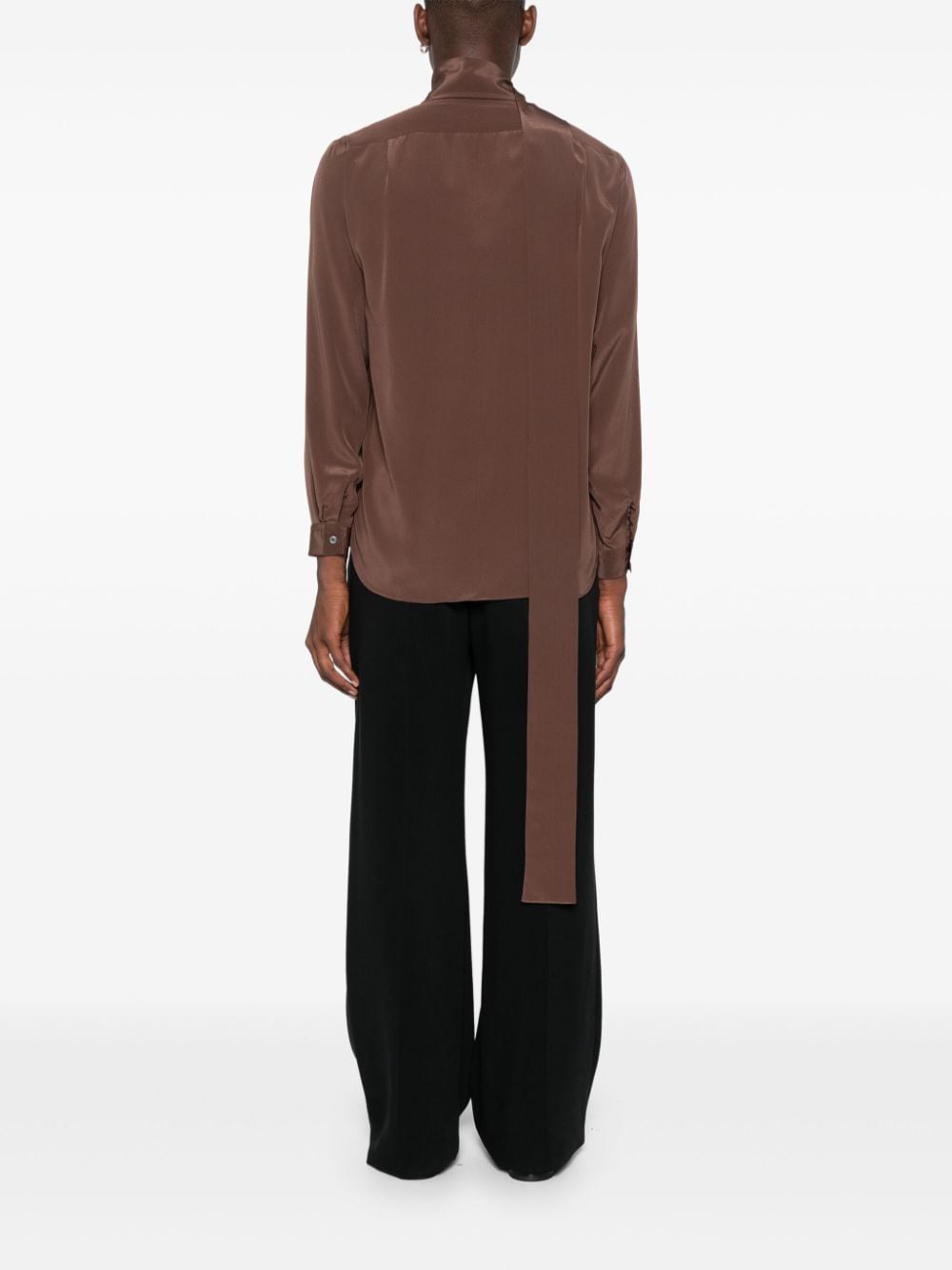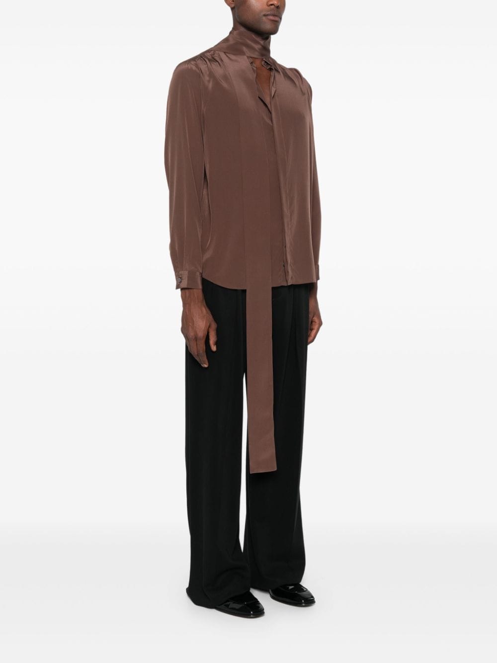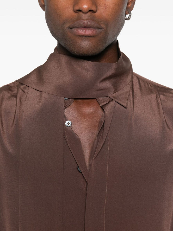 Camicia Lardini marrone, maniche lunghe, chiusura frontale nascosta, bottoni in madreperla, colletto classico, cintura removibile.