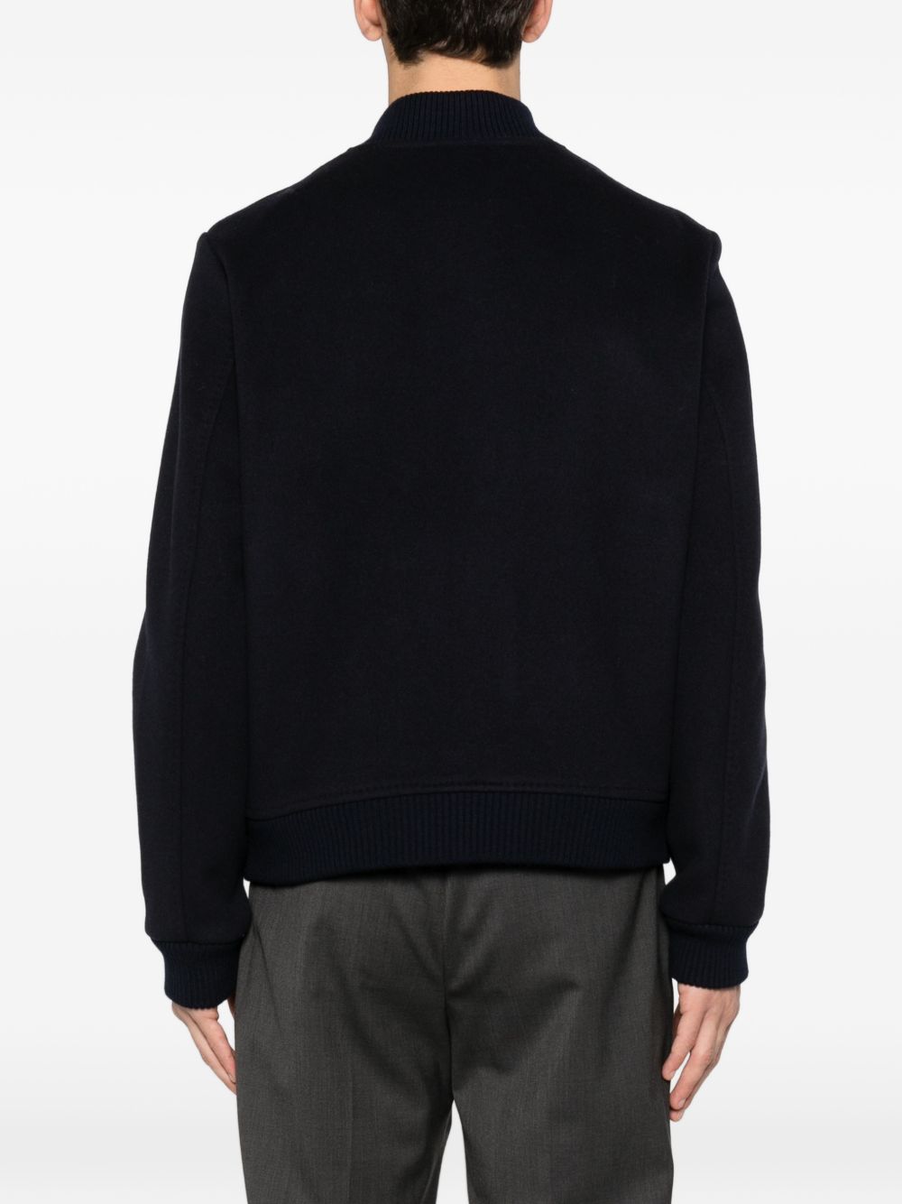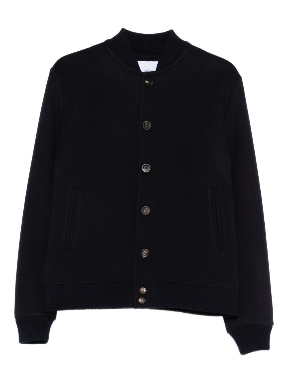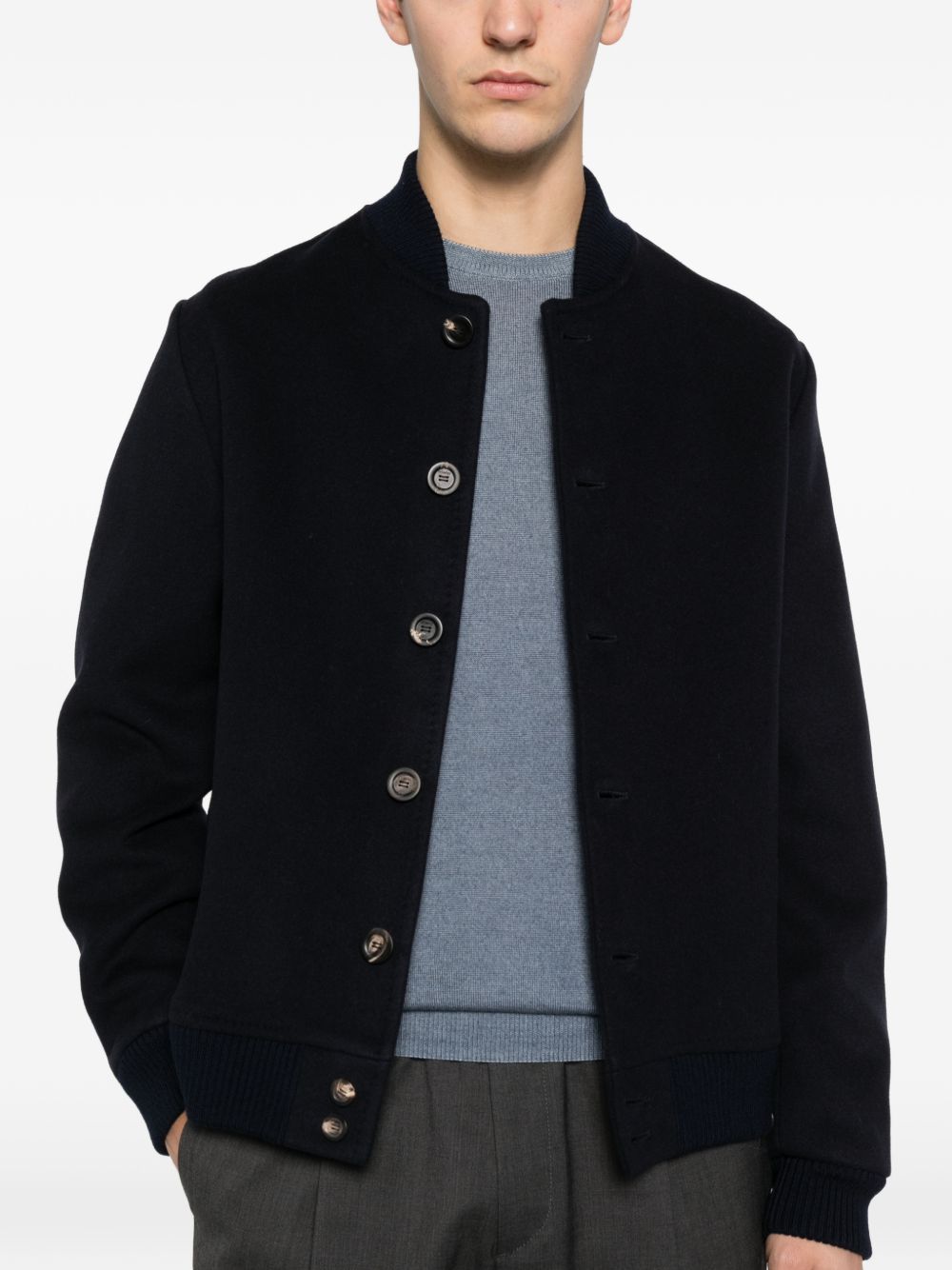 Bomber blu Malo in lana vergine e cashmere con chiusura a bottoni, dettagli a coste, tasche a filetto e maniche lunghe.