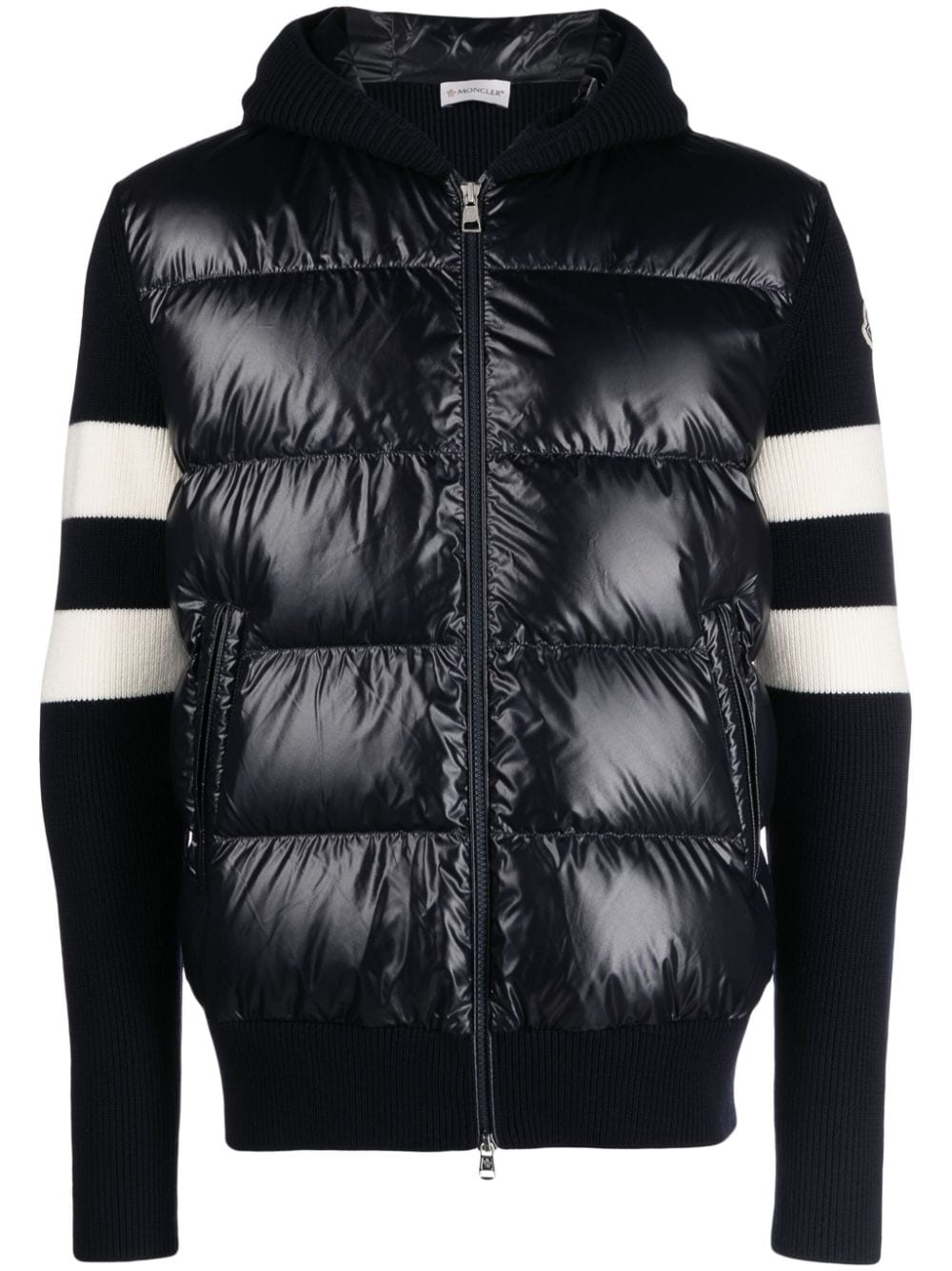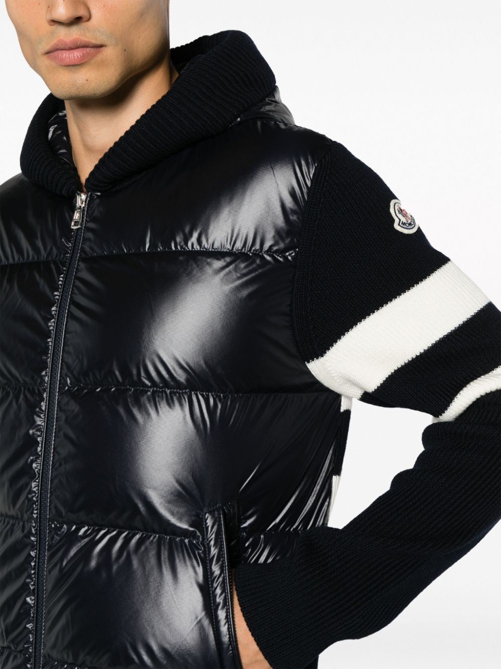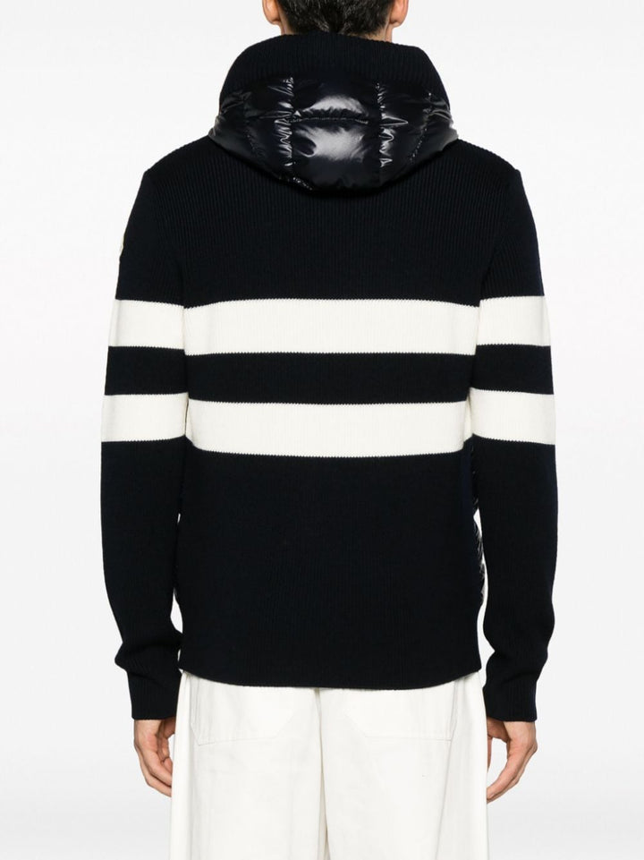 Piumino Moncler in maglia blu, con pannelli anteriori imbottiti in piuma e cappuccio, fascia orizzontale bianca in contrasto, chiusura con zip a doppio cursore, tasche laterali e logopatch sulla manica.
