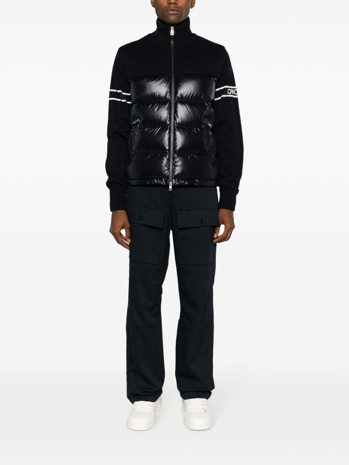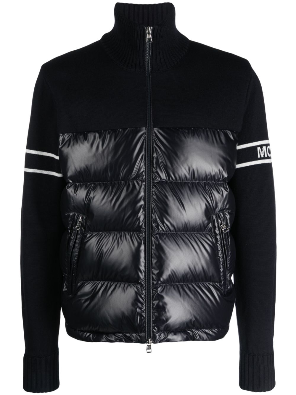 Cardigan Moncler blu, imbottito in piuma, con maniche in maglia, collo alto, chiusura frontale con zip doppio cursore, tasche laterali.