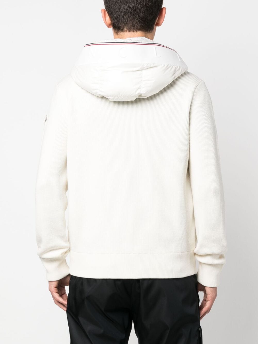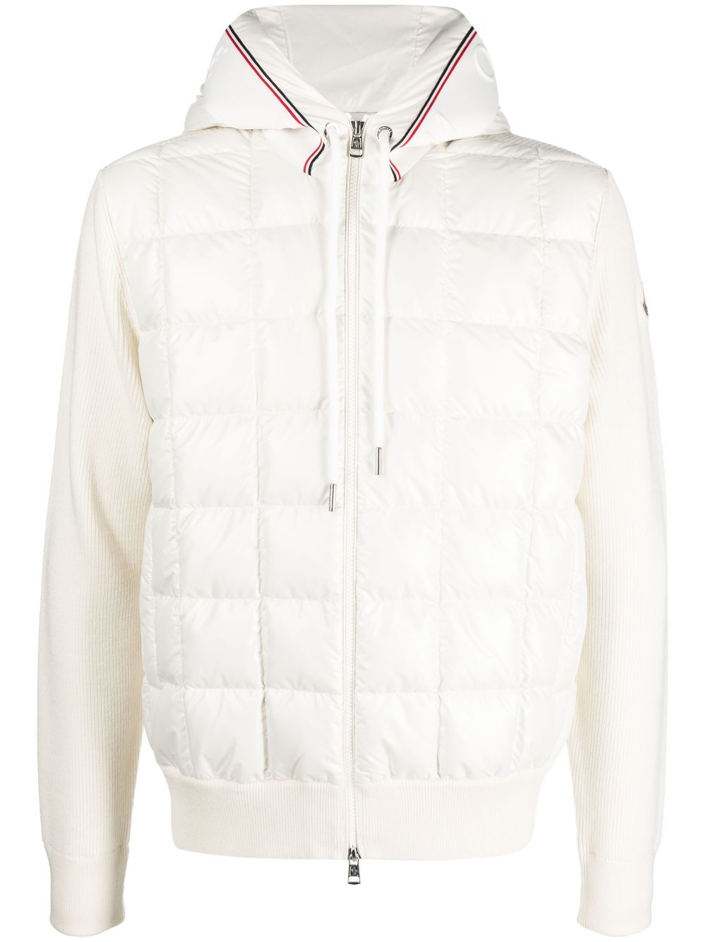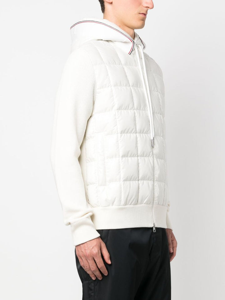 Cardigan Moncler bianco con imbottitura in piuma d'oca, cappuccio con coulisse, chiusura frontale con zip a doppio cursore, maniche e retro in maglia, due tasche laterali con bottone, stampa con logo sul cappuccio.