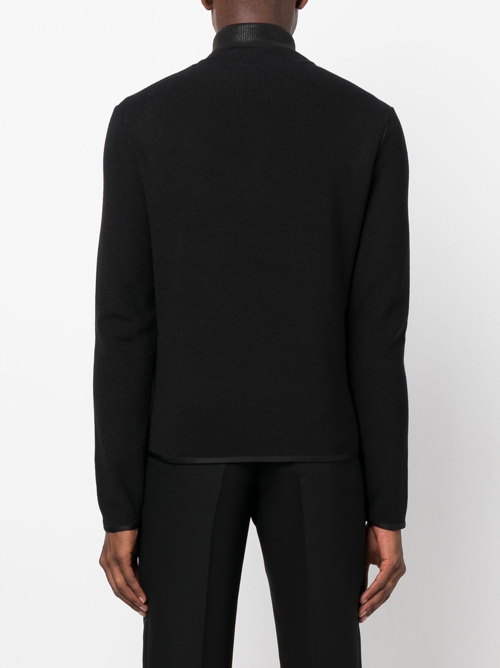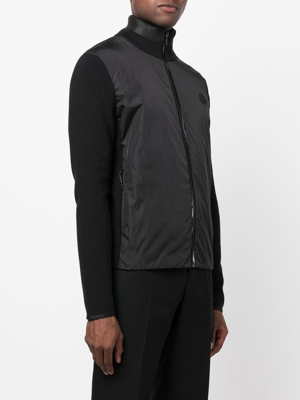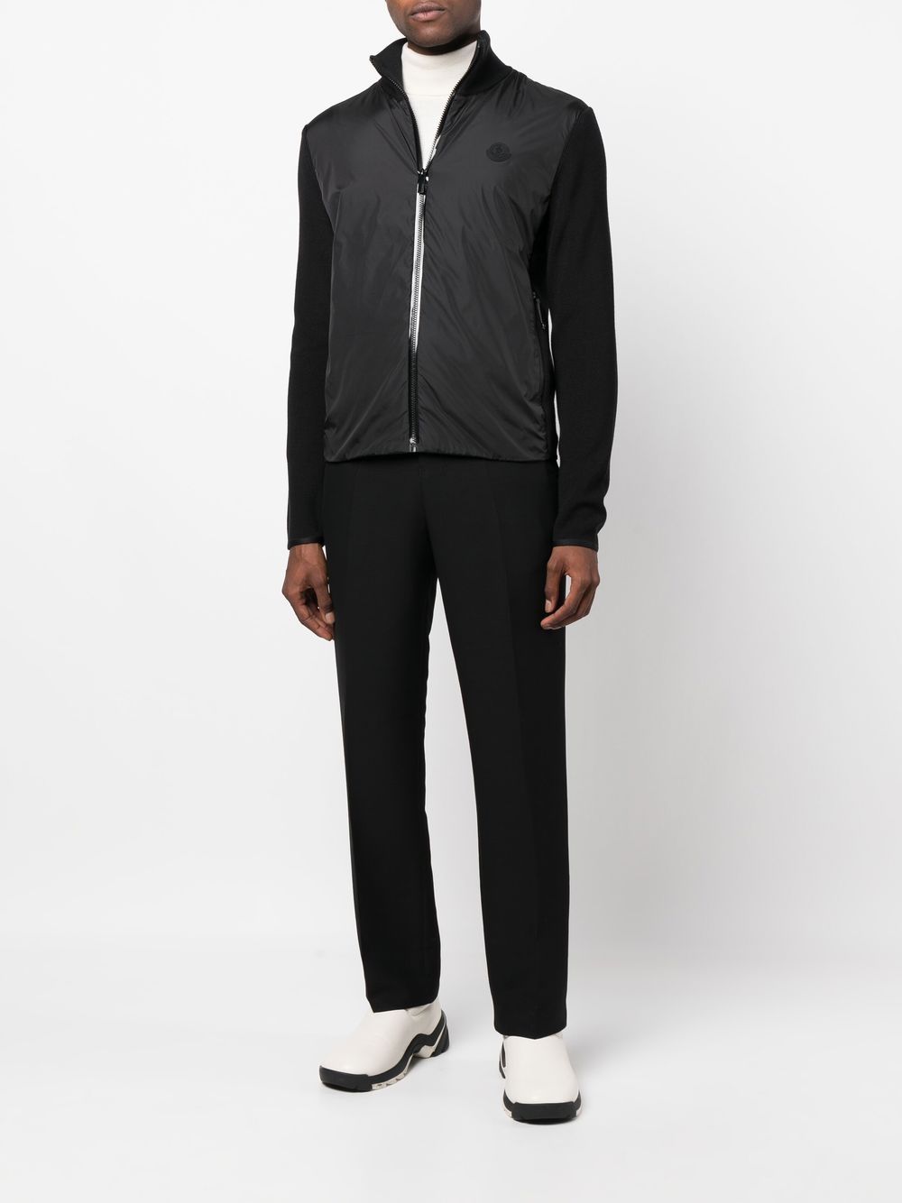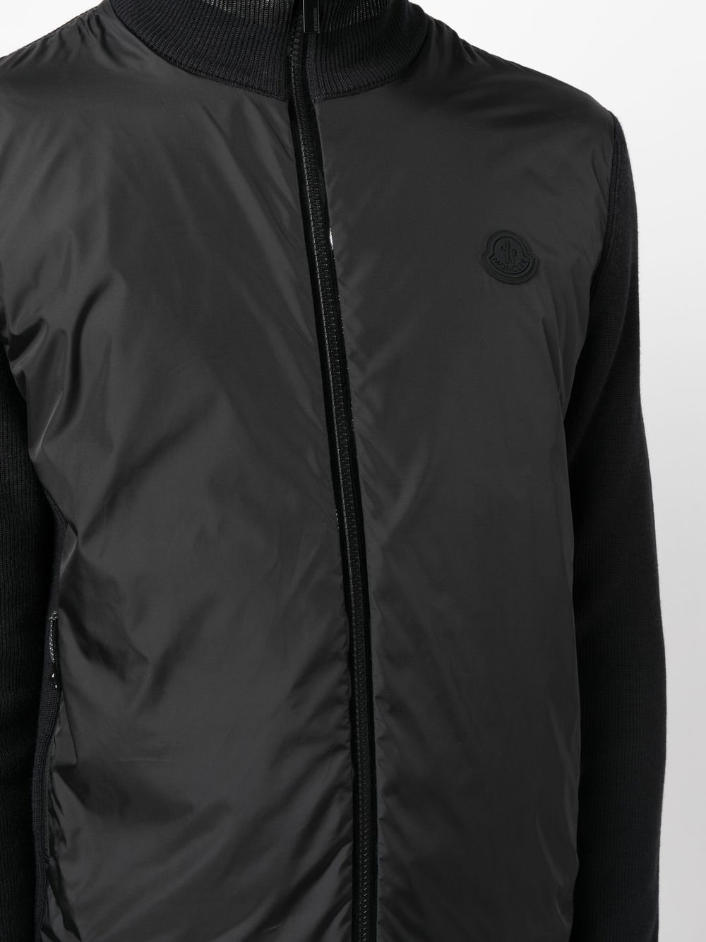 Cardigan Moncler Grenoble con maniche e retro in maglia, logopatch sul petto, maniche lunghe, collo alto, due tasche con inserti e chiusura frontale con zip.