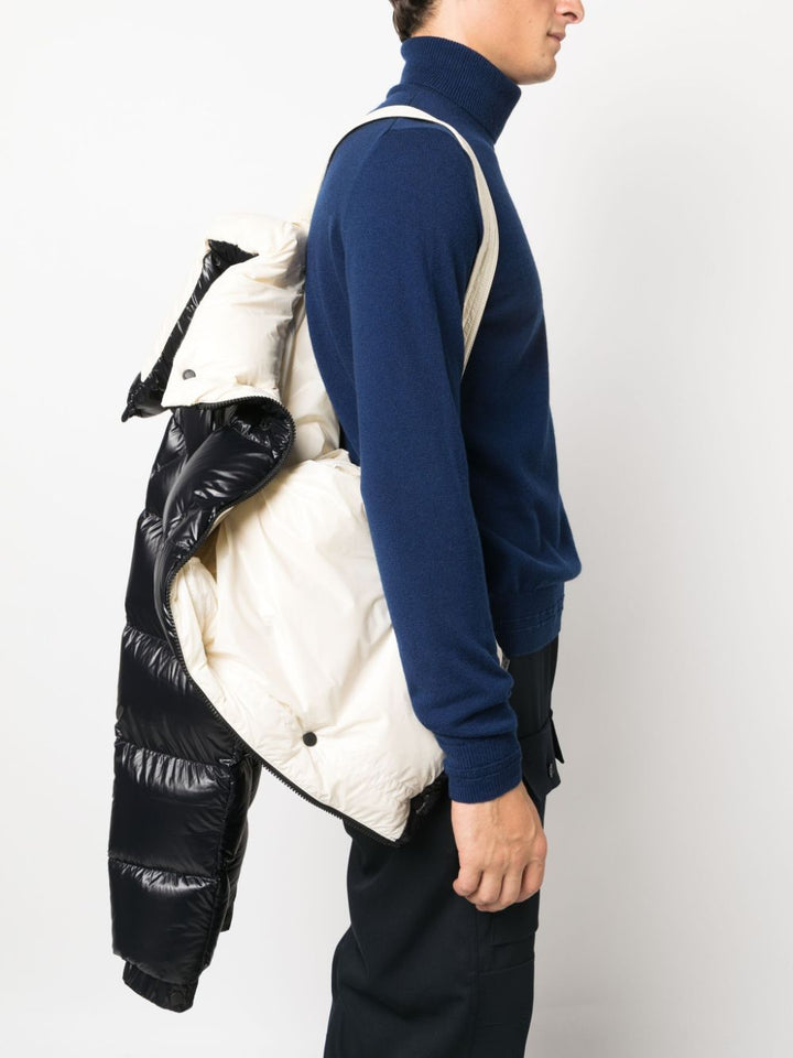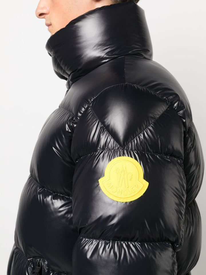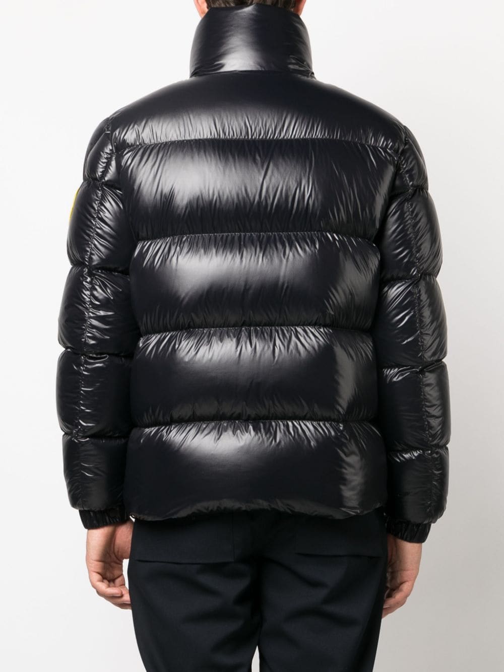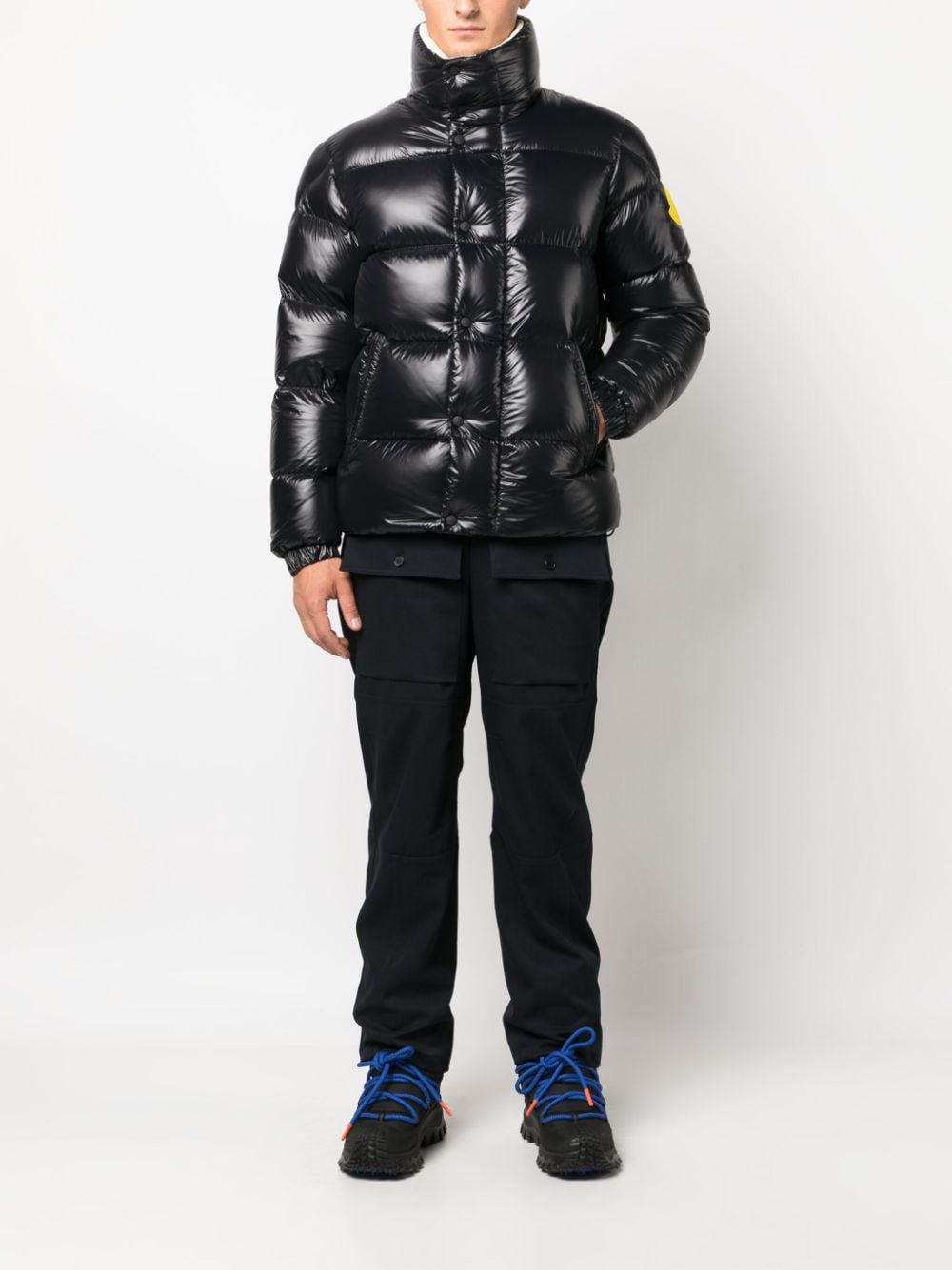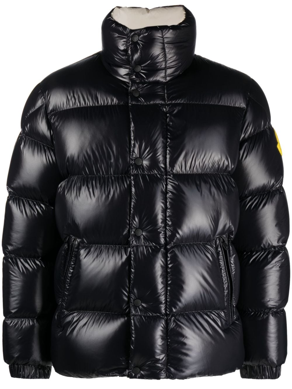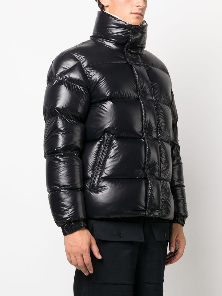 Piumino Moncler modello dervox blu, design imbottito, applicazione sulla manica con logo, collo alto, chiusura frontale con bottoni a pressione, maniche lunghe, due tasche laterali con zip e orlo dritto.