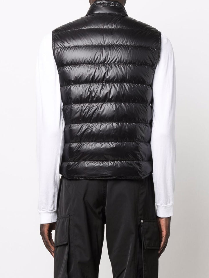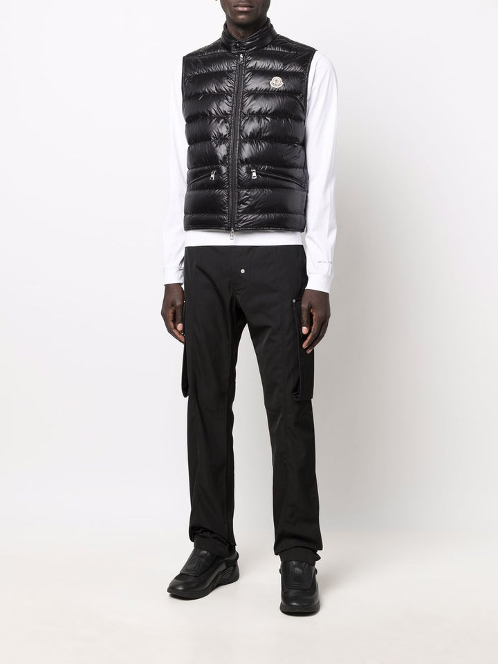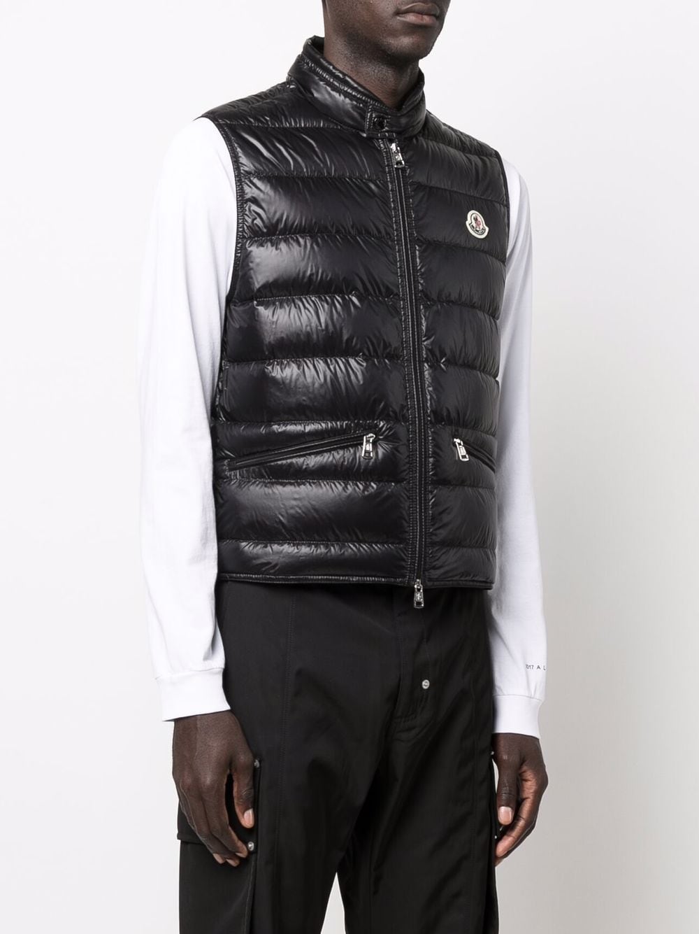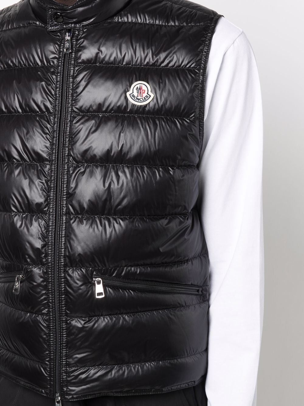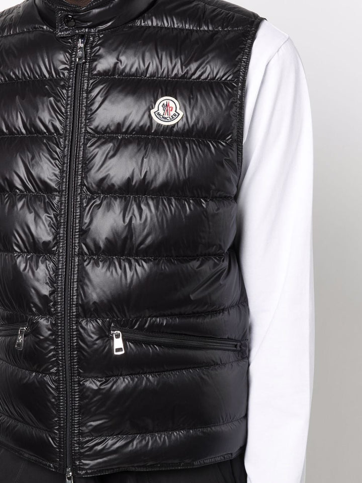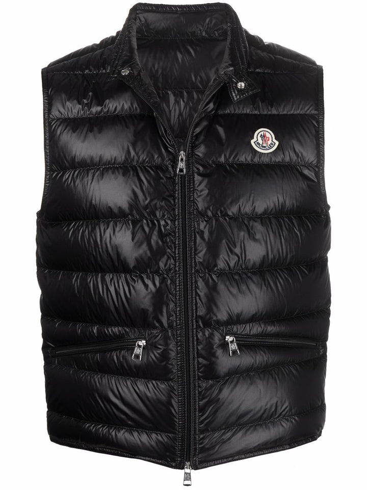 Smanicato nero con logo di Moncler. Allaccitura full zip, tasche frontali con chiusura orizzontale a cerniera, cuciture a vista. Ideale per le giornate dal tempo incerto.
